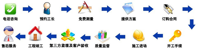 電話咨詢→預(yù)約工長(zhǎng)→上門(mén)量房→溝通裝修方案→出報(bào)價(jià)→簽訂裝修合同→辦理開(kāi)工手續(xù)→工人進(jìn)場(chǎng)→監(jiān)理全程跟蹤→第三方監(jiān)理及客戶驗(yàn)收