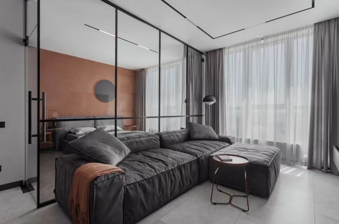 63平米一室輕工業(yè)風小公寓裝修案例,設計師以陶色和深灰色做基調(diào),再用不同質(zhì)元素進行組合,打造優(yōu)雅簡約又不失獨特氣質(zhì)的一居室小宅。