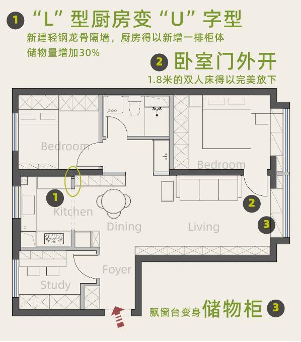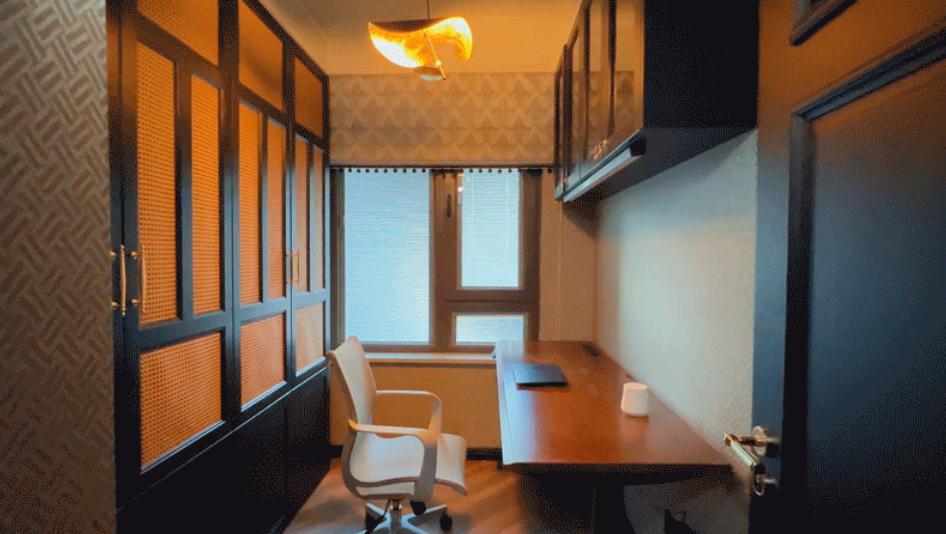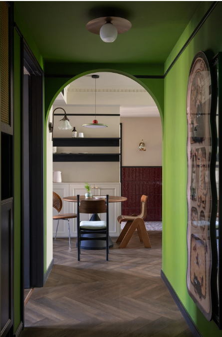 這是一套套內(nèi)69平米的精裝房交付的三居室,屋主是一對性格開朗的小夫妻,原裝風(fēng)格不符合屋主喜好,于是進(jìn)行了全屋改造,拆除地面,水電局改,吊頂,造型,刷漆...最終呈現(xiàn)了一場復(fù)古南洋風(fēng)格的視覺盛宴。 一進(jìn)門,就給這個(gè)家定了基調(diào):復(fù)古與質(zhì)感。復(fù)古的綠色+拱形門洞,玄關(guān)仿佛變身成為連接外界與室內(nèi)的時(shí)空隧道,氛圍感十足! 餐廳選擇使用靈活的圓形餐桌,從進(jìn)門,視覺上就不會(huì)顯得擁堵。直徑90公分的餐桌,小巧玲瓏,平時(shí)靠著餐邊柜,二人就餐正好。 推拉門居中并換成了拱形玻璃門(水波紋)的樣式,空間利用率大大提升。 客餐廳之間的門洞通往衛(wèi)生間干區(qū):洗手臺(tái)。這里進(jìn)行了徹底的翻新改造。 半高的磚墻是由瓦工師傅一片一片瓷磚粘貼上去的,每一片磚都有自己的紋理和變化,這份精致感是任何大面積材料所無法給予的。 客餐廳的所有墻面頂部,都有一條貫穿的黑色木質(zhì)線條,給空間提氣。 客廳通過硬裝的局部改造,將沙發(fā)與電視墻的位置進(jìn)行對調(diào),更加符合屋主的生活習(xí)慣。 窗臺(tái)之上也做了儲(chǔ)物柜,上翻蓋板,頂部與窗戶底沿取齊,落地高度為60公分。