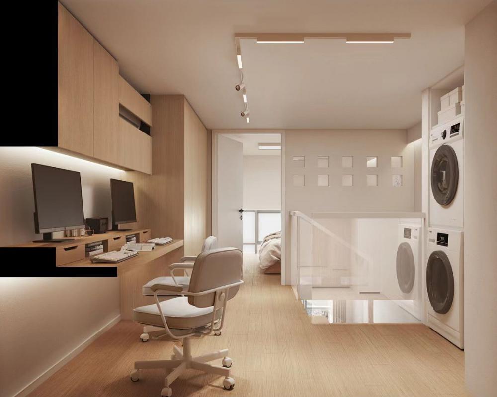 公寓分為上下兩層結(jié)構(gòu),一層為公共活動區(qū)域,設(shè)有客餐廳和廚衛(wèi)功能,二層屬于姑娘們的私人空間,休息區(qū)和辦公區(qū)互不干擾。全屋功能齊全,麻雀雖小,五臟俱全。