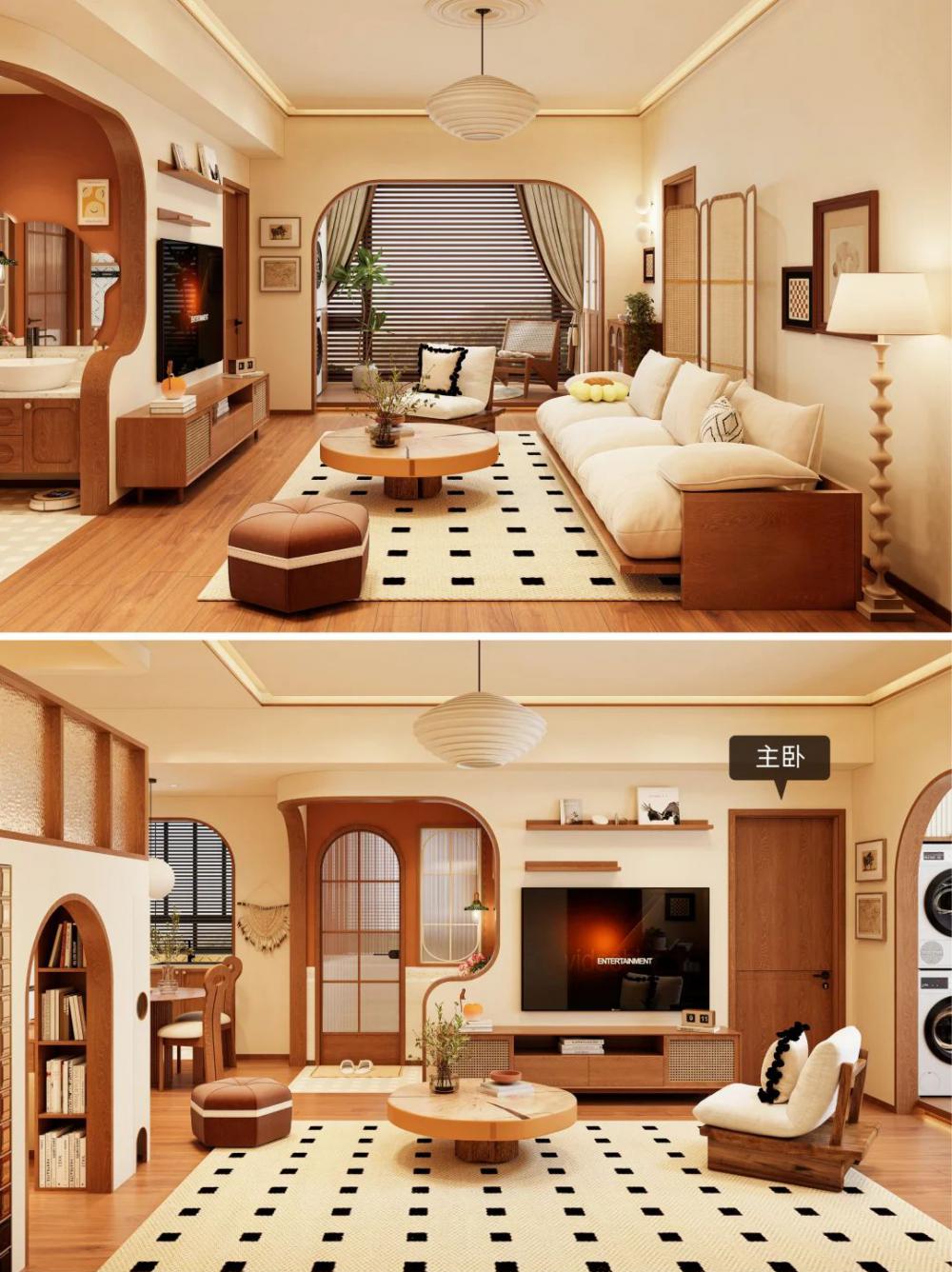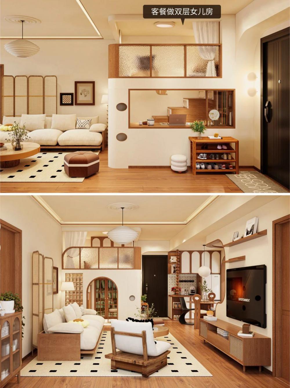 簡介: 面積66平,原木奶油復(fù)古風(fēng) - 業(yè)主為了女兒上學(xué)便利買了這套 僅兩室的二手房,三代人住的很不舒服?? 靠我發(fā)揮改造,業(yè)主直接輕松坐擁?? ?雙層女兒房 ?開放廚房 ?干濕分離衛(wèi)生間 68㎡老破小爆改?原木奶油復(fù)古風(fēng)三居 業(yè)主說:找你設(shè)計(jì)小戶型,合作太愉快啦?? - ??屋主日志 三代5人,夫妻倆+父母+上小學(xué)的女兒?? 女兒想要專屬的睡眠和學(xué)習(xí)區(qū)域?? 解決廚房昏暗以及與餐廳距離遠(yuǎn)的問題 改善早八衛(wèi)生間多人使用時(shí)的擁擠狀況?? - ??雙層女兒房 客餐做雙層布局,空間利用率翻兩倍?? 睡眠區(qū)放上層,圍欄環(huán)繞睡覺隨意翻滾?? 下層打造書柜+書桌,獨(dú)立小書房顯現(xiàn)? 側(cè)面開扇窗,客廳都跟著放大20㎡?? - ??開放廚房 拆除廚房隔墻+內(nèi)推,打造拱形門洞?? 改成開放式設(shè)計(jì),昏暗壓抑一鍵消除?? 外部放置餐桌,餐廚0距離互動感強(qiáng)? - 干濕分離衛(wèi)生間 轉(zhuǎn)移主臥門洞,將洗漱臺外移走廊?? 底部懸空,方便掃地機(jī)器人清潔?? 濕區(qū)做玻璃隔斷,各功能“互不干擾”?? |