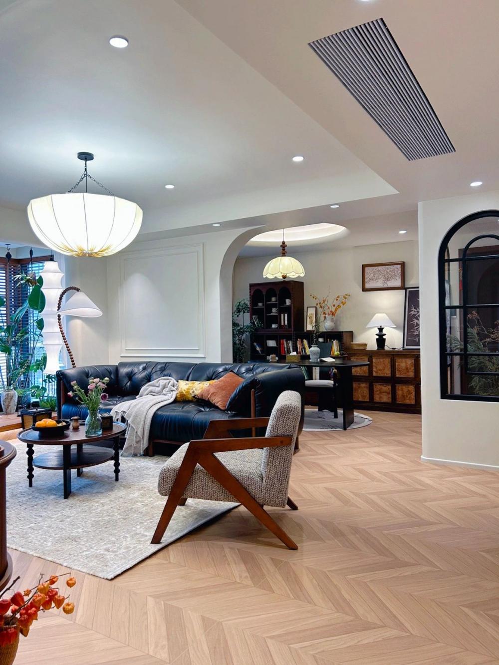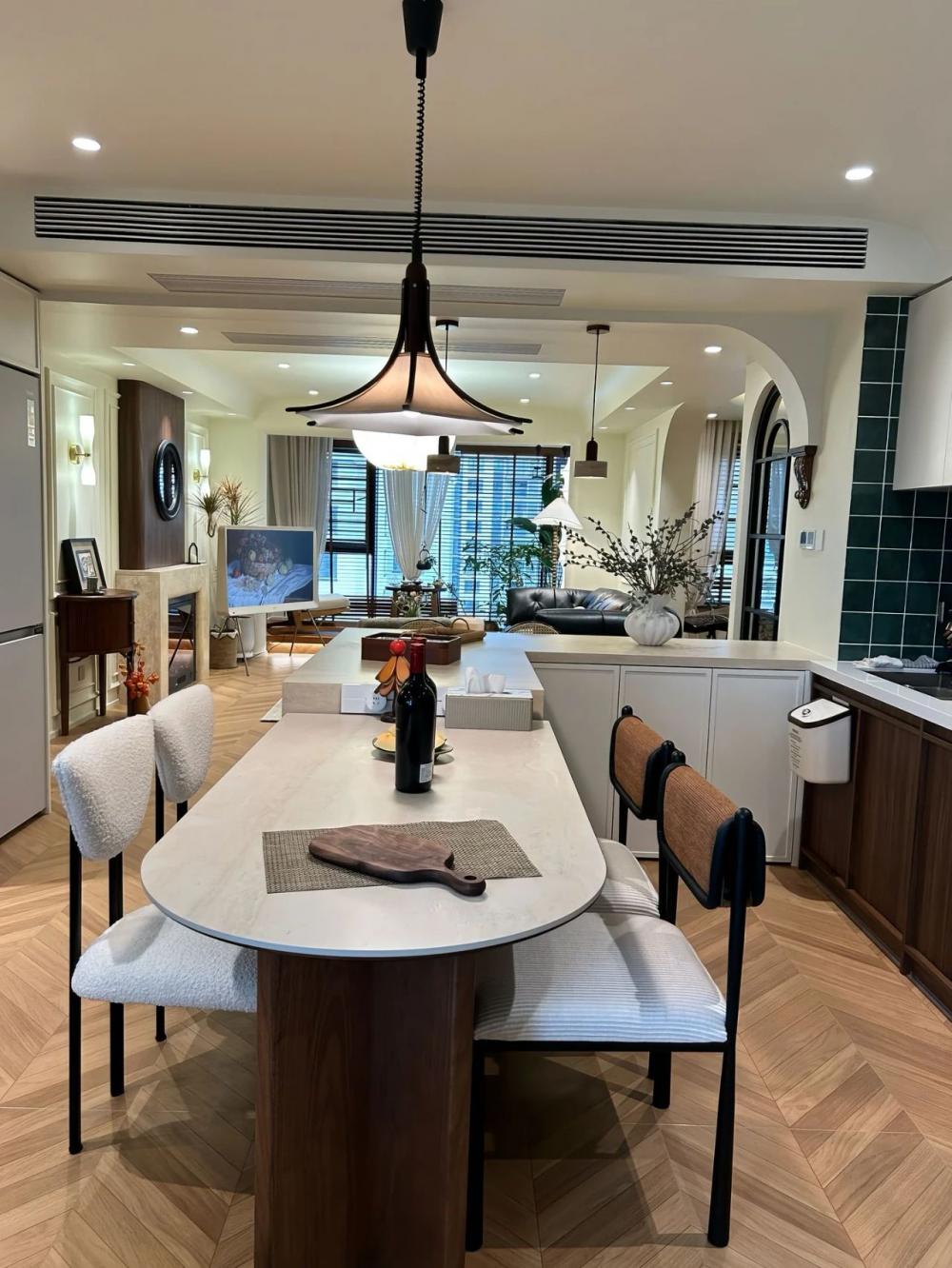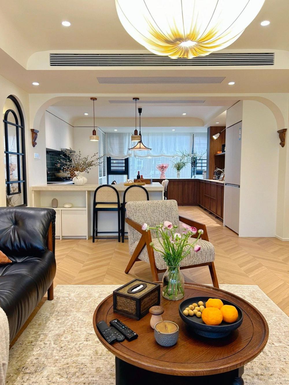 ?在這處建筑面積128平,套內107平的空間里,一場別出心裁的改造悄然上演。原本的四房格局被巧妙改成三房,打造出半開放式書房,為空間注入靈動與自由。 ?全開放式廚房與餐廳、客廳融會貫通,4.2米的開闊開間,賦予了小家大平層般的氣場。踏入家門,溫暖而富有質感的氛圍撲面而來。 ?全屋通鋪60×120淺胡桃色人字拼木紋磚,在提升空間質感的同時,也為家增添了幾分復古韻味。墻面通刷乳膠漆,并輔以精致的石膏線,法式浪漫呼之欲出。復古主燈、壁燈、落地燈相互呼應,巧妙營造出富有層次感的光影。拱形門搭配超白玻璃,不僅提升了空間的通透感,更帶來了一絲夢幻色彩。 ?客廳一側,電子壁爐散發(fā)著溫暖的氣息,復古半圓手風琴柜與55寸移動電視和諧共處。另一側,儒黛家的黑色沙發(fā)成為視覺焦點,展現(xiàn)出獨特的品味。 ?陽臺抬高10公分打造出一方木質地臺,地臺上,是一張簡約的茶桌,桌上精致的茶具擺放整齊。復古茶壺通過頂部特制的固定裝置被穩(wěn)穩(wěn)地懸空吊起,為整個空間增添了一份獨特的藝術感。當陽光透過窗戶灑在陽臺上,光影在茶具上跳躍,營造出寧靜而美好的氛圍。 ?開放式廚房中,木板定制的島臺柜體搭配巖板臺面,實用又美觀。骨骼線設計的柜子,為廚房營造出拉滿的氛圍感。石膏板吊頂涂刷了防水防油防霉乳膠漆,實用又美觀。 ?這個打造的家,巧妙融合了5分法式復古、3分中古、1分度假、1分侘寂風格。每一個角落,都散發(fā)著溫馨的氣息,讓人在回家的瞬間,就能感受到滿滿的幸福。