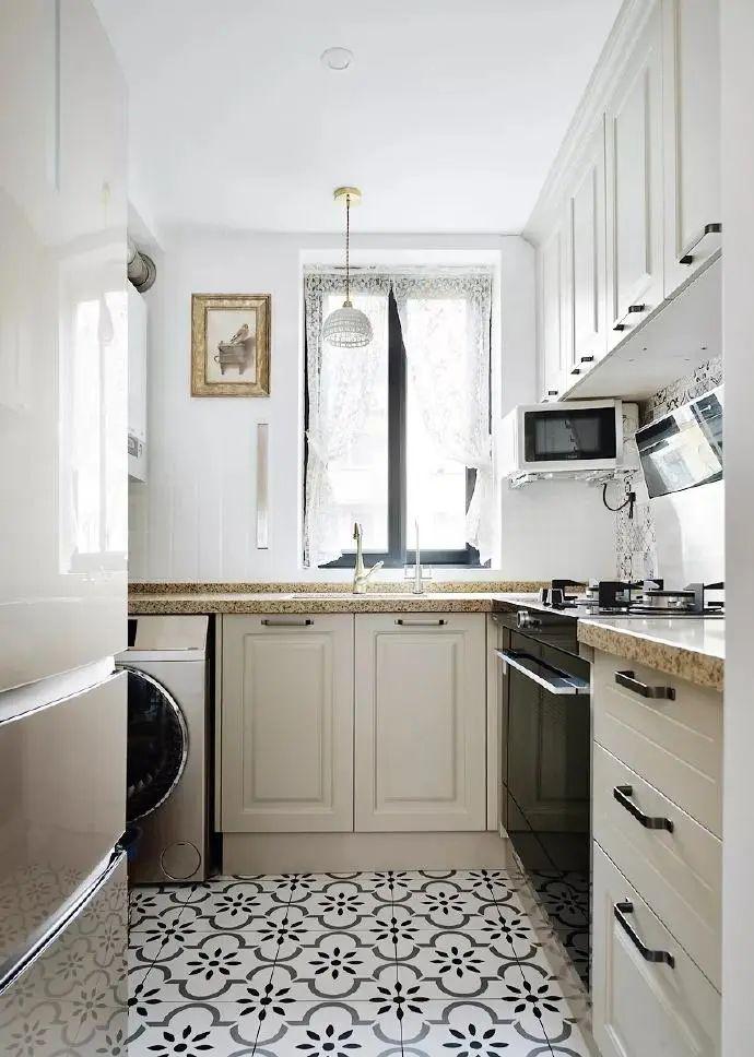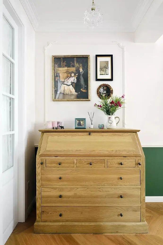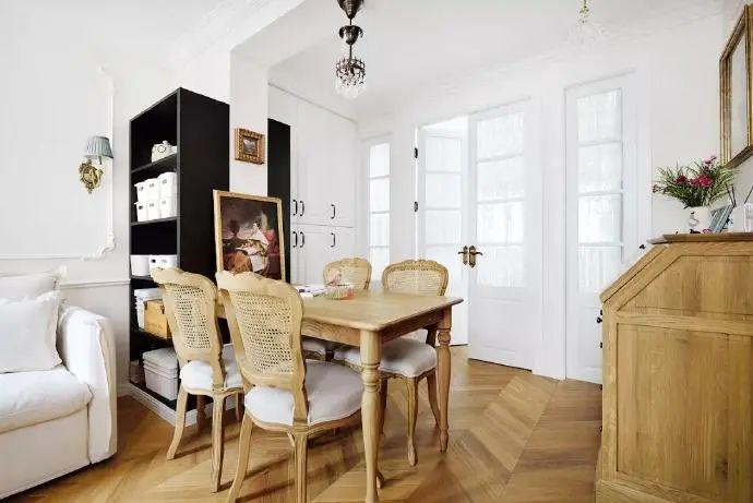 今天給大家分享一套39平米的小戶(hù)型,裝修上選擇了輕奢法式風(fēng),這套案例在華麗法式風(fēng)的基礎(chǔ)之上,化繁為簡(jiǎn),拋去復(fù)雜的硬裝造型,運(yùn)用柔美的線(xiàn)條及大量的實(shí)木家具和精致的軟裝,打造出一個(gè)優(yōu)雅有氣質(zhì)還不失高級(jí)大方家的家,一進(jìn)屋就有被迷住的感覺(jué),效果很漂亮,讓人過(guò)目不忘,給大家曬曬。 黑色入戶(hù)大門(mén)上若隱若現(xiàn)的金色邊角線(xiàn)條,顯得高級(jí)又復(fù)古,地上鋪了魚(yú)骨拼木地板,一直延伸到客廳里面,時(shí)尚中帶著些許古典的氣質(zhì)。白色和墨綠色拼接的墻面,加強(qiáng)空間層次感,再用石膏線(xiàn)勾勒出造型,漂亮極了,一下子就將人的視線(xiàn)重點(diǎn)拉到了墻面上,以至于一進(jìn)屋就被迷住了。 客廳大量留白,加上不吊頂設(shè)計(jì),讓空間更顯開(kāi)闊、明亮,沙發(fā)墻同樣用石膏走了一圈線(xiàn)條,墻上裝了兩盞藍(lán)色壁燈,看起來(lái)細(xì)膩而柔美。 由于客廳面積本就不大,所以中間沒(méi)有擺放茶幾,用一個(gè)小小的邊幾做了替代,就可以留出更多的活動(dòng)空間。 廚房在客廳的左手邊,沒(méi)有任何門(mén)做隔斷,算是半開(kāi)放式吧,里面有窗戶(hù),所以不用太擔(dān)心油煙問(wèn)題。白色的墻磚搭配象牙色櫥柜,特別的干凈整潔,櫥柜下面還嵌入了一個(gè)洗衣機(jī),很好地利用了空間,地上鋪黑白經(jīng)典色系花磚,簡(jiǎn)約大氣又方便打理衛(wèi)生。 餐廳緊挨著客廳,充滿(mǎn)法式風(fēng)情的原木餐桌椅,復(fù)古極了,搭配桌子上的裝飾畫(huà),極具藝術(shù)氣息。餐桌前面也就是沙發(fā)旁邊立了一個(gè)黑色展示柜,填補(bǔ)角落的空曠,平時(shí)可以放點(diǎn)書(shū)籍,方便坐在沙發(fā)上閱讀,而餐桌背后也定制了一排白色柜子,增加家里的收納。 這是一個(gè)餐邊柜,造型看起來(lái)很特別吧,非常具有年代感,臺(tái)面上擺放著相框、插花等,很精致,墻上掛了三幅規(guī)格不同的裝飾畫(huà),古典又優(yōu)雅,周?chē)檬嗑€(xiàn)包圍,在透明水晶吊燈的襯托下,法式輕奢感十足。 臥室與其他區(qū)域用了白框玻璃門(mén)隔斷,里面用蕾絲布簾遮擋,輕盈又靈動(dòng),最重要是不影響采光還能保護(hù)隱私。床尾定制了一排灰色衣柜,看起來(lái)非常的時(shí)尚大氣,內(nèi)嵌式的設(shè)計(jì)不占位置。把原本的小陽(yáng)臺(tái)也包進(jìn)了室內(nèi),所以整體空間會(huì)顯得寬敞明亮一些,陽(yáng)臺(tái)一側(cè)同樣打了柜子,可以放一些零碎雜物。 衛(wèi)生間在臥室旁邊,大面積的小白墻磚,讓空間顯得格外的干凈明亮整潔,地上的黑白花磚與廚房一樣,相互呼應(yīng)著,與整體風(fēng)格保持統(tǒng)一。浴室鏡與柜子合二為一,用于收納各種洗漱用品,避免臺(tái)面雜亂,淋浴區(qū)用擋水條和半扇玻璃做了干濕分離,省空間又美觀(guān)。