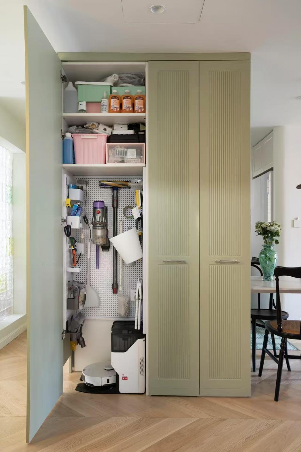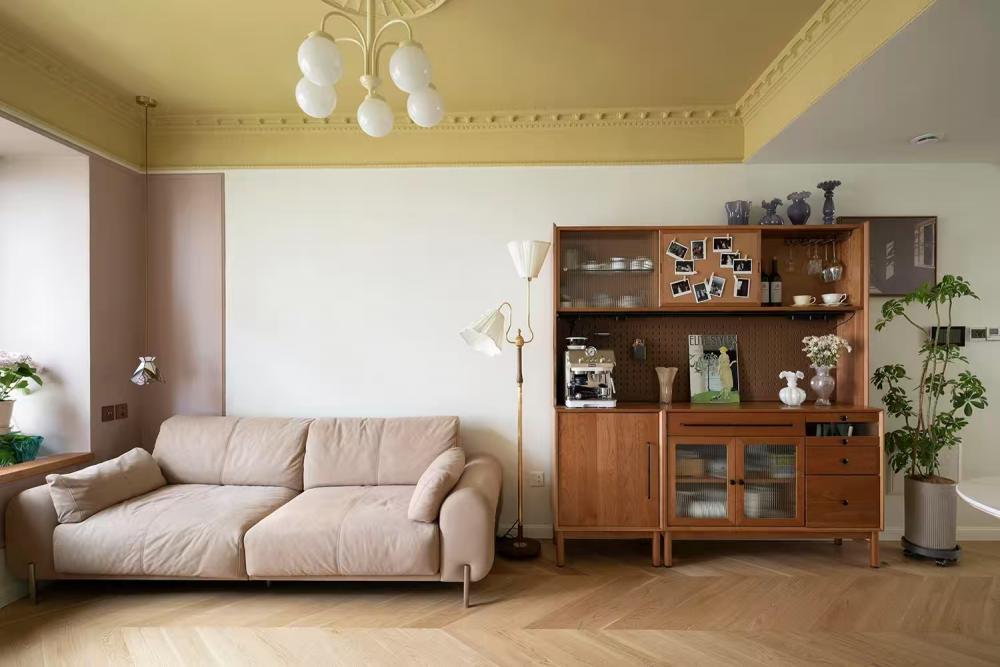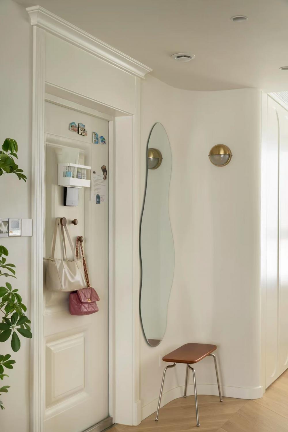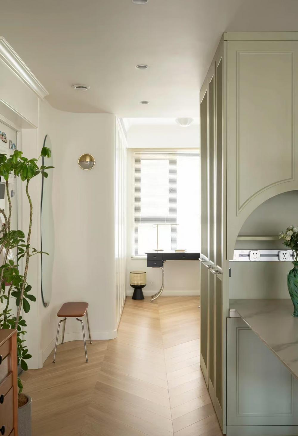 本次改造以局部拆墻重塑為核心,巧妙規(guī)劃空間布局,強化功能坪效,改善采光問題。在有限改動前提下,成功將套內(nèi)面積僅66m2小三居化為充滿法式陽光的大居室,既滿足業(yè)主當(dāng)前需求,又預(yù)留未來變化空間,實現(xiàn)美觀、實用與靈活三位一體的居住體驗。 設(shè)計師結(jié)合業(yè)主的居住訴求,將空間布局的改動聚焦在了 以下3點:1、利用多功能組合柜,規(guī)整門廳,提升坪效;2 、 打開廚房,客餐廚合并;3 、閑置小臥室改多功能房。 打開家門,一抹清新法式風(fēng)迎面而來。原本局促的門廳經(jīng)多功能組合柜“魔盒”整理,瞬間變得井然有序。 鞋柜、家政柜、洗手臺一應(yīng)俱全,空間利用率大幅提升,讓入戶區(qū)域既美觀又實用。 柜內(nèi)預(yù)留電源,利用洗手池的上下水嵌入掃地機器人,將家政柜也規(guī)劃在了這個區(qū)域。將掃地機器人的出口放在了側(cè)邊,這樣能保證正對入戶大門的一側(cè)能夠規(guī)整、美觀。 這個房間目前主要作為儲物空間和瑜伽室使用,衣柜內(nèi)部規(guī)劃了運動器械收納區(qū),窗邊放置了辦公桌。 隔壁就是次臥,緊鄰客衛(wèi)。更改次臥入口,從多功能房一側(cè)進入,原門洞用玻璃磚封起來,一來可以為客衛(wèi)干區(qū)引光,二來能保持空間的靈活性。 步入客廳,法式浪漫氣息撲面而來。芥末黃與灰粉色的完美搭配,賦予空間溫馨而不失活力的氣息。 拆墻重塑,餐廚合一,空間瞬間放大。廚房由封閉走向開放,島臺與大餐桌無縫對接,形成高效便捷的餐廚交互空間。餐邊柜的加入,不僅提升收納能力,更為咖啡愛好者打造專屬舞臺,讓用餐時光更具儀式感。 廚房是在原簡裝瓷磚的基礎(chǔ)上直接貼琺瑯版上墻,省去了找平的步驟。另一側(cè)嵌入冰箱,冰箱側(cè)邊新增的烤箱電器柜??鞠涮匾膺x了與墻同色的奶白色,復(fù)古的樣式也能很好的融入公區(qū)環(huán)境。 雙開門設(shè)計營造法式特有的儀式感,彩繪玻璃元素增添浪漫情調(diào)。衣柜側(cè)邊的復(fù)古黃銅壁燈,成為推門而入的第一視覺焦點,溫暖光源瞬間撫慰疲憊身心。飄窗抽屜加高處理,既增加儲物空間,又提供休閑角落。 主衛(wèi)采用油畫玻璃門引入自然光,馬賽克瓷磚與墻漆拼接,延續(xù)公區(qū)色彩基調(diào),兼顧隱私與美觀。衛(wèi)浴間內(nèi),馬賽克瓷磚拼接墻漆,在色彩上與公區(qū)相呼應(yīng)。 次臥作為未來的兒童房,整體布局簡單,盡可能的保留了空間的靈活度,方便業(yè)主后期根據(jù)需求自由發(fā)揮。