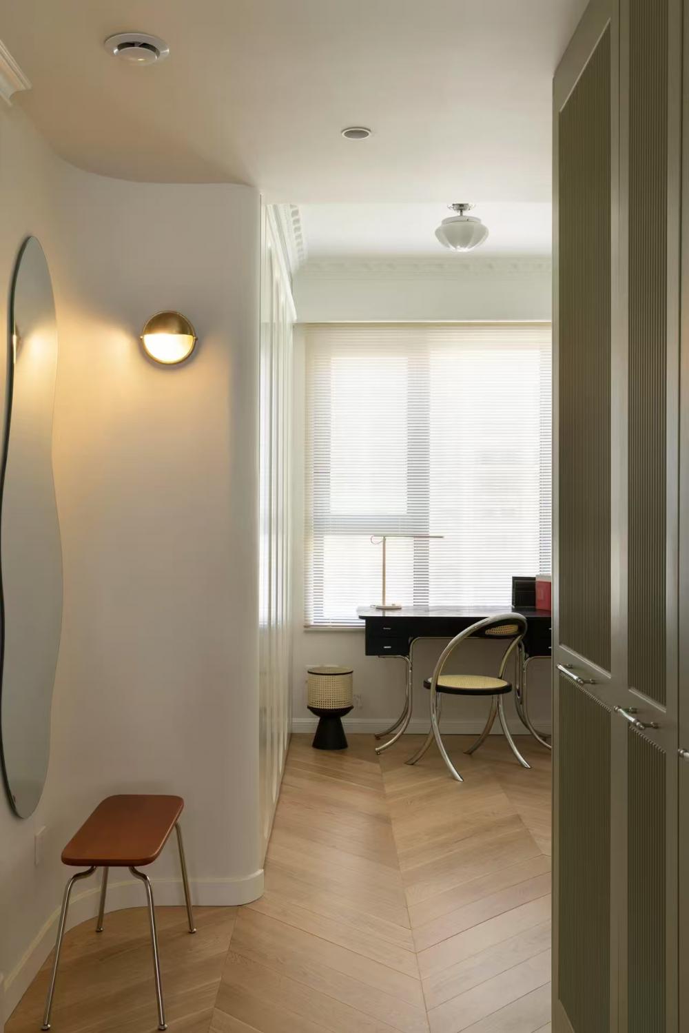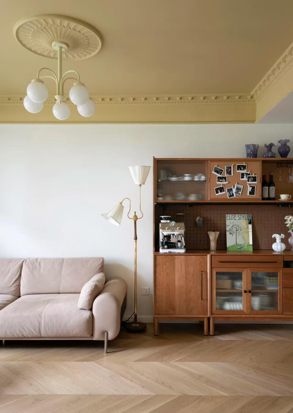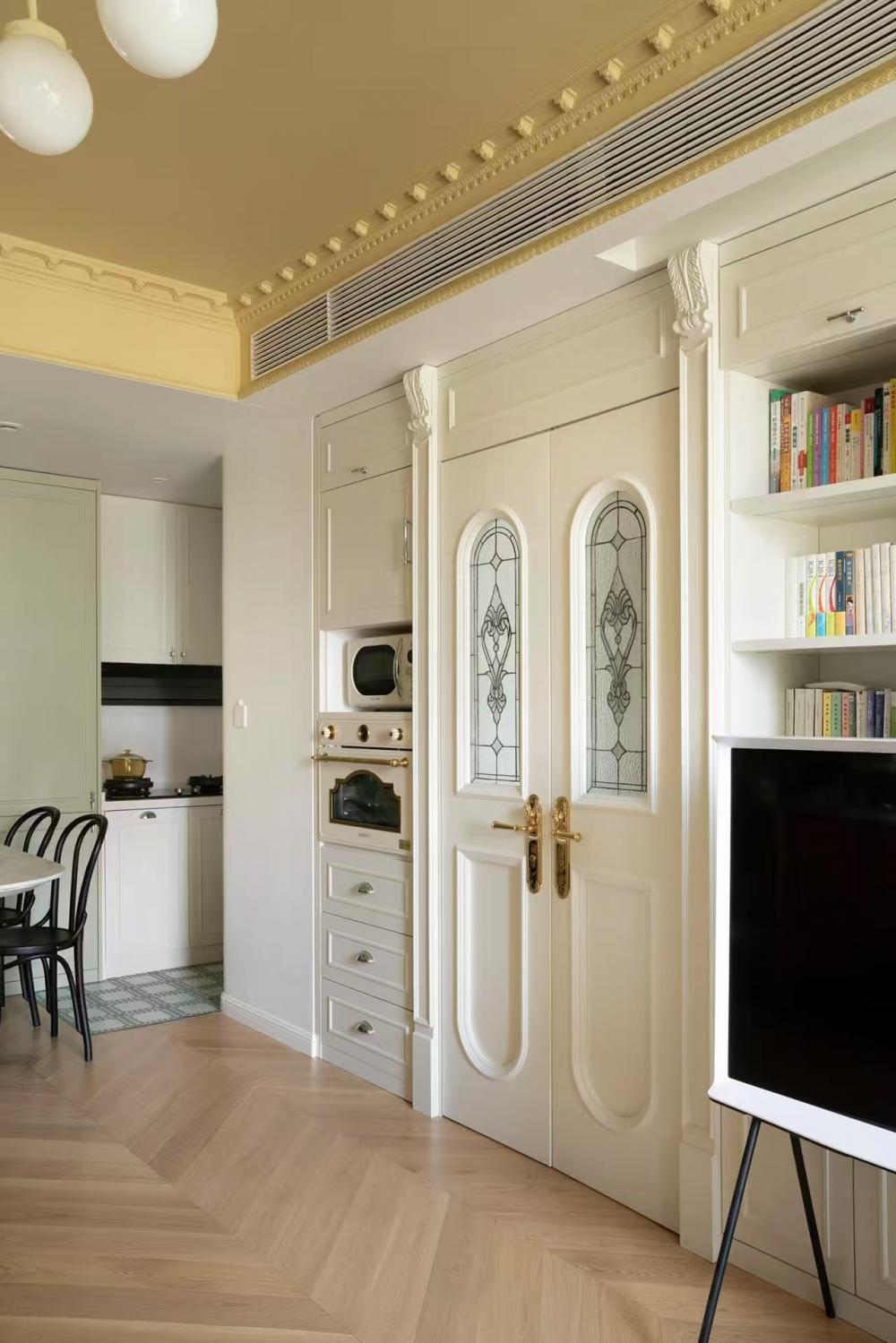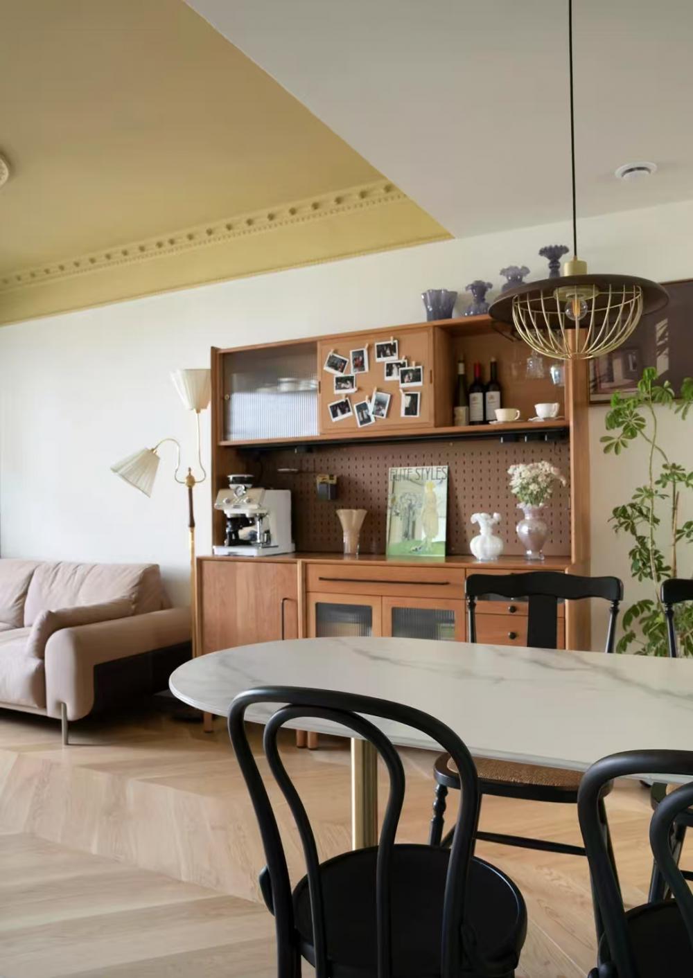 本次改造以局部拆墻重塑為核心,巧妙規(guī)劃空間布局,強化功能坪效,改善采光問題。在有限改動前提下,成功將套內(nèi)面積僅66m2小三居化為充滿法式陽光的大居室,既滿足業(yè)主當(dāng)前需求,又預(yù)留未來變化空間,實現(xiàn)美觀、實用與靈活三位一體的居住體驗。 設(shè)計師結(jié)合業(yè)主的居住訴求,將空間布局的改動聚焦在了 以下3點:1、利用多功能組合柜,規(guī)整門廳,提升坪效;2 、 打開廚房,客餐廚合并;3 、閑置小臥室改多功能房。 打開家門,一抹清新法式風(fēng)迎面而來。原本局促的門廳經(jīng)多功能組合柜“魔盒”整理,瞬間變得井然有序。 鞋柜、家政柜、洗手臺一應(yīng)俱全,空間利用率大幅提升,讓入戶區(qū)域既美觀又實用。 柜內(nèi)預(yù)留電源,利用洗手池的上下水嵌入掃地機器人,將家政柜也規(guī)劃在了這個區(qū)域。將掃地機器人的出口放在了側(cè)邊,這樣能保證正對入戶大門的一側(cè)能夠規(guī)整、美觀。 這個房間目前主要作為儲物空間和瑜伽室使用,衣柜內(nèi)部規(guī)劃了運動器械收納區(qū),窗邊放置了辦公桌。 隔壁就是次臥,緊鄰客衛(wèi)。更改次臥入口,從多功能房一側(cè)進入,原門洞用玻璃磚封起來,一來可以為客衛(wèi)干區(qū)引光,二來能保持空間的靈活性。 步入客廳,法式浪漫氣息撲面而來。芥末黃與灰粉色的完美搭配,賦予空間溫馨而不失活力的氣息。 拆墻重塑,餐廚合一,空間瞬間放大。廚房由封閉走向開放,島臺與大餐桌無縫對接,形成高效便捷的餐廚交互空間。餐邊柜的加入,不僅提升收納能力,更為咖啡愛好者打造專屬舞臺,讓用餐時光更具儀式感。 廚房是在原簡裝瓷磚的基礎(chǔ)上直接貼琺瑯版上墻,省去了找平的步驟。另一側(cè)嵌入冰箱,冰箱側(cè)邊新增的烤箱電器柜??鞠涮匾膺x了與墻同色的奶白色,復(fù)古的樣式也能很好的融入公區(qū)環(huán)境。 雙開門設(shè)計營造法式特有的儀式感,彩繪玻璃元素增添浪漫情調(diào)。衣柜側(cè)邊的復(fù)古黃銅壁燈,成為推門而入的第一視覺焦點,溫暖光源瞬間撫慰疲憊身心。飄窗抽屜加高處理,既增加儲物空間,又提供休閑角落。 主衛(wèi)采用油畫玻璃門引入自然光,馬賽克瓷磚與墻漆拼接,延續(xù)公區(qū)色彩基調(diào),兼顧隱私與美觀。衛(wèi)浴間內(nèi),馬賽克瓷磚拼接墻漆,在色彩上與公區(qū)相呼應(yīng)。 次臥作為未來的兒童房,整體布局簡單,盡可能的保留了空間的靈活度,方便業(yè)主后期根據(jù)需求自由發(fā)揮。