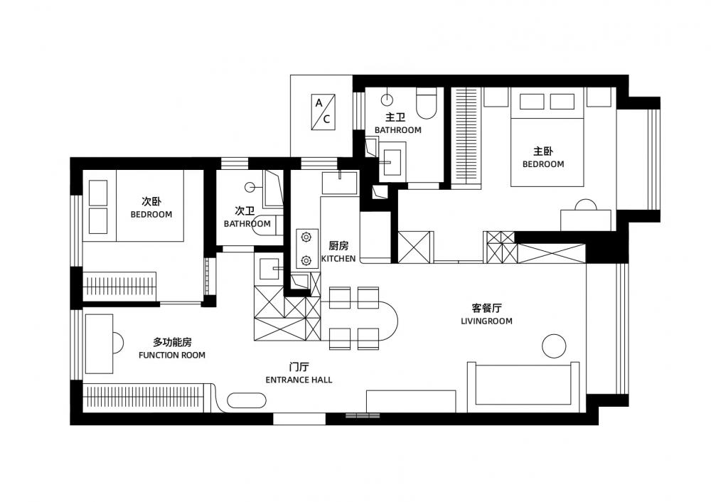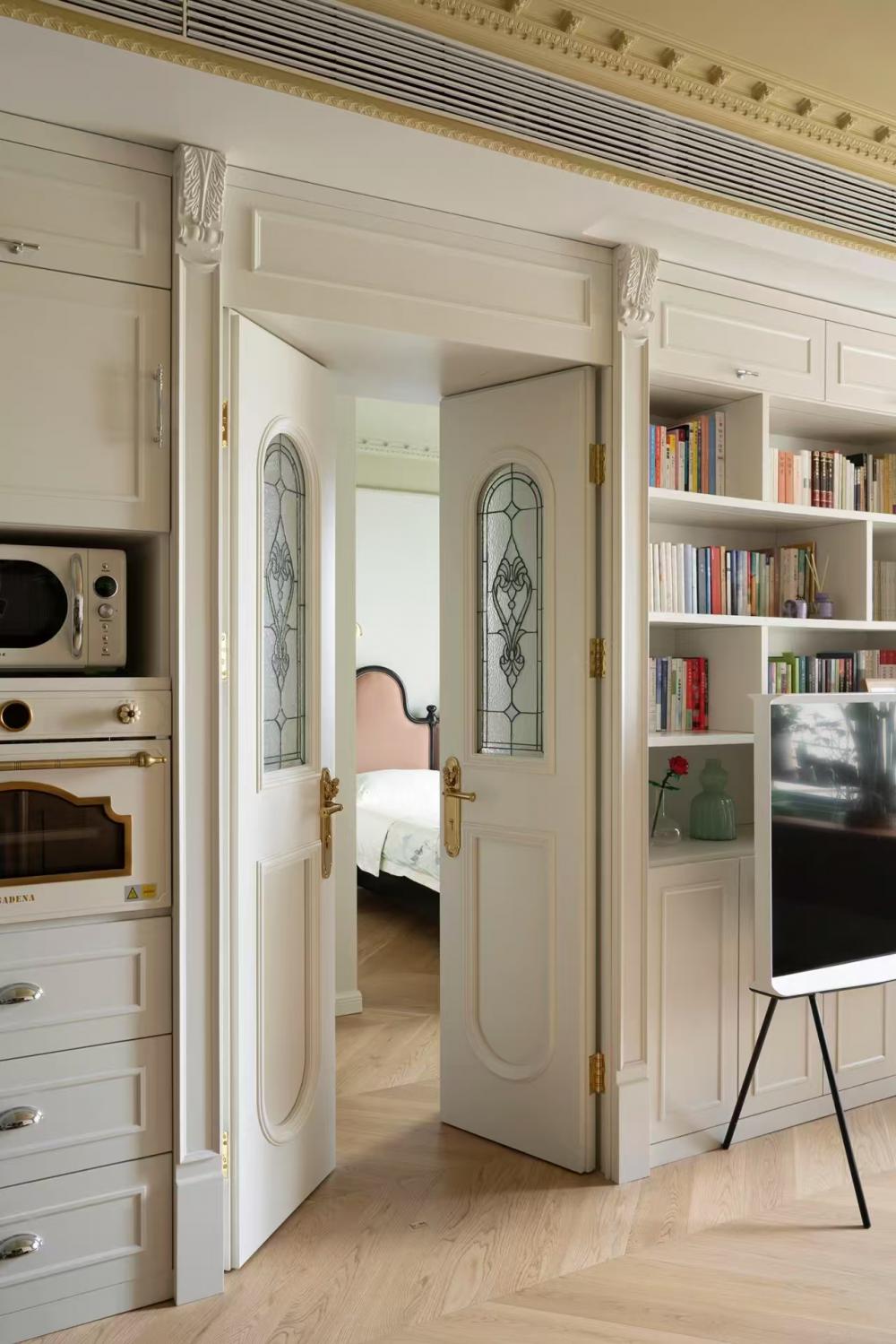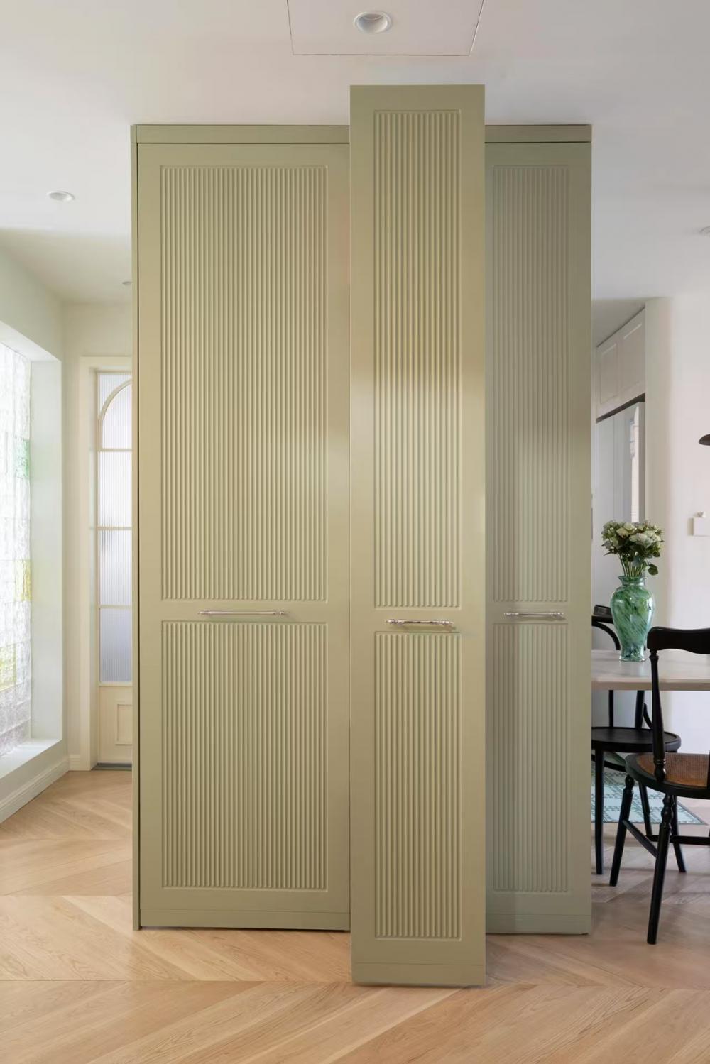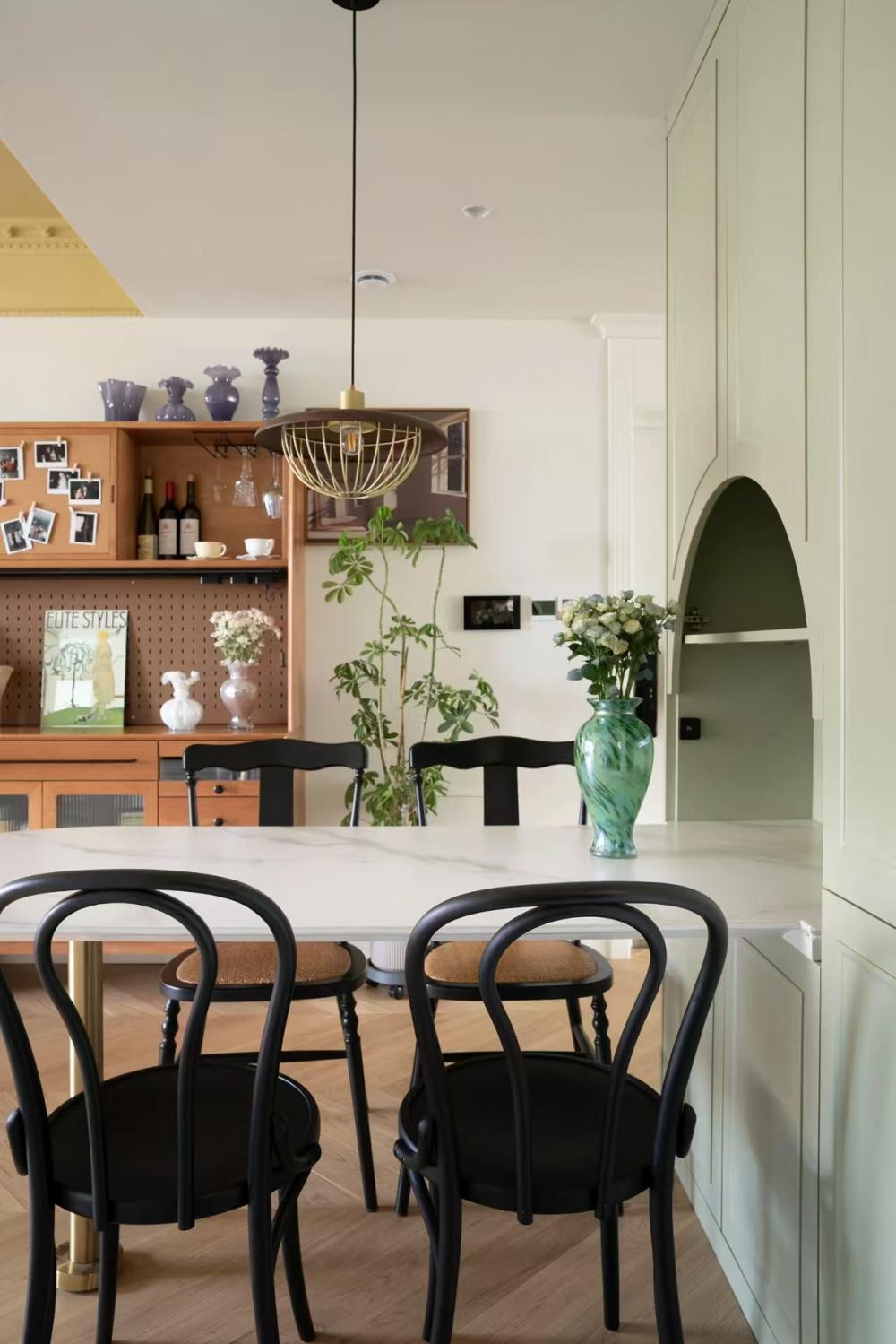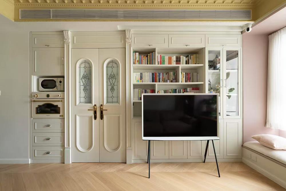 本次改造以局部拆墻重塑為核心,巧妙規(guī)劃空間布局,強化功能坪效,改善采光問題。在有限改動前提下,成功將套內(nèi)面積僅66m2小三居化為充滿法式陽光的大居室,既滿足業(yè)主當(dāng)前需求,又預(yù)留未來變化空間,實現(xiàn)美觀、實用與靈活三位一體的居住體驗。 設(shè)計師結(jié)合業(yè)主的居住訴求,將空間布局的改動聚焦在了 以下3點:1、利用多功能組合柜,規(guī)整門廳,提升坪效;2 、 打開廚房,客餐廚合并;3 、閑置小臥室改多功能房。 打開家門,一抹清新法式風(fēng)迎面而來。原本局促的門廳經(jīng)多功能組合柜“魔盒”整理,瞬間變得井然有序。 鞋柜、家政柜、洗手臺一應(yīng)俱全,空間利用率大幅提升,讓入戶區(qū)域既美觀又實用。 柜內(nèi)預(yù)留電源,利用洗手池的上下水嵌入掃地機器人,將家政柜也規(guī)劃在了這個區(qū)域。將掃地機器人的出口放在了側(cè)邊,這樣能保證正對入戶大門的一側(cè)能夠規(guī)整、美觀。 這個房間目前主要作為儲物空間和瑜伽室使用,衣柜內(nèi)部規(guī)劃了運動器械收納區(qū),窗邊放置了辦公桌。 隔壁就是次臥,緊鄰客衛(wèi)。更改次臥入口,從多功能房一側(cè)進入,原門洞用玻璃磚封起來,一來可以為客衛(wèi)干區(qū)引光,二來能保持空間的靈活性。 步入客廳,法式浪漫氣息撲面而來。芥末黃與灰粉色的完美搭配,賦予空間溫馨而不失活力的氣息。 拆墻重塑,餐廚合一,空間瞬間放大。廚房由封閉走向開放,島臺與大餐桌無縫對接,形成高效便捷的餐廚交互空間。餐邊柜的加入,不僅提升收納能力,更為咖啡愛好者打造專屬舞臺,讓用餐時光更具儀式感。 廚房是在原簡裝瓷磚的基礎(chǔ)上直接貼琺瑯版上墻,省去了找平的步驟。另一側(cè)嵌入冰箱,冰箱側(cè)邊新增的烤箱電器柜??鞠涮匾膺x了與墻同色的奶白色,復(fù)古的樣式也能很好的融入公區(qū)環(huán)境。 雙開門設(shè)計營造法式特有的儀式感,彩繪玻璃元素增添浪漫情調(diào)。衣柜側(cè)邊的復(fù)古黃銅壁燈,成為推門而入的第一視覺焦點,溫暖光源瞬間撫慰疲憊身心。飄窗抽屜加高處理,既增加儲物空間,又提供休閑角落。 主衛(wèi)采用油畫玻璃門引入自然光,馬賽克瓷磚與墻漆拼接,延續(xù)公區(qū)色彩基調(diào),兼顧隱私與美觀。衛(wèi)浴間內(nèi),馬賽克瓷磚拼接墻漆,在色彩上與公區(qū)相呼應(yīng)。 次臥作為未來的兒童房,整體布局簡單,盡可能的保留了空間的靈活度,方便業(yè)主后期根據(jù)需求自由發(fā)揮。