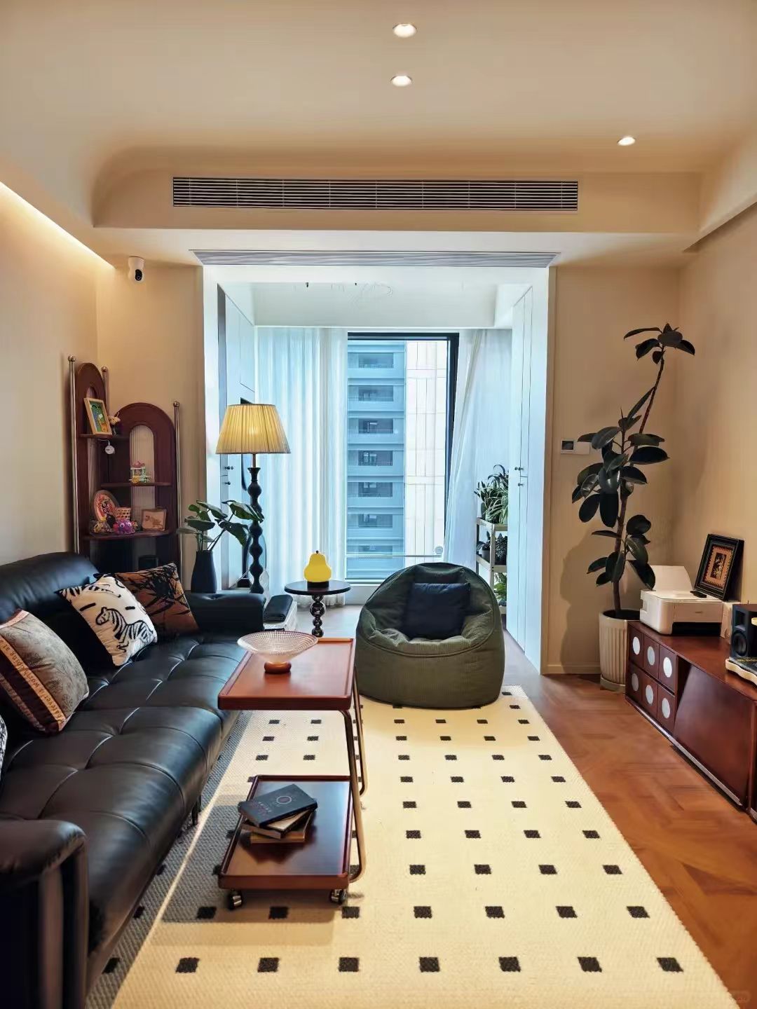 建面 78㎡小兩室,套內(nèi)不足 60㎡的傳統(tǒng)大豎廳,卻靠簡(jiǎn)約硬裝裝出滿屏中古風(fēng)! 通刷暖白乳膠漆 + 通鋪木紋磚,無(wú)復(fù)雜吊頂和墻面裝飾,奶油色大面積延伸視覺(jué)顯大又溫馨。 入戶寬度不足 1.2 米的小戶型窄玄關(guān),鞋柜精準(zhǔn)拿捏實(shí)用與顏值! 客餐廳一體的空間,鞋柜旁就是小餐廳,設(shè)計(jì)兼具復(fù)古與現(xiàn)代感且細(xì)節(jié)滿滿。 客廳開間3.4米,沒(méi)有做復(fù)雜的吊頂,無(wú)主燈視野開闊明亮,沒(méi)有做電視背景墻打滿柜子,地面人字拼木質(zhì)地板搭配黑白幾何圖案地毯,層次十足 陽(yáng)臺(tái)打通后寬敞感倍增,左邊設(shè)洗烘區(qū)滿足衣物清潔收納需求,右邊打造 L 型陽(yáng)臺(tái)收納柜,充分利用空間補(bǔ)充儲(chǔ)物功能 進(jìn)門右手邊是 4m 小廚房,通過(guò) “榨干角落” 實(shí)現(xiàn)空間合理利用—— 家用電器通通藏入柜中,U 字型布局讓炒菜、煮飯互不干擾,東西再多也不雜亂 小次臥,空間雖緊湊卻氛圍感拉滿!1.5 米床適配戶型尺寸,搭配2.6m 層高不顯壓抑;不做復(fù)雜背景墻,墻面直接刮大白簡(jiǎn)潔耐看 主臥面積也不算大,1.5 米床搭配軟包靠背,墻面直接刮大白簡(jiǎn)潔耐看。定制暖白色到頂大衣柜,內(nèi)部按掛衣區(qū)、疊放區(qū)科學(xué)分區(qū),收納力拉滿。 衛(wèi)生間,木質(zhì)嵌入式柜體搭配黑白配色洗手臺(tái),臺(tái)面上洗漱用品滿滿生活氣息;黑色鐵藝玻璃門設(shè)計(jì)感十足,透過(guò)門可見衛(wèi)浴內(nèi)部黑白花紋地磚與棕白分色墻面,風(fēng)格復(fù)古層次分明。