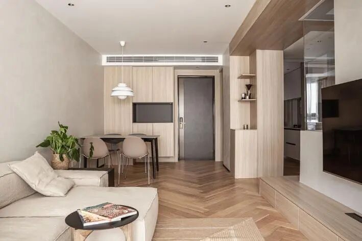 現(xiàn)代簡約風(fēng)和侘寂風(fēng)的結(jié)合,給人恬淡安靜的舒適感,也讓家更顯輕盈優(yōu)雅,效果堪比大平層。 改造前戶型分析: 1、入戶進(jìn)門缺少儲物空間,回家后置物不方便; 2、廚房空間比較緊湊,不能滿足屋主對烹飪的需求; 3、三居室格局,但空間劃分比較凌亂,功能不明顯; 4、衛(wèi)生間干濕一體,空間利用率不高。 根據(jù)戶型問題和實(shí)際居住需求,做以下改造: 1、進(jìn)門拆除墻體增加鞋柜設(shè)計(jì),局部鏤空設(shè)計(jì),實(shí)現(xiàn)置物平臺需求; 2、局部拆除廚房隔墻,利用承重墻和過道,實(shí)現(xiàn)回形動線,改善居家動線; 3、與書房相鄰臥室,改造成步入式衣帽間,滿足屋主對衣物的收納需求; 4、與客廳相鄰的臥室改造成書房,轉(zhuǎn)角利用玻璃替代磚墻,增加通透性; 5、衛(wèi)生間重新調(diào)整布局,不僅提高了空間利用率,實(shí)用性也得到改善。