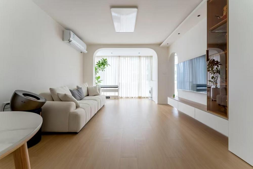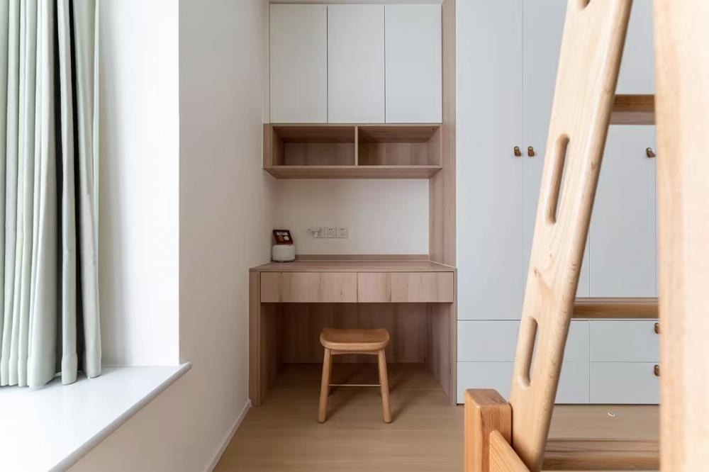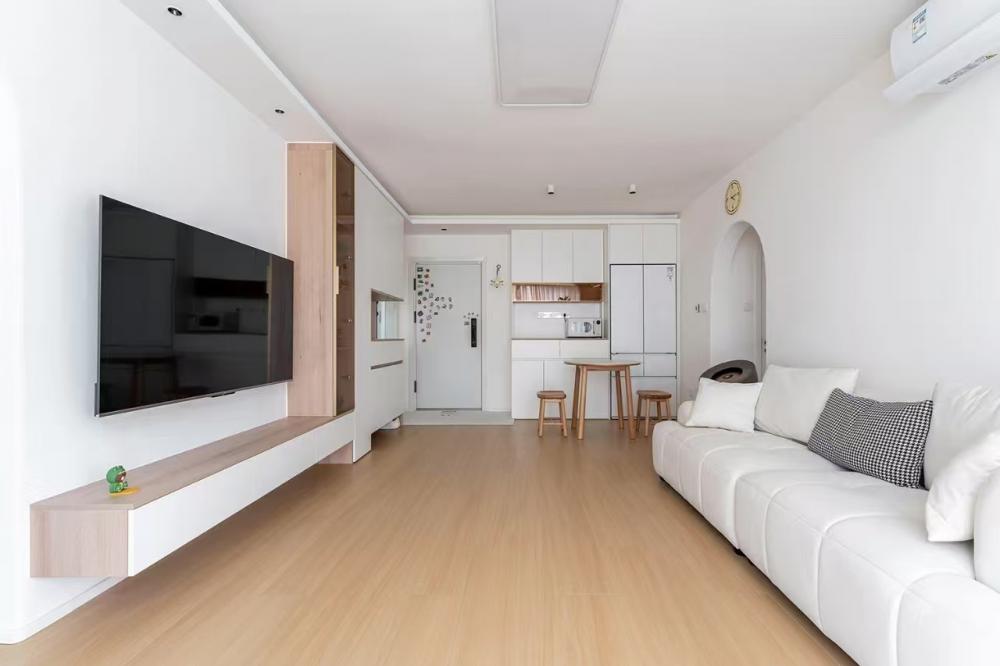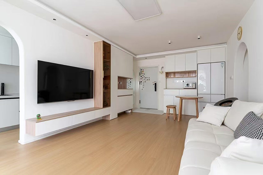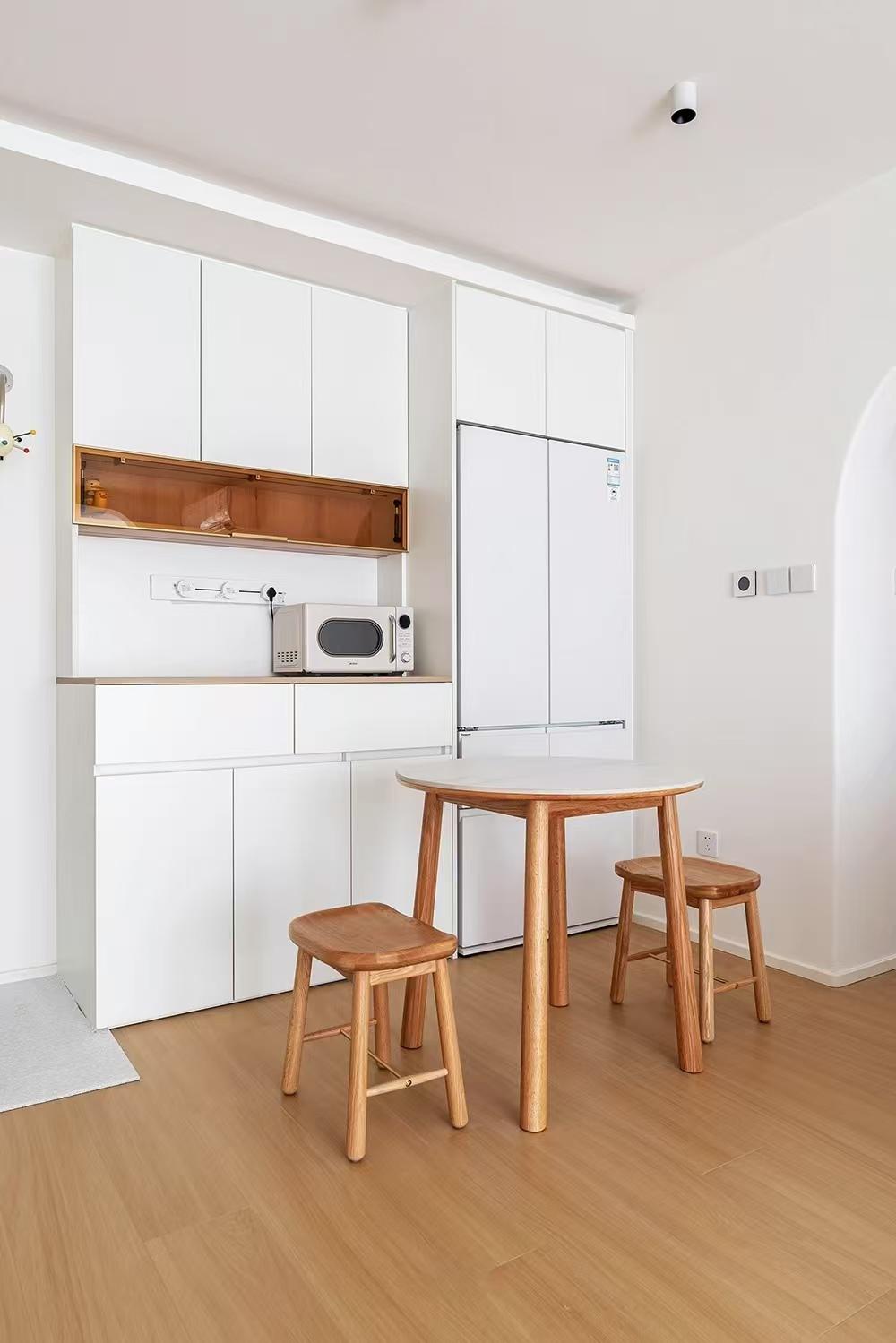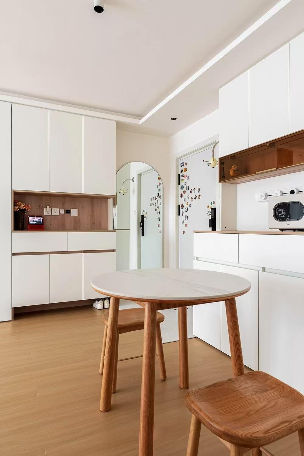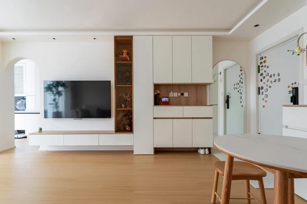 這套70㎡小戶型是夫妻二人的居所,未來會迎接小朋友,需適應(yīng)家庭結(jié)構(gòu)變化,合理規(guī)劃空間。屋主小姐姐要求明確,家中自采暖并鋪設(shè)電地暖。因?qū)痈邇H2.5米,期望吊頂輕盈,不降低空間感?;A(chǔ)裝修偏好簡潔溫馨風(fēng)格,同時注重收納設(shè)計,旨在打造既溫馨又易于打理的生活環(huán)境,為未來的小家庭提供舒適溫馨的居住體驗。 整體空間以奶油白+原木色為主調(diào),化繁為簡的硬裝設(shè)計,自然舒適,搭配原木質(zhì)感的家居,碰撞出溫馨清爽的氣息。 原木長條木紋磚通鋪,顯大且導(dǎo)熱佳,環(huán)氧彩砂美縫細膩自然。奶白色家具,色調(diào)統(tǒng)一,營造寧靜空間。 奶油色墻頂與地面層次分明,弧形門洞與綠植增添生機。地板延伸至陽臺,視覺連貫,科技布沙發(fā)舒適,無茶幾設(shè)計預(yù)留更多互動空間。 電視柜與鞋柜連接,讓整面墻體充分利用,一門到頂?shù)母吖瘢芎玫貙刹糠止耋w連接。 客廳無茶幾設(shè)計為以后有小朋友時,留出更多的空間與家人互動、玩耍。 1.6米鞋柜,預(yù)留家居鞋位及平臺收納,超大落地鏡實用且顯空間。超大落地穿衣鏡,不僅實用還讓小空間更顯大。 右側(cè)做600mm深的餐邊柜,留出足夠的臺面當(dāng)作電器操作區(qū),日常水吧和小電器都可以在這邊使用。冰箱選擇零嵌式,跟柜體保持平整。圓形折疊餐桌,滿足日常兩人用餐的同時,也調(diào)整了空間的靈活性。 廚房的弧形門洞,用圓角處理了陽角部分,加上奶呼呼的涂料直接通刷過去,為空間增添柔美感。L型的操作臺,滿足洗菜、切菜、炒菜的動線,整體木紋磚顯得溫馨又好打理。 半開放式廚房,選擇最大吸力的集成灶。櫥柜也直接通向陽臺,沒有做過多的分割。 生活陽臺洗衣機烘干機上方做高柜增加儲物量。右側(cè)櫥柜臺面延伸過來,下方放置掃地機器人;中間臺面放置內(nèi)衣機;上方做百葉門隱藏壁掛爐,一組柜子就這樣同時滿足多種功能。 床頭做木色木飾面背板,右側(cè)延伸出床頭抽屜柜,左側(cè)增加可伸縮小吊燈,可任意調(diào)節(jié)。床頭柜上方的木色隔板,用來放置投影儀。懸浮床設(shè)計簡約,床下可放置儲物。轉(zhuǎn)角大飄窗做隱藏式窗簾,坐在飄窗上感受休閑時光~ 實木上下床,有小朋友后即使老人過來也可以同時居住。 靠近窗邊留置一組1.2米寬的書桌,上方開放格區(qū)域放置常用書籍。白色整面墻衣柜,下方兩排抽屜做25cm深度,收納小件衣物和小朋友的玩具。 長條大磚墻面豎鋪,淋浴房地面小方磚防滑。洗手盆懸浮易潔,鏡柜加長,增加收納。整體奶白色調(diào)搭配木紋增加質(zhì)感。