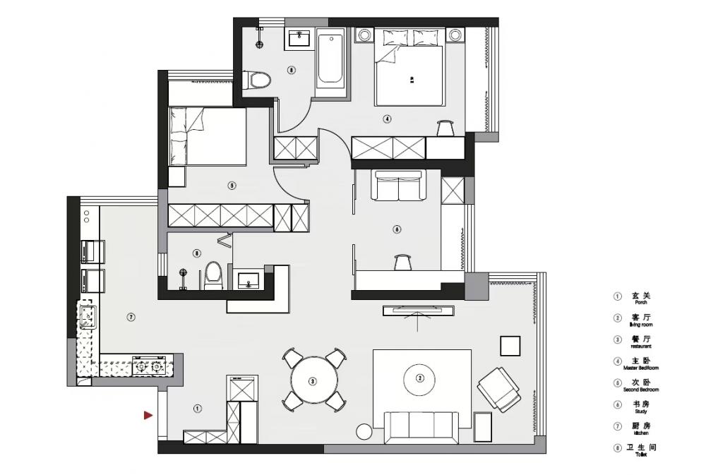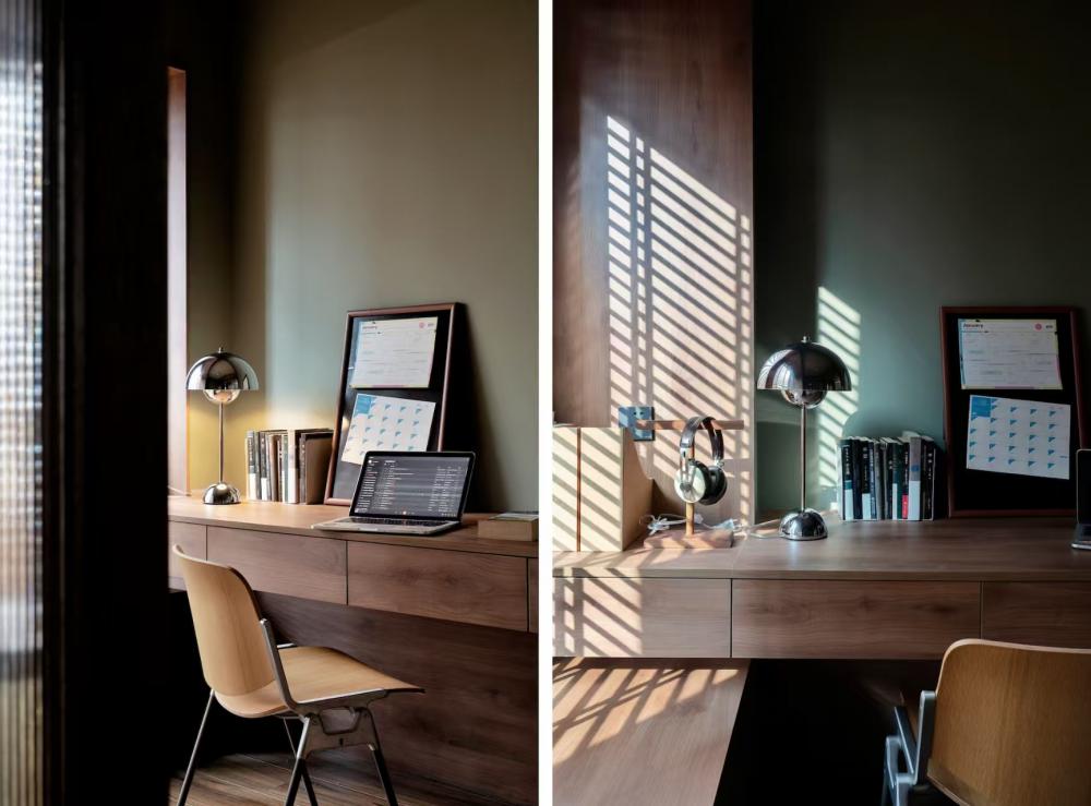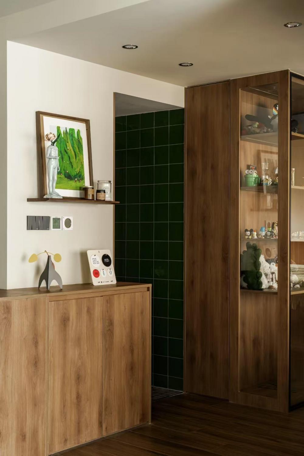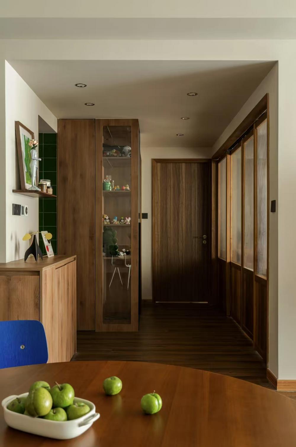 本案是一套面積為94平米的三居室,業(yè)主是一位老師,她文藝又灑脫、獨立又可愛。對于新家,她有著具體的想象:希望能有大大的鞋柜能放下她的心愛的鞋子;衛(wèi)生間一定要能安放下浴缸,來舒緩每日疲憊的軀體;獨立的書房也一定是要有的,日常備課閱讀需要有獨立的空間環(huán)境……在一次次的溝通碰撞中,逐漸勾勒出她理想中的家的模樣…… 利用AB柜的設(shè)計在客餐廳中間隔出了一個玄關(guān)。玄關(guān)柜集換鞋凳與收納于一體,符合屋主使用習(xí)慣。 利用柜體厚度巧妙放下了業(yè)主心心念念的大冰箱,同時這個柜體一面是鞋柜,另一面也滿足了客廳餐邊柜的功能。 靠餐廳一面是定制柜是餐邊柜。在開放格區(qū)域安排了滑軌插座,方便日后咖啡機(jī)、空氣炸鍋等小家電的使用。 客廳落地窗旁的舒適一角。餐廳、客廳以及走廊的位置關(guān)系??蛷d也是業(yè)主和朋友們玩樂休閑的區(qū)域,無茶幾的設(shè)計讓整個客廳的活動范圍更寬更舒適。 壓縮了部分書房位置,將這個普通的走廊設(shè)計成這個家中的“特別展位”。轉(zhuǎn)角L型定制柜體既是儲物空間,也是業(yè)主一些喜愛的畫作物件等的展示區(qū)。 進(jìn)入書房,也仿佛遁入另一個獨屬于自己的時空。四扇玻璃推拉門,在保證書房空間的獨立性私密性之外,也最大限度將自然陽光引入室內(nèi)。 主臥營造舒適靜謐的睡眠氛圍。將衣柜和梳妝臺的位置移到床尾一字鋪開,留夠空間擺放1.8米的大床以及左側(cè)衛(wèi)生間的浴缸。 擴(kuò)大主衛(wèi)空間,容納下業(yè)主心心念念的大浴缸。干濕分離,將浴缸放到干區(qū)位置。 和全屋統(tǒng)一色調(diào)下打造簡單的次臥休息空間,方便日后朋友父母臨時居住。 打通生活陽臺,將廚房臺面延伸出去,擴(kuò)大面積,也能感受陽光的美好。