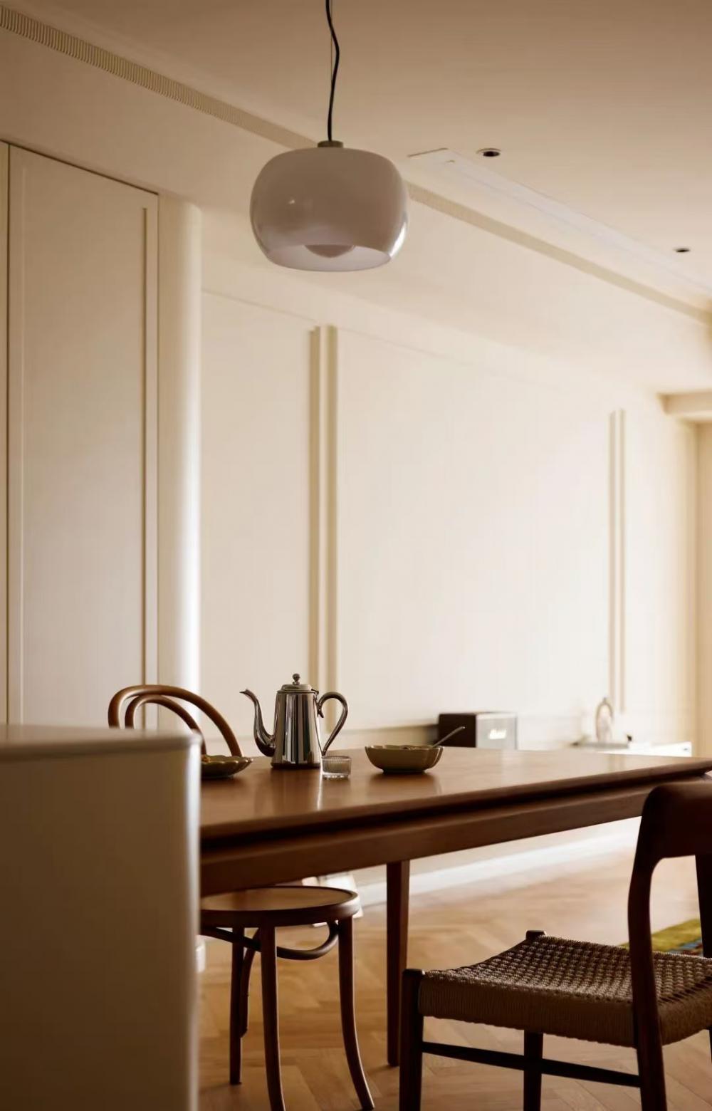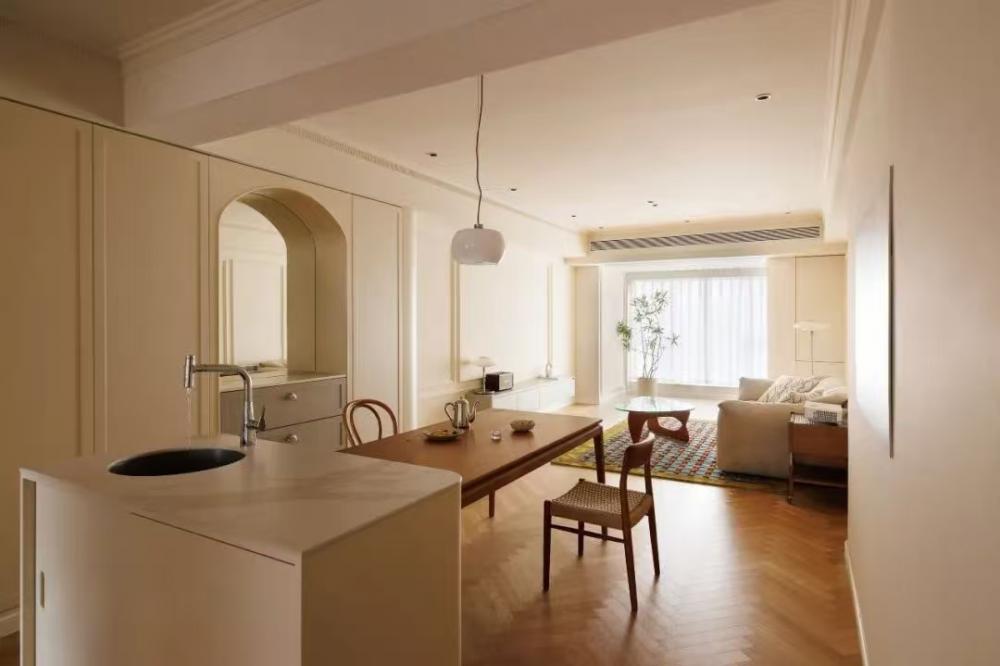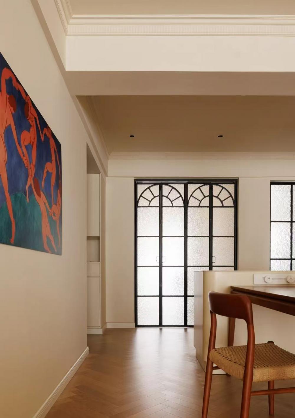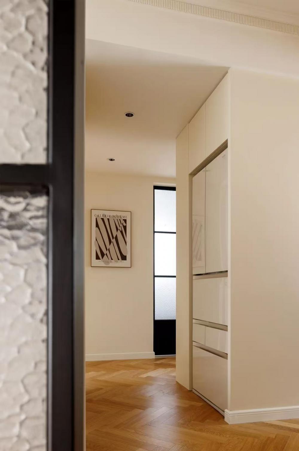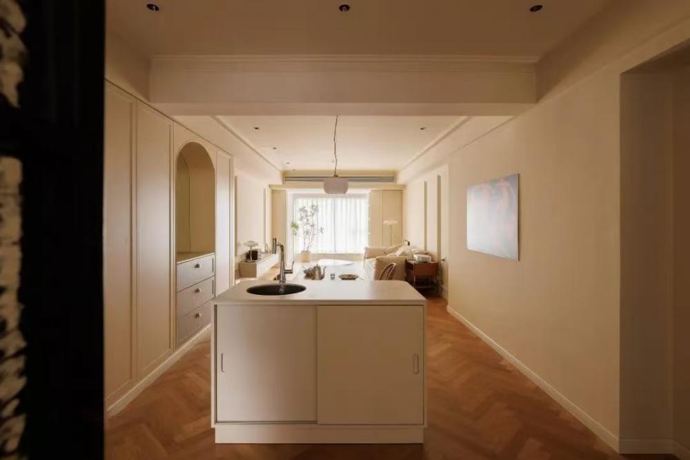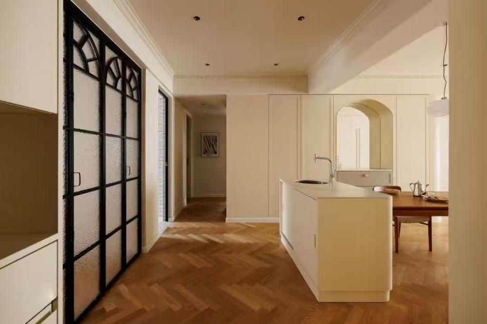 屋主是一對(duì)年輕的夫婦。他們對(duì)家的構(gòu)想是要舒適和耐看的,在風(fēng)格上則偏愛復(fù)古,但卻不是濃墨重彩的,就像擁有大面積淺色作為基礎(chǔ)。 公區(qū)整體以開放性為主,寬敞透亮的橫廳,墻面與柜體統(tǒng)一的可可燕麥色讓空間充滿優(yōu)雅的氛圍,溫潤感十足。人字紋木地面配以裝飾的石膏線條進(jìn)行點(diǎn)綴,讓整體呈現(xiàn)輕巧的精致感。 客廳旁,島臺(tái)與餐桌組合形成的餐廳洄游動(dòng)線是家的中心位置。 由于餐廳上方存在一根位置較低的橫梁,設(shè)計(jì)師結(jié)合這道“顯性”的界線,將島臺(tái)與餐桌恰到好處的安放,既避免了餐桌在梁的正下方,同時(shí)也讓餐廳擁有舒適的過道寬度。 餐桌對(duì)面,鏡面水吧臺(tái)結(jié)合的一整面收納柜體承擔(dān)了客餐廳的收納需求。 朝向廚房的一側(cè),則被分為島臺(tái)上下水管線及設(shè)備放置區(qū)域+廚房小家電收納的補(bǔ)充區(qū)域。 推開廚房的鐵藝玻璃門,這里的復(fù)古柔光小磚墻面,深色櫥柜,灰色花磚,相較于公區(qū)統(tǒng)一色調(diào)更多了一份豐富的層次美感。由于原始廚房面積受墻體限制無法改擴(kuò),為了保證設(shè)計(jì)后的廚房擁有充足的操作臺(tái)面、儲(chǔ)物區(qū)域與行走空間,設(shè)計(jì)師將冰箱進(jìn)行了外置處理。 與廚房相鄰的折疊門后,是屬于書房空間。壁紙搭配鐵藝門,復(fù)古味顯得更為具體。 從玄關(guān)角度看整個(gè)家,在拆除原有次臥的部分墻體后,讓走廊長度和視線得到延伸,讓空間更顯通透。沿著走廊,便可通向臥室區(qū)域 主臥延續(xù)了公區(qū)的氛圍感,結(jié)合現(xiàn)場(chǎng)尺寸設(shè)置了整面長6.7m的衣柜,最大化滿足屋主收納需求。增加梳妝臺(tái)的區(qū)域,墻面置物架,黑色床頭搭配純白的床品,墻面裝飾性線框和中古感壁燈不對(duì)稱感設(shè)計(jì),慵懶而又淡雅的氣質(zhì)盡顯。 主衛(wèi)長臺(tái)盆設(shè)計(jì),鏡面同樣也是半圓弧設(shè)計(jì)并且暗藏?zé)魩?,胡桃木洗手臺(tái)柜門,淋浴間采用黃銅門框+玻璃設(shè)計(jì),簡潔卻充滿復(fù)古的味道。 次臥暫時(shí)作為客房使用,將來會(huì)成為家中的兒童房,整體營造出舒適的休息區(qū)域。 公衛(wèi)依舊是復(fù)古鐵藝門和黃銅把手的搭配,整個(gè)公區(qū)在門的形體上統(tǒng)一且相互呼應(yīng)。門外是與冰箱相連的組合家政柜,不落地設(shè)計(jì),為掃地機(jī)器人預(yù)留了收納空間,洗烘一體,將清潔功能整合于此,形成小型且便捷的家政空間。