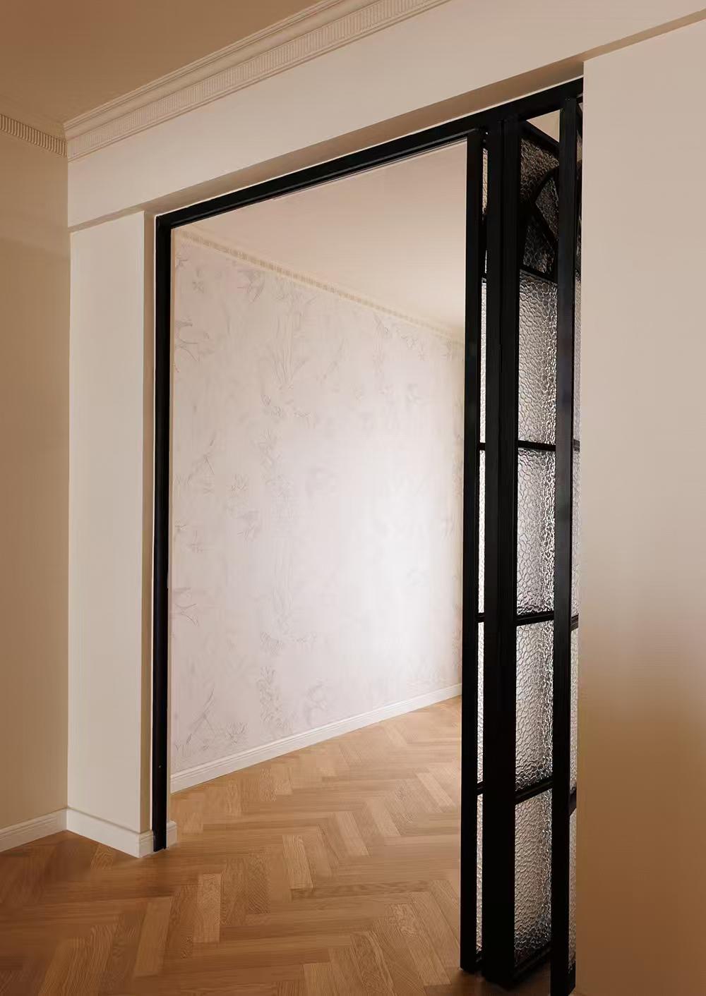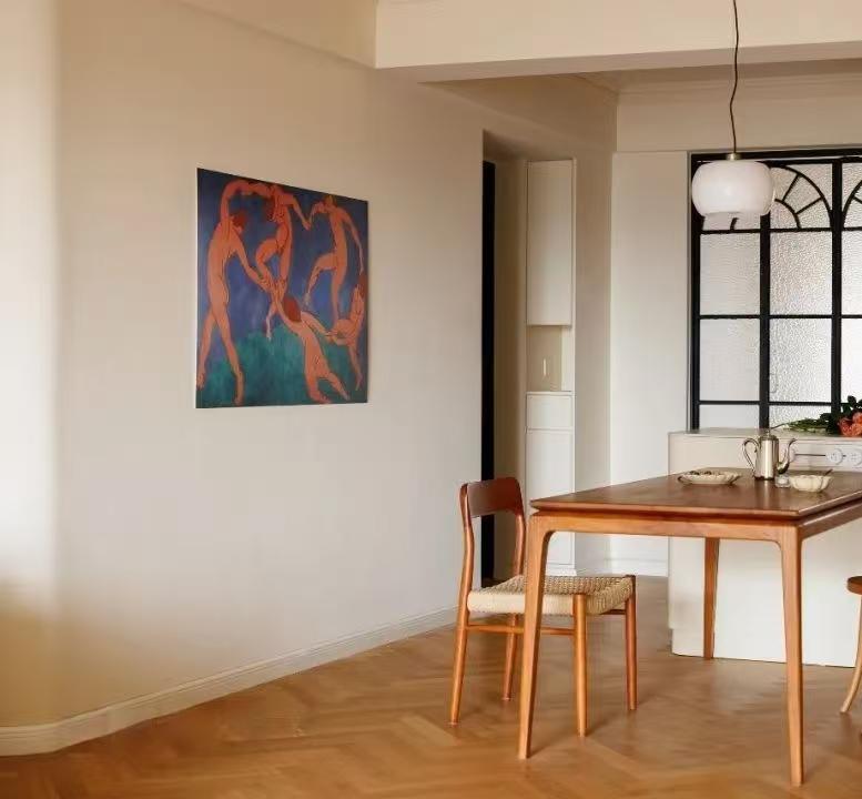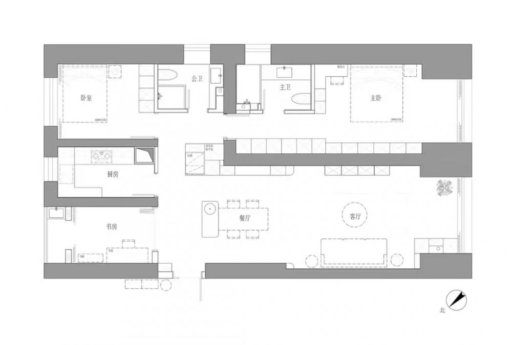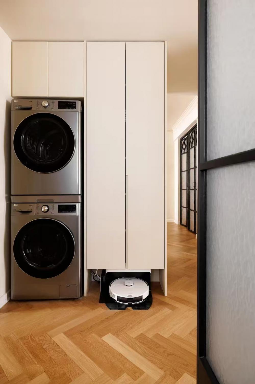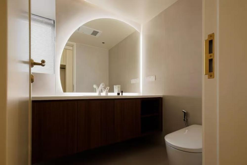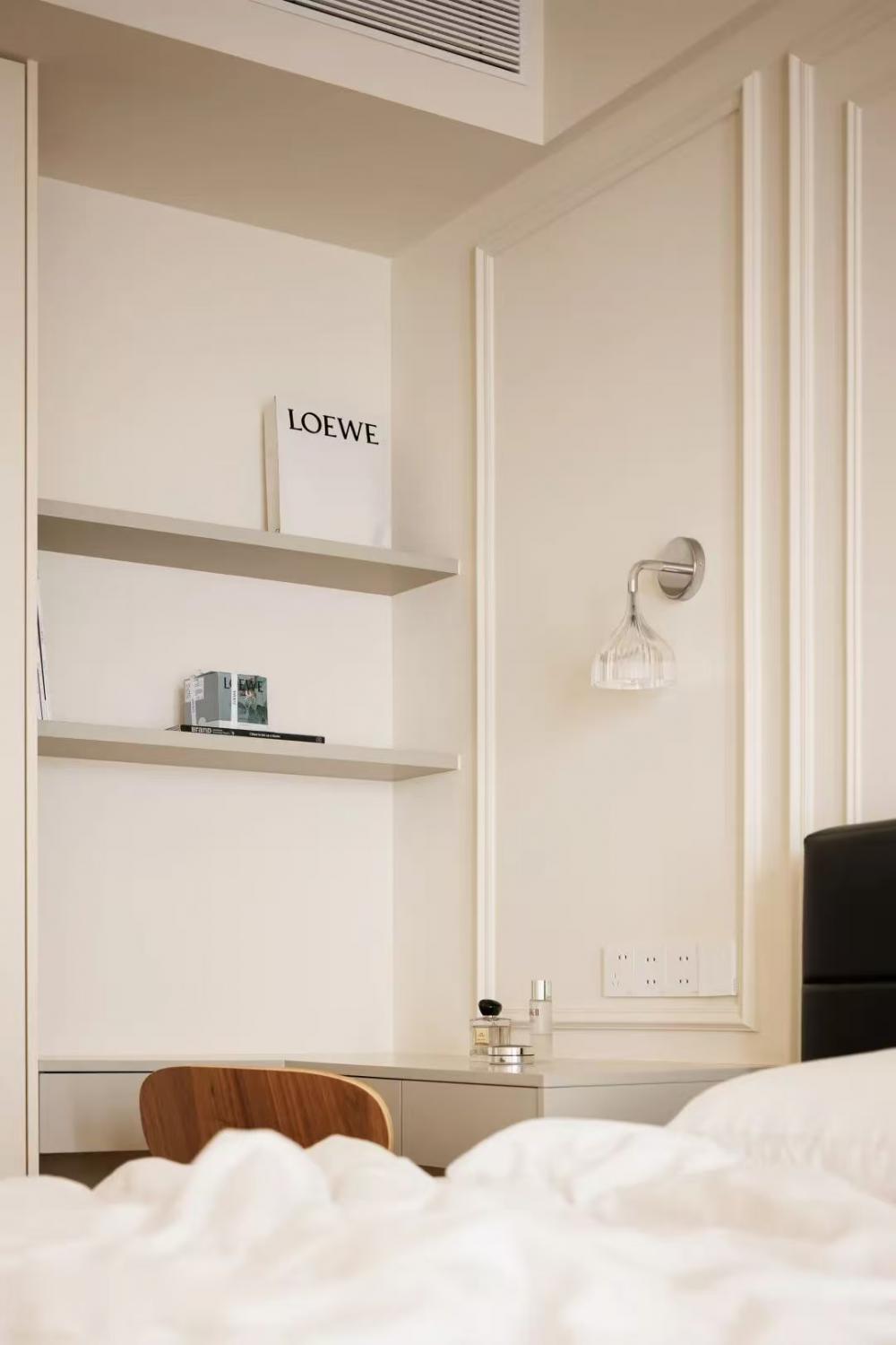 屋主是一對(duì)年輕的夫婦。他們對(duì)家的構(gòu)想是要舒適和耐看的,在風(fēng)格上則偏愛復(fù)古,但卻不是濃墨重彩的,就像擁有大面積淺色作為基礎(chǔ)。 公區(qū)整體以開放性為主,寬敞透亮的橫廳,墻面與柜體統(tǒng)一的可可燕麥色讓空間充滿優(yōu)雅的氛圍,溫潤感十足。人字紋木地面配以裝飾的石膏線條進(jìn)行點(diǎn)綴,讓整體呈現(xiàn)輕巧的精致感。 客廳旁,島臺(tái)與餐桌組合形成的餐廳洄游動(dòng)線是家的中心位置。 由于餐廳上方存在一根位置較低的橫梁,設(shè)計(jì)師結(jié)合這道“顯性”的界線,將島臺(tái)與餐桌恰到好處的安放,既避免了餐桌在梁的正下方,同時(shí)也讓餐廳擁有舒適的過道寬度。 餐桌對(duì)面,鏡面水吧臺(tái)結(jié)合的一整面收納柜體承擔(dān)了客餐廳的收納需求。 朝向廚房的一側(cè),則被分為島臺(tái)上下水管線及設(shè)備放置區(qū)域+廚房小家電收納的補(bǔ)充區(qū)域。 推開廚房的鐵藝玻璃門,這里的復(fù)古柔光小磚墻面,深色櫥柜,灰色花磚,相較于公區(qū)統(tǒng)一色調(diào)更多了一份豐富的層次美感。由于原始廚房面積受墻體限制無法改擴(kuò),為了保證設(shè)計(jì)后的廚房擁有充足的操作臺(tái)面、儲(chǔ)物區(qū)域與行走空間,設(shè)計(jì)師將冰箱進(jìn)行了外置處理。 與廚房相鄰的折疊門后,是屬于書房空間。壁紙搭配鐵藝門,復(fù)古味顯得更為具體。 從玄關(guān)角度看整個(gè)家,在拆除原有次臥的部分墻體后,讓走廊長度和視線得到延伸,讓空間更顯通透。沿著走廊,便可通向臥室區(qū)域 主臥延續(xù)了公區(qū)的氛圍感,結(jié)合現(xiàn)場(chǎng)尺寸設(shè)置了整面長6.7m的衣柜,最大化滿足屋主收納需求。增加梳妝臺(tái)的區(qū)域,墻面置物架,黑色床頭搭配純白的床品,墻面裝飾性線框和中古感壁燈不對(duì)稱感設(shè)計(jì),慵懶而又淡雅的氣質(zhì)盡顯。 主衛(wèi)長臺(tái)盆設(shè)計(jì),鏡面同樣也是半圓弧設(shè)計(jì)并且暗藏?zé)魩?,胡桃木洗手臺(tái)柜門,淋浴間采用黃銅門框+玻璃設(shè)計(jì),簡潔卻充滿復(fù)古的味道。 次臥暫時(shí)作為客房使用,將來會(huì)成為家中的兒童房,整體營造出舒適的休息區(qū)域。 公衛(wèi)依舊是復(fù)古鐵藝門和黃銅把手的搭配,整個(gè)公區(qū)在門的形體上統(tǒng)一且相互呼應(yīng)。門外是與冰箱相連的組合家政柜,不落地設(shè)計(jì),為掃地機(jī)器人預(yù)留了收納空間,洗烘一體,將清潔功能整合于此,形成小型且便捷的家政空間。