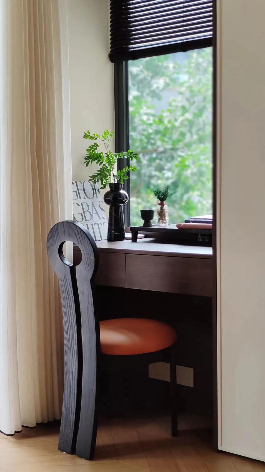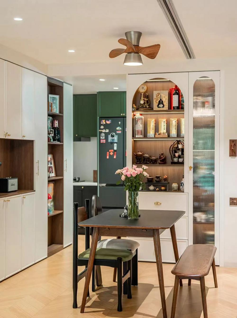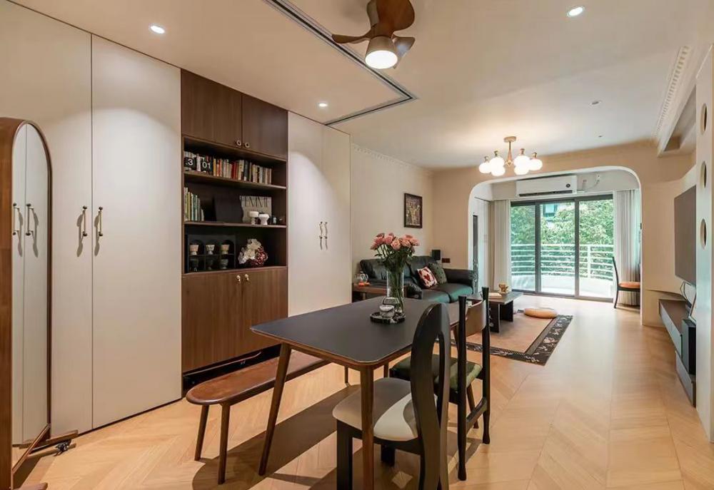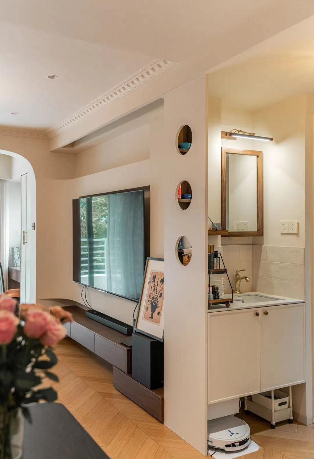 這套83㎡舊房,屋主是鐘愛胡桃木女主人與酷黑風(fēng)格男主人。在升級三室兩廳兩衛(wèi)格局(增玄關(guān)/主衛(wèi)、開放式廚房、變形餐廳)的同時(shí),用留白襯托黑棕主調(diào)。筆直線條的胡桃木柜體與黑色金屬碰撞,剛?cè)岵?jì)的設(shè)計(jì)既保留深色質(zhì)感,又通過光線層次營造精致浪漫的共生空間。 入戶改造后實(shí)現(xiàn)了獨(dú)立的玄關(guān)區(qū)域,收納空間直接倍增,增加玄關(guān)端景,開門見喜! 客廳陽臺門外推,即保留了陽臺的透氣性以及偶爾曬衣服的功能,又使客廳的使用面積擴(kuò)大。以簡約圓潤的弧形元素,賦予空間高級雅致感覺。 納入室內(nèi)的陽臺空間一側(cè)是洗衣機(jī)烘干機(jī),一邊是開放式辦公區(qū)。 陽臺半留半封的設(shè)計(jì)真的很nice,值得借鑒。 整個餐廳部分配色與客廳一致,整體留白居多,用黑色與胡桃木跳色,簡約溫馨有格調(diào)。 餐廳有個隱藏功能,可以秒變成一個小臥室,是為將來做準(zhǔn)備的,天花上面預(yù)留軌道,柜門里面藏起來的是推拉門,放上折疊床,把門一拉就是一個小臥室。 餐桌對面設(shè)計(jì)了餐邊柜,這里主要是男屋主的咖啡區(qū)以及杯子的收納區(qū)。 開放式廚房確實(shí)很適合他們,兩人平時(shí)工作都很忙,在家做飯的次數(shù)比較少,廚房的功能是夠用就好。 公衛(wèi)重新改造成了干濕分離,洗手臺外置,精致的屋主臺面的置物架放滿了女主人的護(hù)膚品。 主臥墻面添加法式線條元素,提升空間精致度。飄窗做收納柜,可做臥室生活雜物收納,增加空間收納。 主衛(wèi),用了屋主喜歡的復(fù)古小兔子磚,上墻是純凈的黑與白,下墻用淡雅的粉色搭配,粉黑搭配甜而不膩,使空間更加俏皮可愛。 次臥的清爽復(fù)古風(fēng),床,床頭柜,四件套等都是選了深色復(fù)古款。床尾的書桌做了一個圓弧內(nèi)凹的造型,打薄了墻體的厚度,給空間增加了深度的使用空間。 輕法式衛(wèi)生間,墨綠色的瓷磚搭配法式燕子磚,極具復(fù)古特性,提升空間層次感。馬桶水箱上方?jīng)]有做封閉的柜子,而是選擇了用編織收納籃,讓整個洗手間更有一種鄉(xiāng)村的休閑感,框內(nèi)放置的都是常用品。