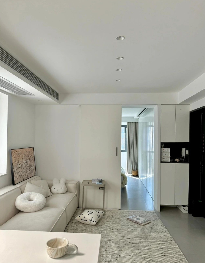 ??建筑面積64m2|使用面積:50m2 —————————————————— ?? | 設計分享?? ???????? - 1、去繁求簡,不要復雜的裝飾,保證實用性的前提下盡量把空間打開。 2、可躺平的沙發(fā),大屏的電視 3、考慮做飯比較少,做開放式廚房,形成客餐廚一體化,讓空間具有延升感 4、保證衛(wèi)生間品質,每天的使用時間僅次于臥室睡覺時間 5、全屋整體規(guī)劃收納設計,提升儲物空間效率