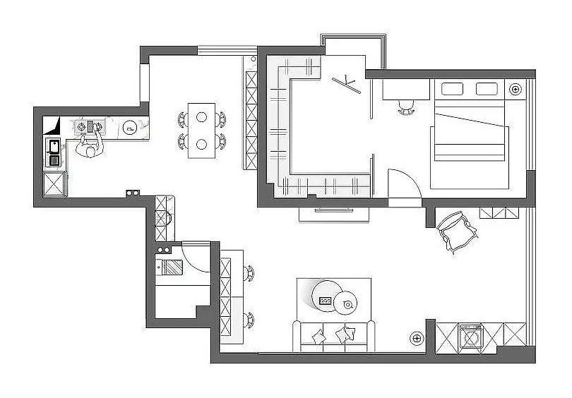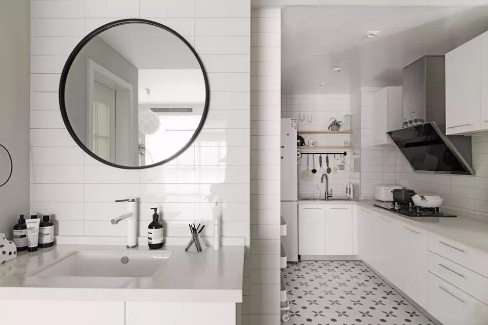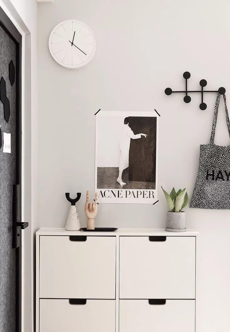 今天分享的是一套建筑面積70平米的簡約風小戶型案例,房子原本的結構是有著兩個比較小的臥室,但對于單身獨居的屋主來說,只做一間房更為符合自身的需求,所以就把次臥和主臥連起來,做出了一個臥室?guī)б旅遍g的設計。 入戶門的側方擺放了一個成品窄鞋柜,鞋柜上方是裝飾品、裝飾畫、時鐘和掛衣鉤,雖然玄關面積不大,但元素很豐富。 餐廳和玄關位于同一個空間,餐桌椅擺放在過道處,靠墻做了到頂?shù)牟瓦吂瘢虚g留空的區(qū)域可以擺放裝飾品和平時常用的東西。 廚房被設計成了開放式的,L型的櫥柜布局搭配小推車和墻面的收納很實用。廚房的邊上是衛(wèi)生間,洗手臺被放在了門外,使用更為方便。 客廳的配色以灰色、白色為主,沙發(fā)背景墻上做掛畫裝飾,上方搭配幾盞筒燈。淺灰色的布藝沙發(fā)和幾何地毯、北歐風小茶幾結合起來,營造出簡單輕松的感覺。 陽臺和客廳之間不做隔斷,在陽臺的一側做上到頂?shù)臋还?,洗衣機也被嵌入了柜子當中,讓整個空間看起來更為簡潔大方。 電視背景墻選擇了刷成白色,在電視的邊上做了一部分的裝飾,客廳的角落里還布置了一張長書桌,方便在這里辦公和學習。 臥室的床頭背景墻刷成了灰色調(diào),搭配白色的靠背和床品,百葉簾把陽光分隔后照進室內(nèi),讓人感覺非常的舒適。 在臥室的另一側就是次臥改造的衣帽間了,黑框玻璃推拉門給臥室增添了一些格調(diào)感,用書桌來代替一側的床頭柜,也方便日常使用。 衛(wèi)生間內(nèi)部沒有做干濕分離,地面鋪貼黑白灰的地磚,搭配整體白色為主的空間氛圍,顯得簡潔而又有設計感。
