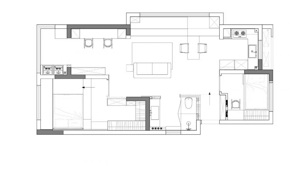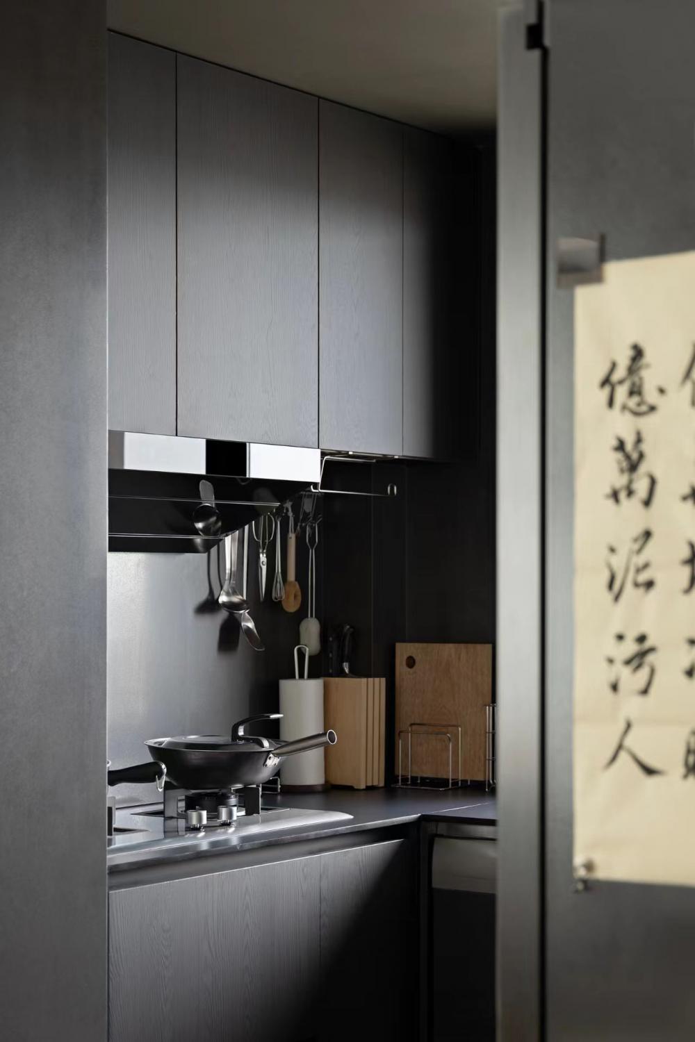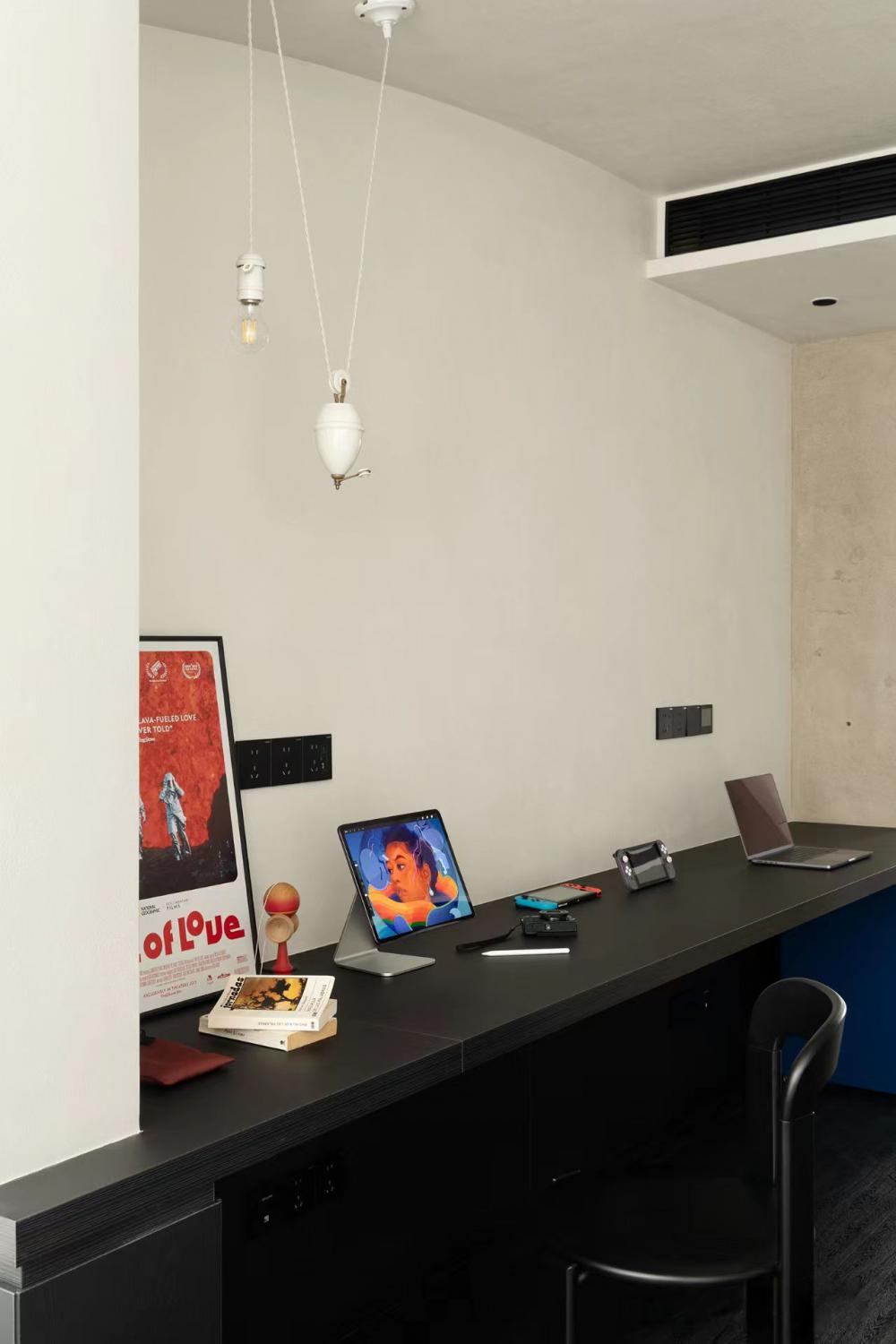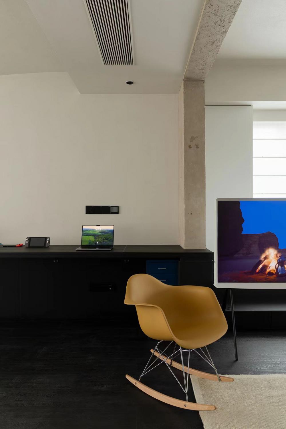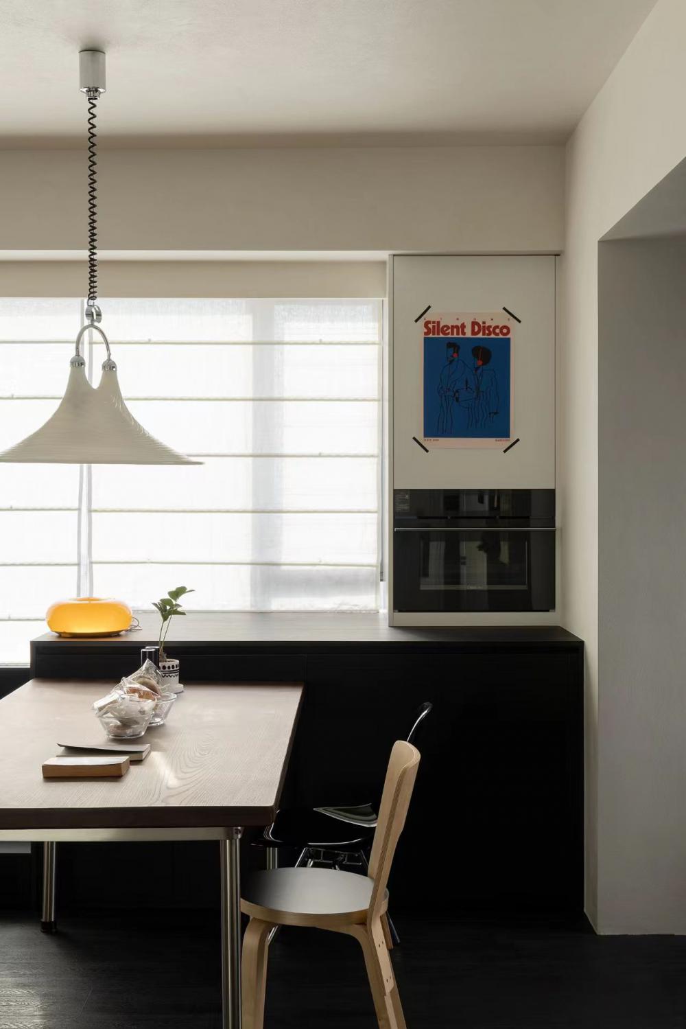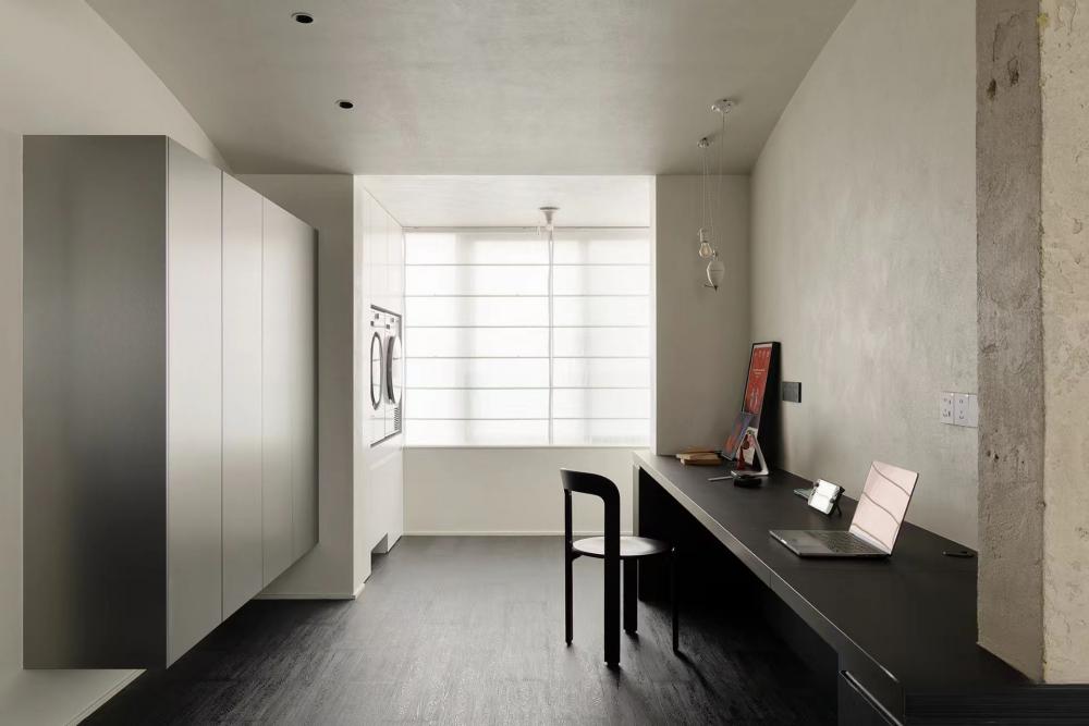 屋主對于新家有著不將就的追求,不僅需適應生活方式,還得滿足興趣愛好,如養(yǎng)寵、電競、品咖啡,并融入侘寂與黑白極簡風格。在102平的空間里,按需調(diào)整布局,優(yōu)化空間,最終打造出屋主理想中的“慵懶通透、寬敞有細節(jié)、略帶酷感”的居所。 沉式玄關無疑是實用與美觀的完美結(jié)合。它不僅能夠有效隔絕外界灰塵,還以其獨特的設計感,成為家中的一道亮麗風景線。搭配黑色懸空柜,簡約而不失格調(diào),為家增添一份工業(yè)風的時尚韻味。 為了滿足屋主對空間的多樣化需求,將一間次臥巧妙改造成開放式書房,使公區(qū)空間更加通透與開闊。木飾面與黑色仿木紋瓷磚的巧妙融合,輔以木質(zhì)元素與金屬修飾,營造出一種溫馨而又不失時尚的氛圍。 利用飄窗空間,巧妙增添了儲物功能,并結(jié)合木質(zhì)桌面的餐桌,形成“餐島一體”的設計,既滿足了日常用餐需求,又兼顧了咖啡制作的操作空間。 寬敞舒適的客廳是屋主的愿景,未來更是孩子的游玩天地。因此,特別注重儲物空間的打造,并巧妙采用隱形設計,以滿足屋主對整潔與美觀的雙重追求。 將連接陽臺的臥室改造成雙人電腦書房。延續(xù)飄窗的黑色木紋,打造了一張寬敞的黑色長桌,足以容納各種電子設備。 弧形吊頂?shù)那擅钤O計,不僅進一步區(qū)分了空間,還為簡約的陽臺空間注入了一絲柔和與溫馨。一側(cè)定制柜內(nèi)嵌入洗衣機與烘干機,另一側(cè)則擺放著寵物用品,既實用又美觀。 對于小空間而言,動線優(yōu)化至關重要。將原始衛(wèi)生間入口改至客廳,實現(xiàn)了三分離設計,使空間更加寬敞與實用。 主臥門同樣采用極簡設計,左側(cè)墻面上的小壁龕則為空間增添了一份設計感與層次感。 為了滿足屋主對衣帽間的需求,將主衛(wèi)改造成步入式衣帽間,采用U型布局提升儲物效率。 木地板的溫暖觸感與整體色彩與材質(zhì)的搭配相得益彰,營造出一種隨心而愜意的生活氛圍。