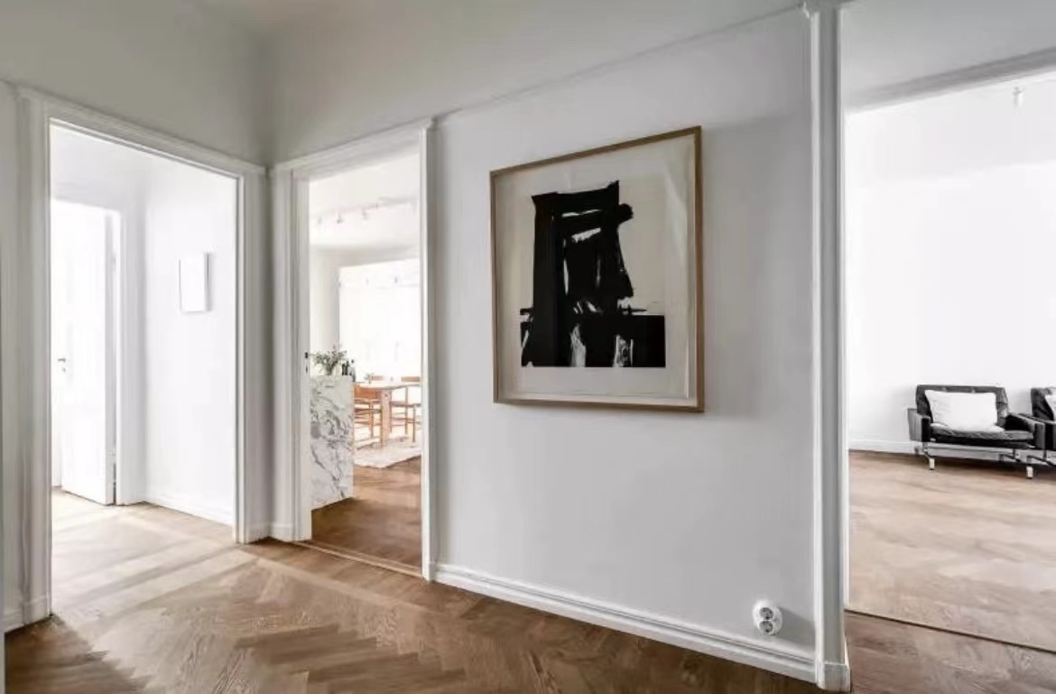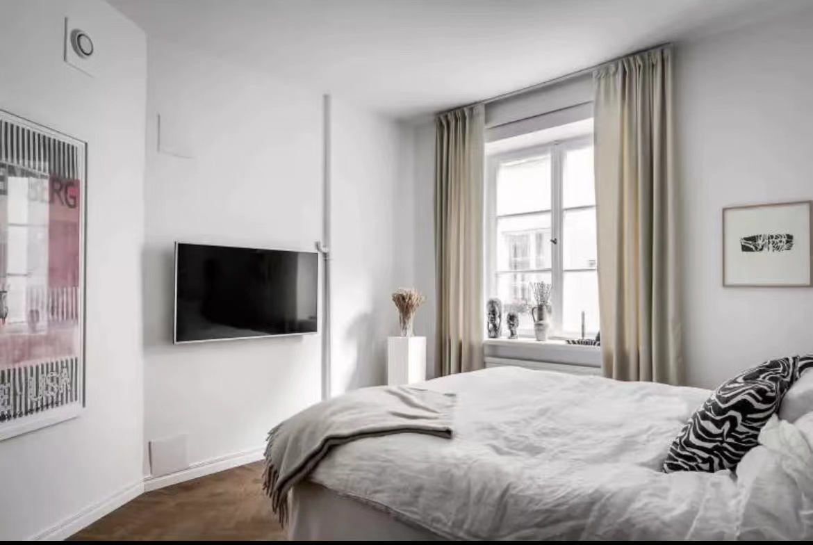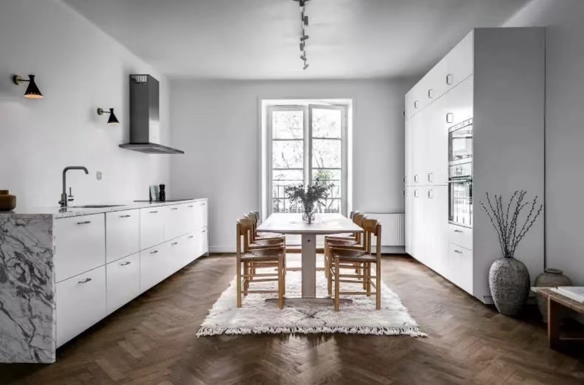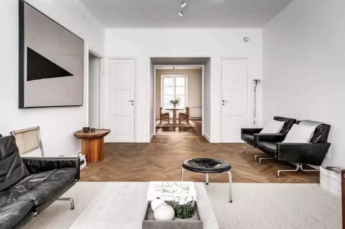 公寓的天花板直接“裸露”出來,沒有采用吊頂,令層高更顯突出。白色+原木色的主調設計,大氣天然。