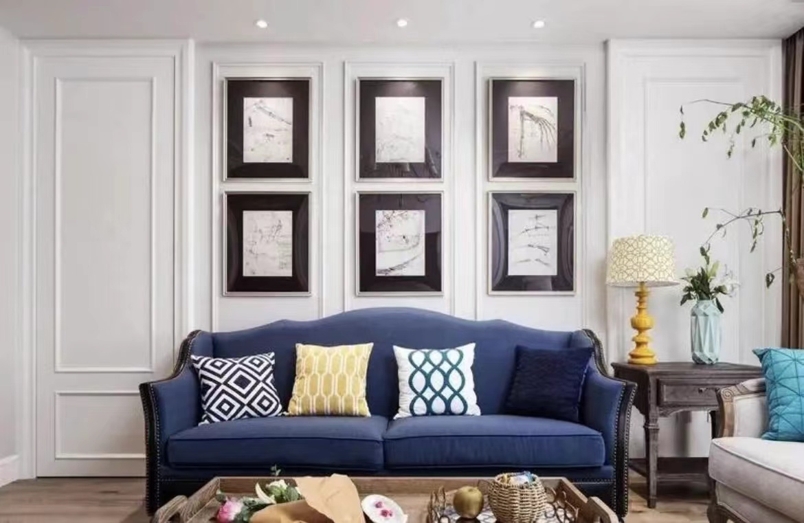 沙發(fā)背景墻設(shè)計了六幅掛畫,大理石紋路,簡單有逼格。藍色布藝沙發(fā),搭配時尚抱枕,與臺燈花紋相互呼應。
