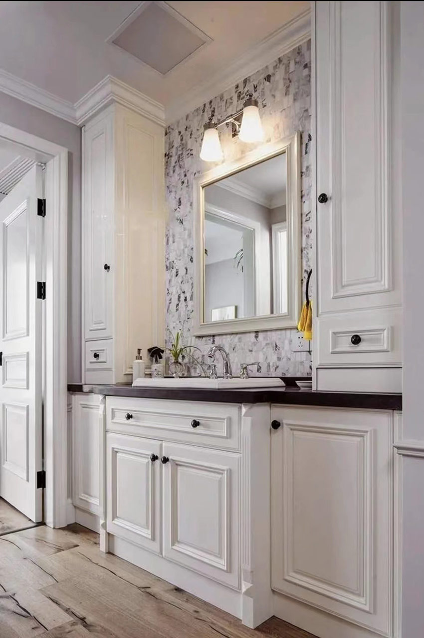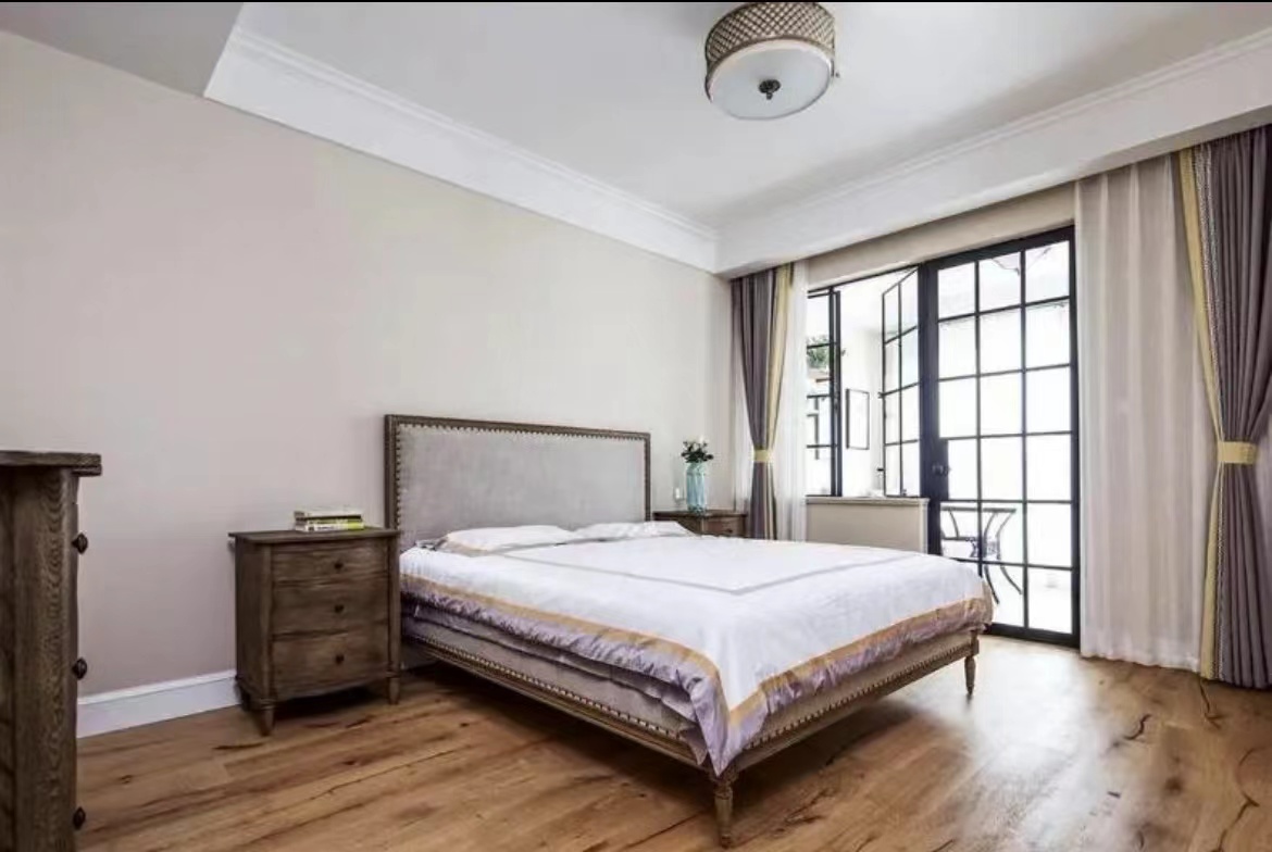 臥室空間設(shè)置了豐富的收納形式,出來一柜到底的衣柜,還有多個床頭柜、儲物柜,充分滿足空間的收納需求。床板和柜體都采用了做舊處理,營造 一種復古的氛圍。