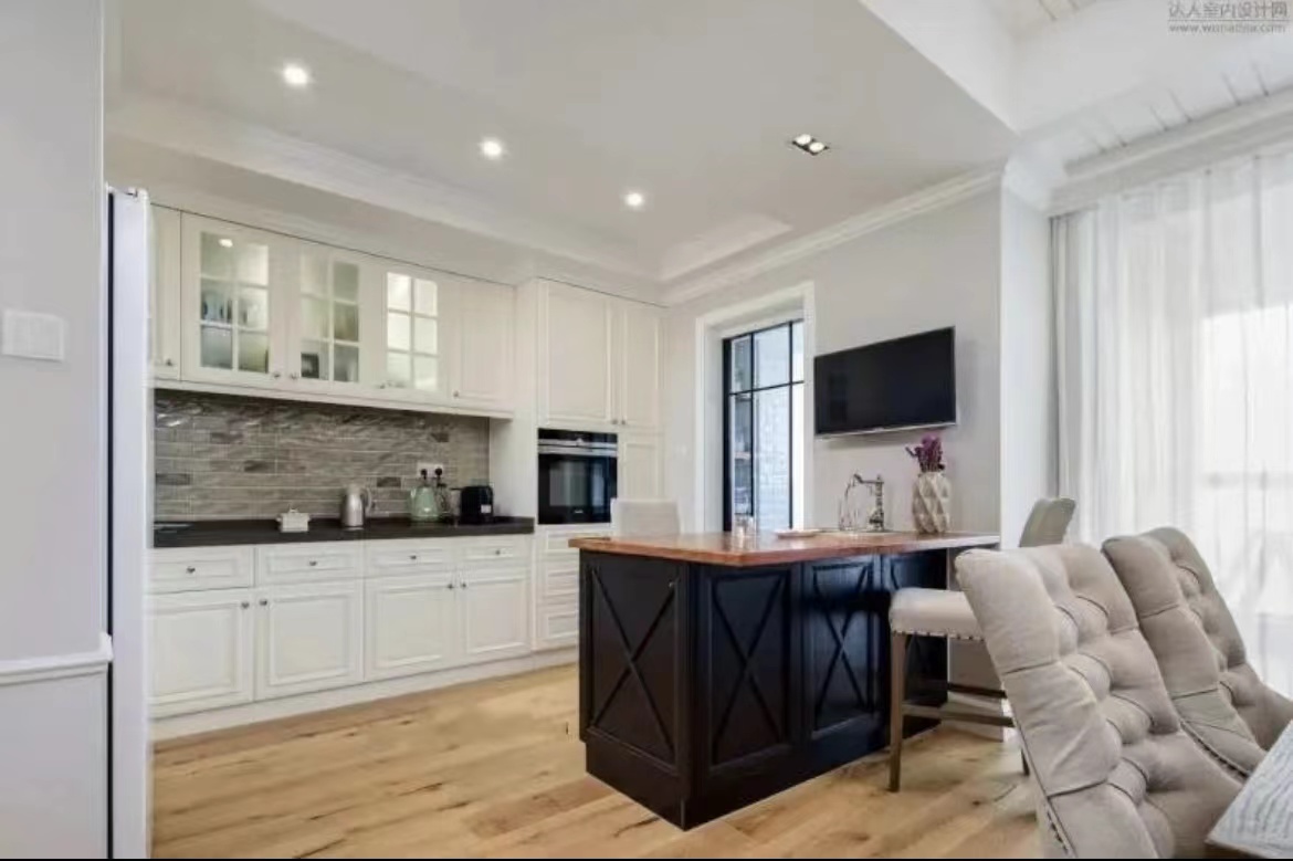 開放式的西式廚房為黑白色調(diào),出來基本發(fā)收納空間,還有一個專門的料理臺,既可以在這里處理食材,也可以在此小酌,實用功能強大。