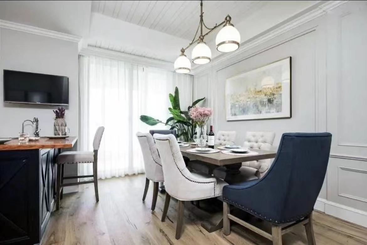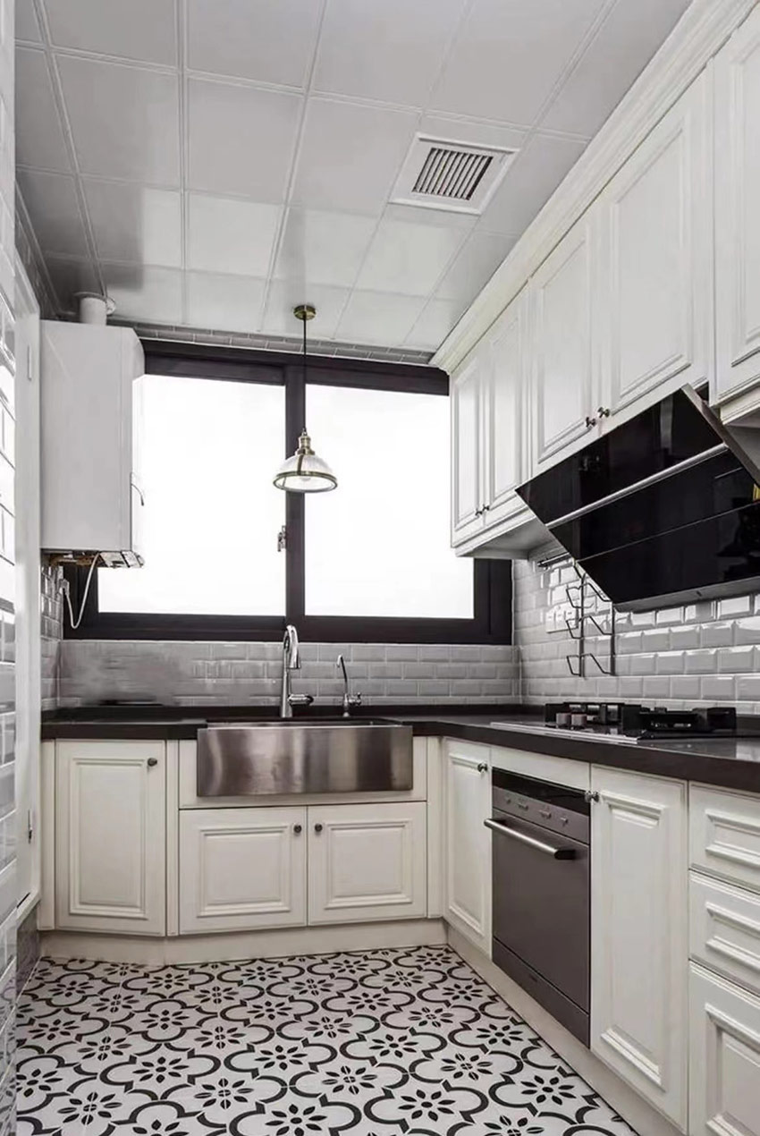 中式餐廳的櫥柜和家電色調(diào)延續(xù)了西餐區(qū)的設(shè)置,但是不同于西餐區(qū)的木地板,這里為了更加方便打理,鋪的是花紋瓷磚,空間也因此顯得不那么單調(diào)。 |