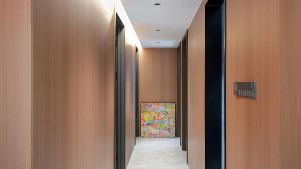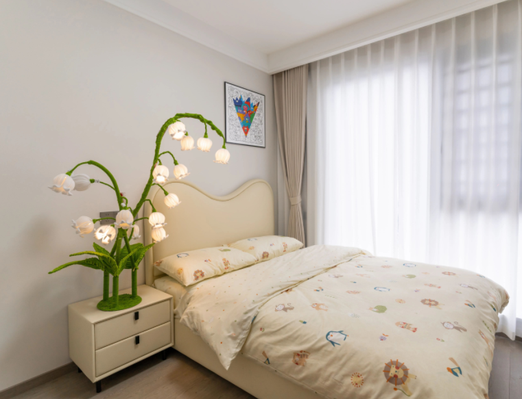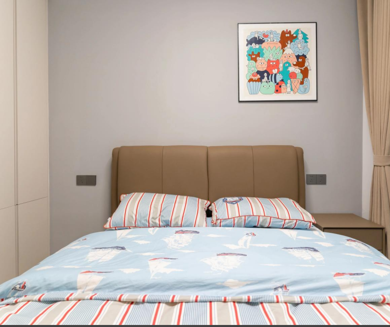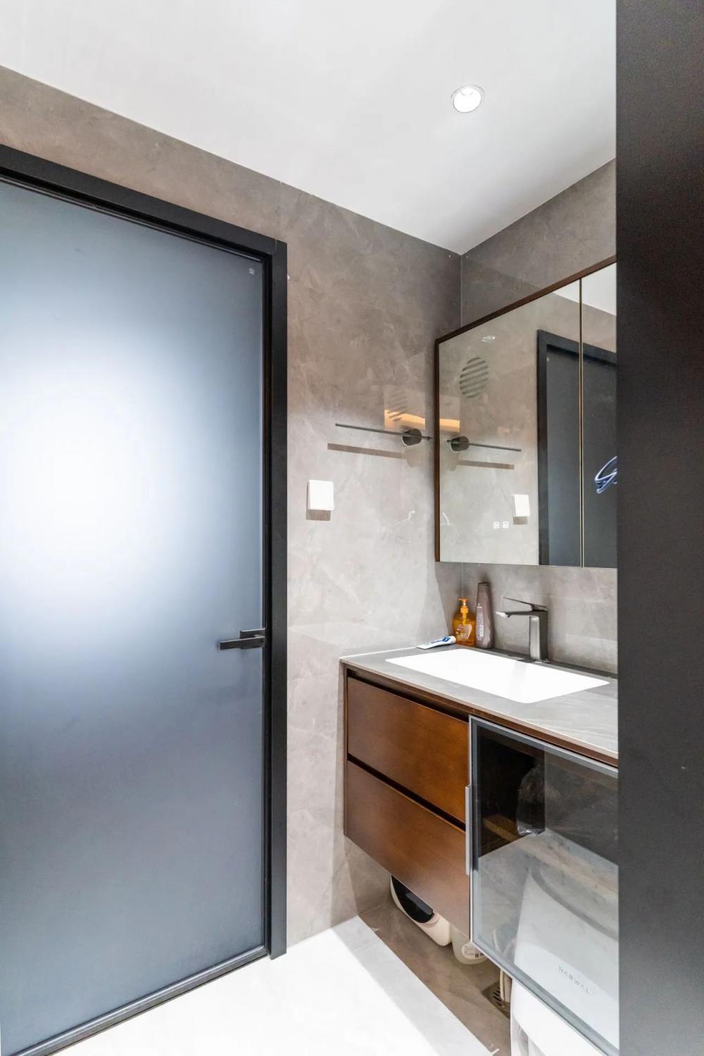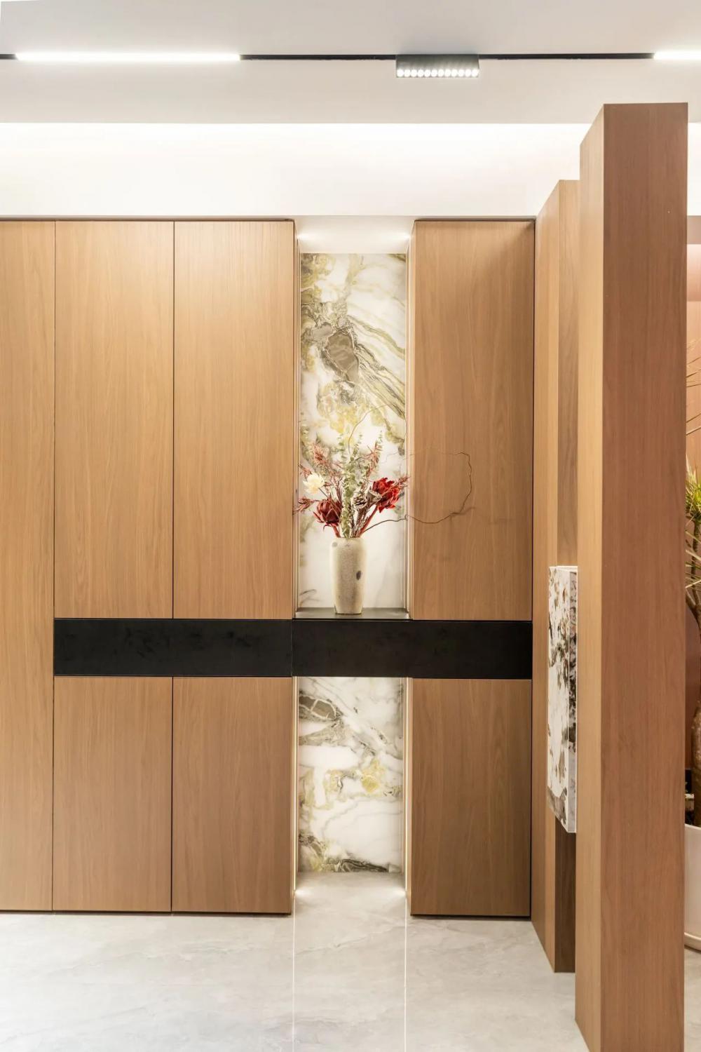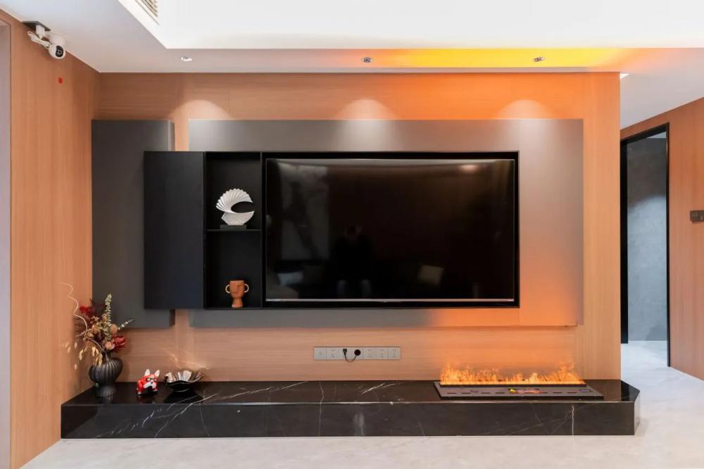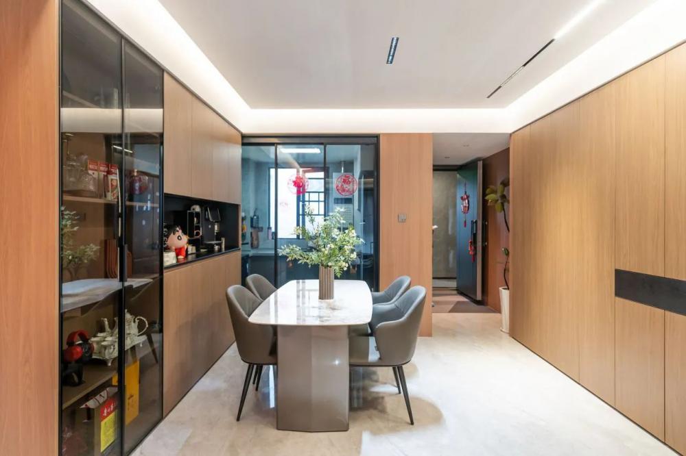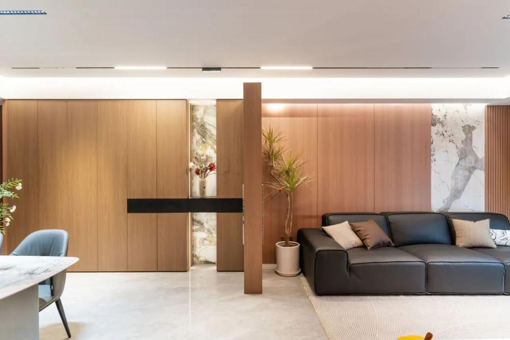 意式輕奢風(fēng)格打造118㎡四室兩衛(wèi)的高端居住空間,黑白棕色調(diào)相互交融,呈現(xiàn)出低調(diào)而奢華的視覺體驗??蛷d墻面運用木飾面與大理石拼接,增強整體空間的連貫性與層次感。沉穩(wěn)的黑色沙發(fā)搭配柔和的暖色抱枕,營造出雅致而舒適的氛圍。整體布局簡約流暢,既保證了美學(xué)表達,又兼具居住的實用性。 本戶型動靜分區(qū)合理??筒蛷N一體化設(shè)計增強空間感,主臥帶獨立衣帽間,提升居住舒適度。兩間次臥功能齊全,可作兒童房或書房。雙衛(wèi)生間布局,方便日常使用。 玄關(guān)采用夾吊設(shè)計巧妙隔斷客餐廳,木飾面搭配大理石背景,質(zhì)感高級。內(nèi)嵌燈帶提升氛圍感,結(jié)合花藝裝飾,增添精致美感。 ▲?以黑白棕為主色調(diào),木飾面與大理石結(jié)合,營造輕奢質(zhì)感。無主燈設(shè)計搭配隱藏?zé)魩?,增強空間層次。落地窗引入自然光,提升通透感。 ▲?背景墻采用胡桃木護墻板+潘多拉巖板,提升空間質(zhì)感。隱藏?zé)魩岷驼彰?,營造溫馨氛圍。黑色皮質(zhì)沙發(fā)與軟裝細節(jié),增添內(nèi)斂氣息。 ▲?電視背景墻采用胡桃木與黑色大理石搭配,地臺延展視覺層次。內(nèi)嵌火焰壁爐,增添溫暖氛圍,打造現(xiàn)代雅致的客廳焦點 ▲?陽臺巧用嵌入式設(shè)計,洗烘套裝與收納柜一體化,保持空間整潔。木質(zhì)護墻搭配淺色窗簾,自然溫馨,提升整體的生活質(zhì)感。 ▲?從陽臺望向公區(qū),溫潤木飾面與大理石交融,光影層次豐富。開放式布局串聯(lián)客餐廳,壁爐氤氳暖意,黑色皮沙發(fā)增添穩(wěn)重質(zhì)感。 ▲?客餐廳一體化設(shè)計,大理石點綴增添高級感。隱藏式收納保持整潔,黑色皮沙發(fā)與綠植相映,塑造舒適而不失格調(diào)的居家氛圍。 ▲?餐廳延續(xù)原木與大理石的溫潤質(zhì)感,通頂收納柜融入玻璃元素,兼具實用與展示功能。圓角餐桌搭配灰色皮質(zhì)餐椅,溫馨的用餐氛圍。 ▲?過道采用胡桃木護墻板,溫潤木質(zhì)感延伸空間層次,嵌入式燈帶勾勒柔和光影,盡顯簡約格調(diào),一幅跳色藝術(shù)畫點綴,增添趣味與個性。 ▲?兒童房無吊頂設(shè)計,通刷淺灰乳膠漆,奶油色軟包床,溫馨柔和。灰白布簾,調(diào)節(jié)光線自由,趣味床品與個性花藝燈點綴童趣氛圍。 ▲?男孩房以藍色航海主題床品為亮點,搭配簡約棕色軟包床頭,營造沉穩(wěn)氛圍。趣味插畫裝飾墻面,增添活力,讓空間兼具童趣與舒適感。 ▲?L型懸浮式書桌與書柜巧妙結(jié)合,提供充足收納與寬敞工作空間。人體工學(xué)椅提升舒適度,百葉窗柔和采光,使書房既實用又富有現(xiàn)代感。