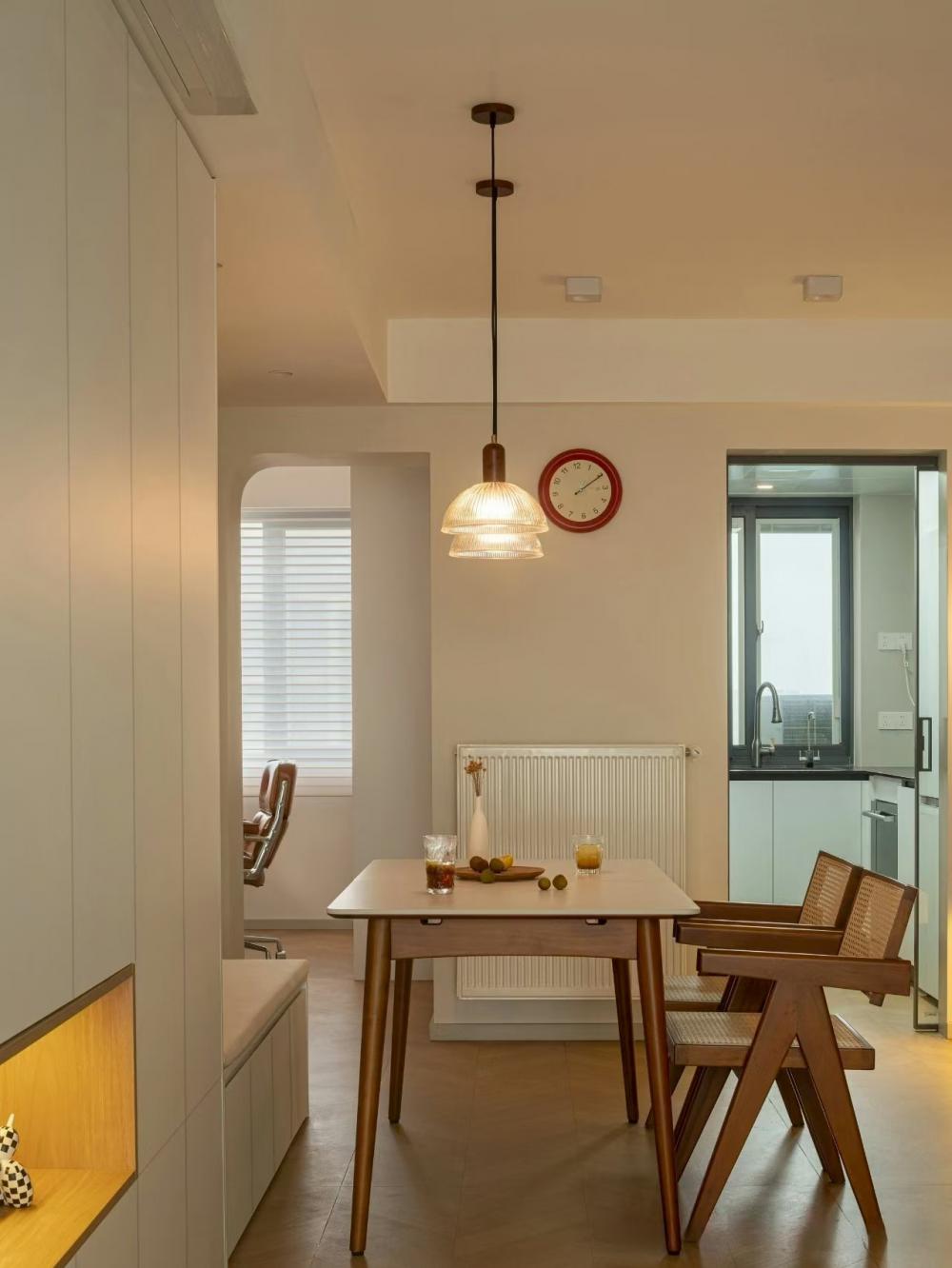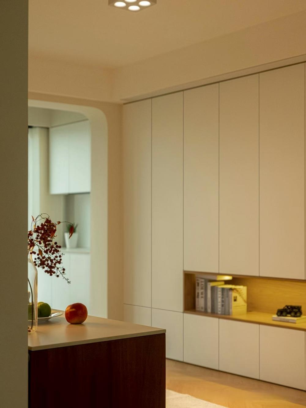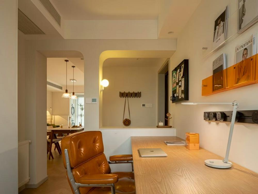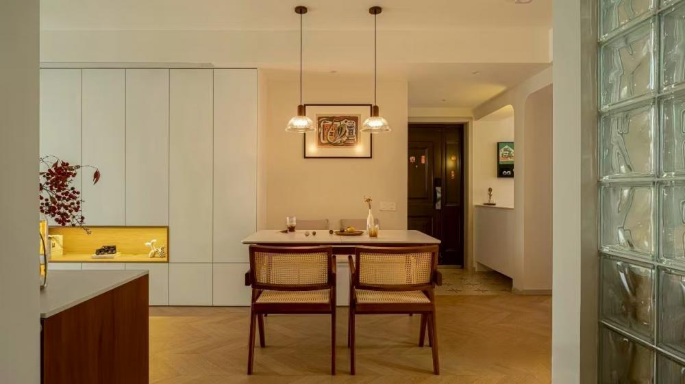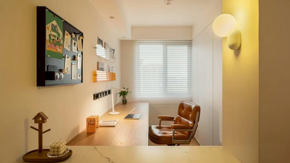 入戶設(shè)置一處端景,原戶型并無此面墻體,這樣的設(shè)計避免了入戶直視全屋,開門見景,又可以作為室內(nèi)外過渡緩沖的空間。 客廳以柔潤的香草色為基調(diào),淡淡的暖調(diào)中透著清爽,帶給人治愈與放松感,創(chuàng)造了一個令人愉悅的環(huán)境,一切看起來都很平衡。 沙發(fā)背景墻一側(cè)加入方格造型的石膏肌理板,塑造了墻面的立體感,細膩的質(zhì)感也讓空間更顯高級。 由整面的封閉式柜體打造出電視背景墻,視覺上更加“整齊劃一”,中間鏤空一處作為展示性收納,滿足多種收納需求,內(nèi)置燈帶,增添了空間的層次感,給人一種靈活多變的空間效果。 門廳一側(cè)的墻面安裝了胡桃木色的琴鍵衣帽鉤,提升立面空間的收納利用,進門之后掛包包、鑰匙之類的很方便,既美觀又實用。 穿過門廳來到餐廳,干凈清爽的色調(diào)給視覺感官帶來順滑的輕柔感,讓安謐舒適的氛圍縈繞于整屋之中。 餐桌+餐椅+卡座的組合方式,將美感與實用完美結(jié)合;胡桃木、巖板、藤編的材質(zhì)相互中和,簡約中透露出復(fù)古,清新又沉穩(wěn)的配色為空間注入融融暖意。 由電視柜延伸定制卡座,讓空間更加連貫統(tǒng)一,下方的地柜增添了餐廳的收納,舒適與實用相結(jié)合。 U型廚房的設(shè)計,將部分的廚房家電嵌入至櫥柜中,保障空間使用的流暢性與整潔。白色櫥柜與黑色臺面形成強烈對比,使空間看起來更有層次和深度,營造出簡潔、時尚的廚房環(huán)境。 半開放式的書房,定制一款長書桌,原木的色調(diào)為室內(nèi)空間增添一份自然、溫馨的氣息;搭配一把棕色的真皮辦公椅,為居家辦公和休閑營造出放松又愜意的棲息地。 半開放式的書房,定制一款長書桌,原木的色調(diào)為室內(nèi)空間增添一份自然、溫馨的氣息;搭配一把棕色的真皮辦公椅,為居家辦公和休閑營造出放松又愜意的棲息地。 通過戶型改造,在公區(qū)的走廊處設(shè)置獨立洗手臺,從而提高家庭的使用效率。利用玻璃磚作為墻體隔斷,半透明的效果保證了私密,又不影響采光,避免了客餐廳直視的尷尬。 臥室,一種恬淡安寧的感覺鋪面而來,使人感到放松和舒適。穿過拱形門洞,即可進入步入式衣帽間和主衛(wèi),通過戶型改造讓空間的功能劃分更加合理和便捷。