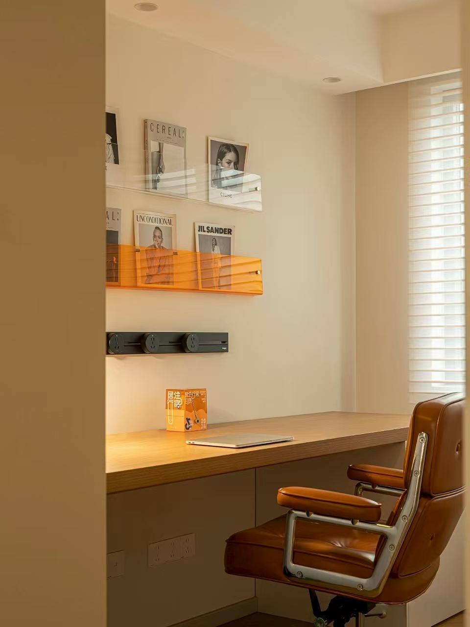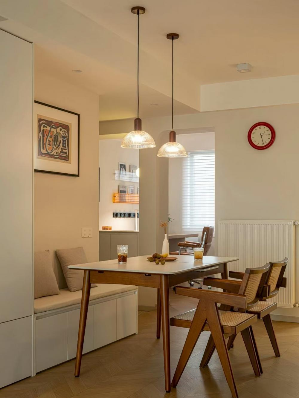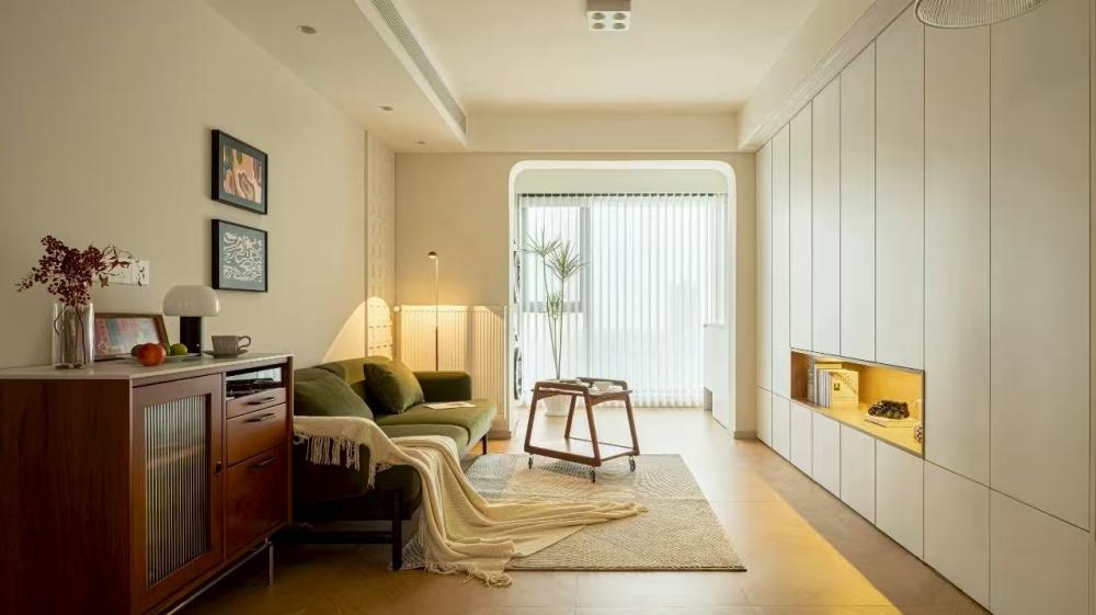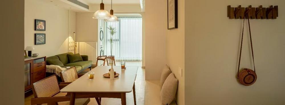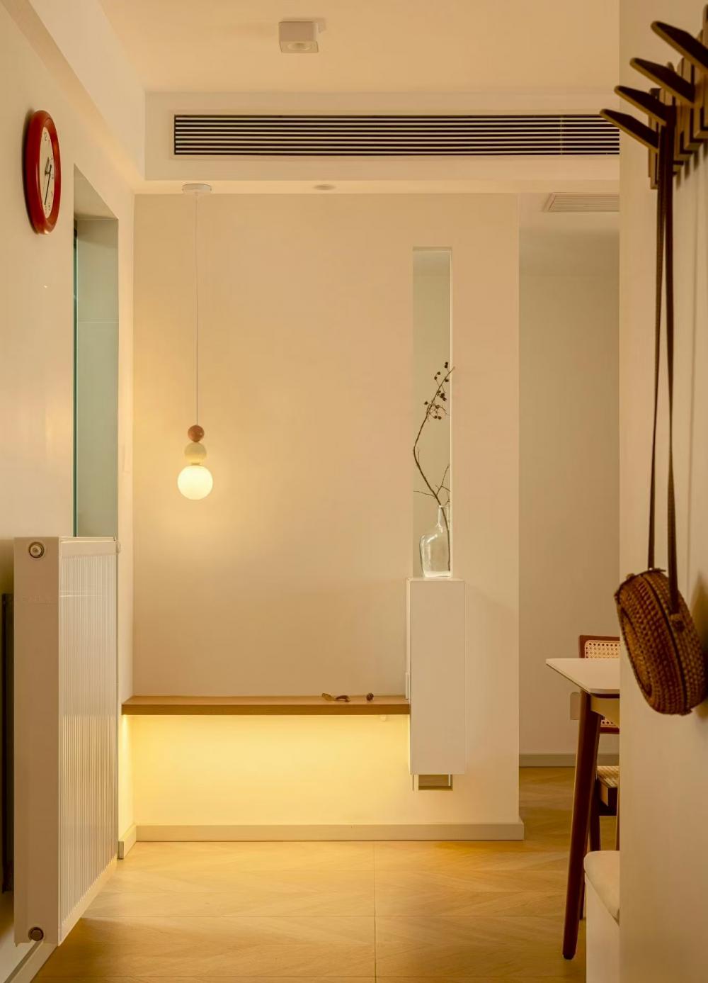 入戶設(shè)置一處端景,原戶型并無此面墻體,這樣的設(shè)計避免了入戶直視全屋,開門見景,又可以作為室內(nèi)外過渡緩沖的空間。 客廳以柔潤的香草色為基調(diào),淡淡的暖調(diào)中透著清爽,帶給人治愈與放松感,創(chuàng)造了一個令人愉悅的環(huán)境,一切看起來都很平衡。 沙發(fā)背景墻一側(cè)加入方格造型的石膏肌理板,塑造了墻面的立體感,細膩的質(zhì)感也讓空間更顯高級。 由整面的封閉式柜體打造出電視背景墻,視覺上更加“整齊劃一”,中間鏤空一處作為展示性收納,滿足多種收納需求,內(nèi)置燈帶,增添了空間的層次感,給人一種靈活多變的空間效果。 門廳一側(cè)的墻面安裝了胡桃木色的琴鍵衣帽鉤,提升立面空間的收納利用,進門之后掛包包、鑰匙之類的很方便,既美觀又實用。 穿過門廳來到餐廳,干凈清爽的色調(diào)給視覺感官帶來順滑的輕柔感,讓安謐舒適的氛圍縈繞于整屋之中。 餐桌+餐椅+卡座的組合方式,將美感與實用完美結(jié)合;胡桃木、巖板、藤編的材質(zhì)相互中和,簡約中透露出復(fù)古,清新又沉穩(wěn)的配色為空間注入融融暖意。 由電視柜延伸定制卡座,讓空間更加連貫統(tǒng)一,下方的地柜增添了餐廳的收納,舒適與實用相結(jié)合。 U型廚房的設(shè)計,將部分的廚房家電嵌入至櫥柜中,保障空間使用的流暢性與整潔。白色櫥柜與黑色臺面形成強烈對比,使空間看起來更有層次和深度,營造出簡潔、時尚的廚房環(huán)境。 半開放式的書房,定制一款長書桌,原木的色調(diào)為室內(nèi)空間增添一份自然、溫馨的氣息;搭配一把棕色的真皮辦公椅,為居家辦公和休閑營造出放松又愜意的棲息地。 半開放式的書房,定制一款長書桌,原木的色調(diào)為室內(nèi)空間增添一份自然、溫馨的氣息;搭配一把棕色的真皮辦公椅,為居家辦公和休閑營造出放松又愜意的棲息地。 通過戶型改造,在公區(qū)的走廊處設(shè)置獨立洗手臺,從而提高家庭的使用效率。利用玻璃磚作為墻體隔斷,半透明的效果保證了私密,又不影響采光,避免了客餐廳直視的尷尬。 臥室,一種恬淡安寧的感覺鋪面而來,使人感到放松和舒適。穿過拱形門洞,即可進入步入式衣帽間和主衛(wèi),通過戶型改造讓空間的功能劃分更加合理和便捷。