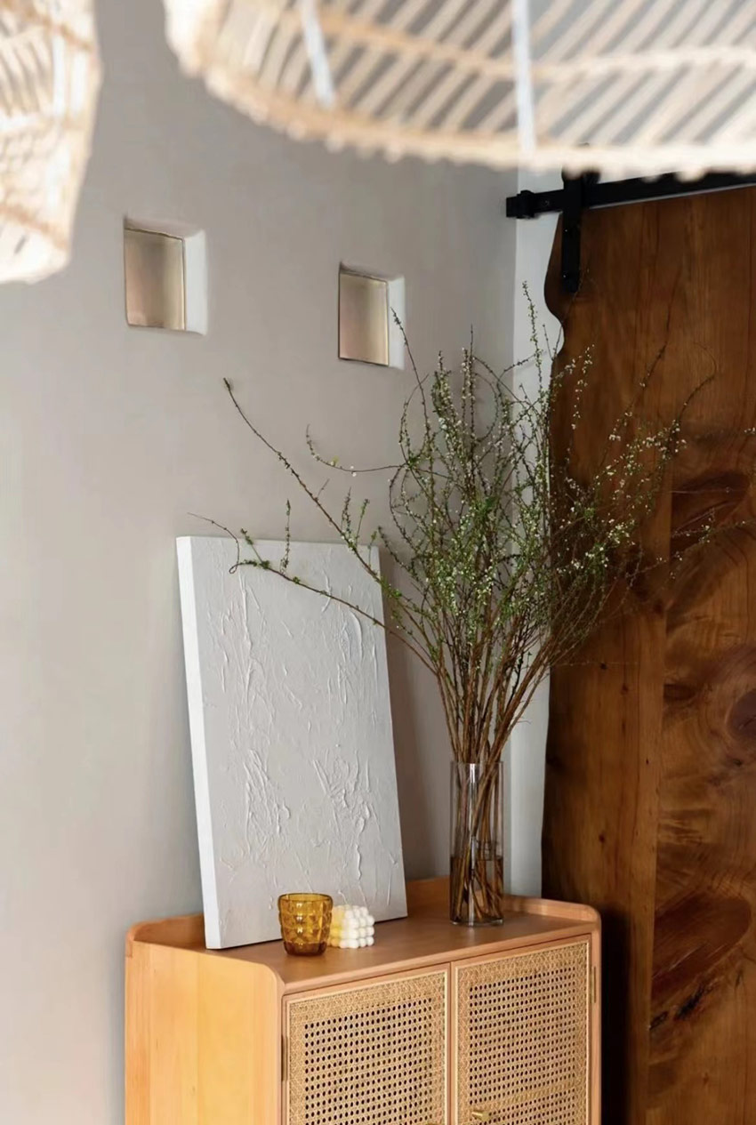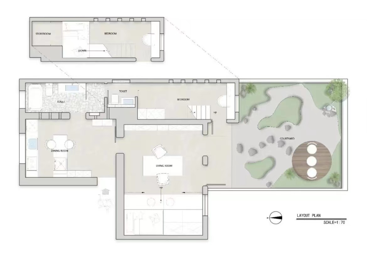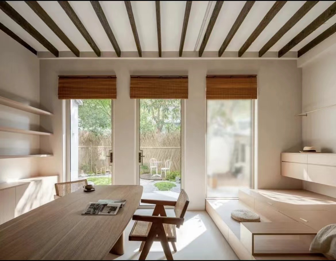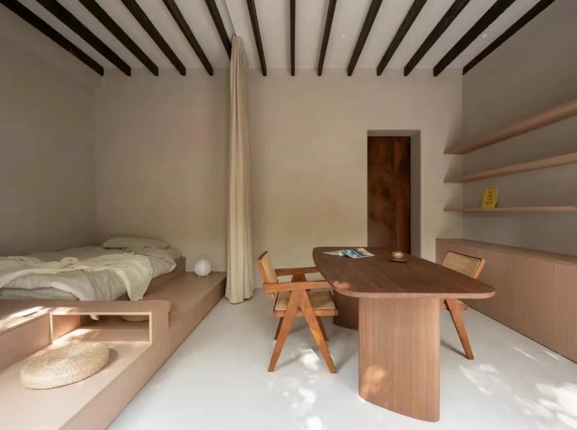 臥室和書房結(jié)合,用一道麻質(zhì)的窗簾作為隔斷,可開可合。