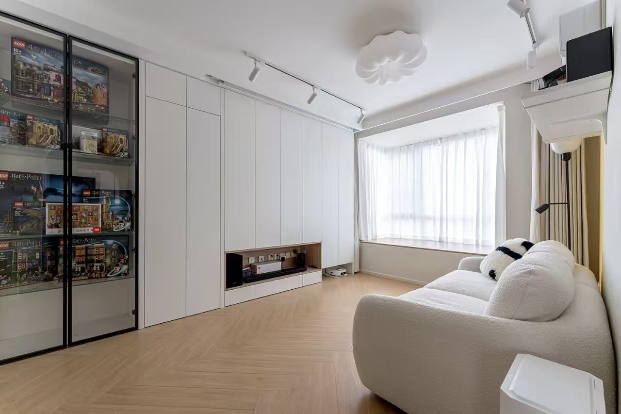 這是面積70㎡的新房,業(yè)主兩個人都是早九晚五的工作性質,偶爾也會在家里加加班。所以在家里單獨做了個書房。另外色彩上喜歡比較明快的色調,讓空間的氛圍感更顯活潑。 原始隔墻戶型圖,空間雖然很充足,但是沒有很好的規(guī)劃出每個區(qū)域的位置。大格局沒什么變,利用空間增設了不少收納,門廳前面做成弧形卡座,將其中一間臥室改造成書房。 入戶進門玄關處,圖中左側布置白色玄關柜搭配魚骨拼木地板,視覺自然敞亮,下方留出15CM高度收納室內拖鞋。落塵區(qū)鋪上黑白格地毯,右邊靠墻配一面全身鏡,滿足進出門可以整理妝容。 進來就是餐廳,白色玄關柜也起到餐邊柜的作用,中間凹槽可以收納裝飾品,還有飲水壺等,上方封閉式柜子可以收納大件物品,滿足收納需求。餐廳的轉角卡座是一體化定制,這邊做的恰到好處. 客廳取消茶幾桌,以奶油白搭配魚骨拼木地板,讓空間清爽又溫馨。把一整面墻打造成柜子,增加收納。 客廳望去餐廳方向,天花板無主大燈,簡約的白色墻面搭配人字拼木地板,增加空間的延展性,更顯大。 廚房進門左側位置,剛好可以收納一臺雙門冰箱,避免空間浪費,邊上就是烹飪區(qū),使用起來更加順手。 進入主臥室,轉角設計成納區(qū)。飄窗的設計使得空間更休閑,坐在飄窗上曬太陽。 房兼衣帽間,右邊玻璃已滿是進門處,蜂窩簾遮擋的是收納柜,以后方便再改造成臥室。橫跨整面墻的大書桌,輕松滿足雙人的辦公需求。 弧形門框進來,是衛(wèi)生間外置的洗手臺。一旁疊放洗烘機器,輕松解決大件電器擺放的突兀的問題。淋浴區(qū)保持墨綠色墻磚,獨特的紋理讓空間更顯立體,用浴簾做干濕分離。