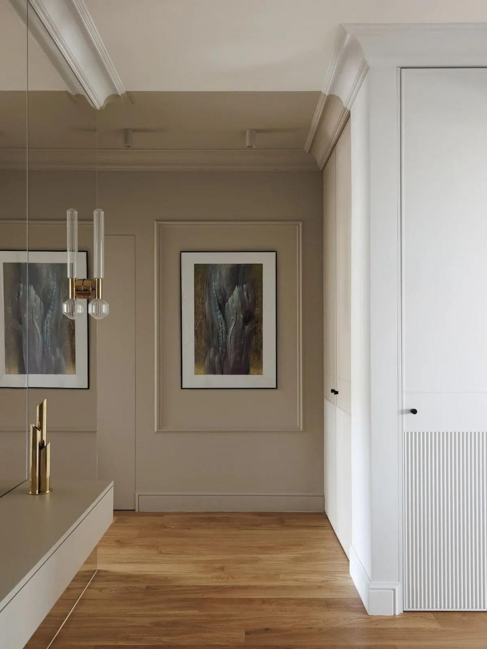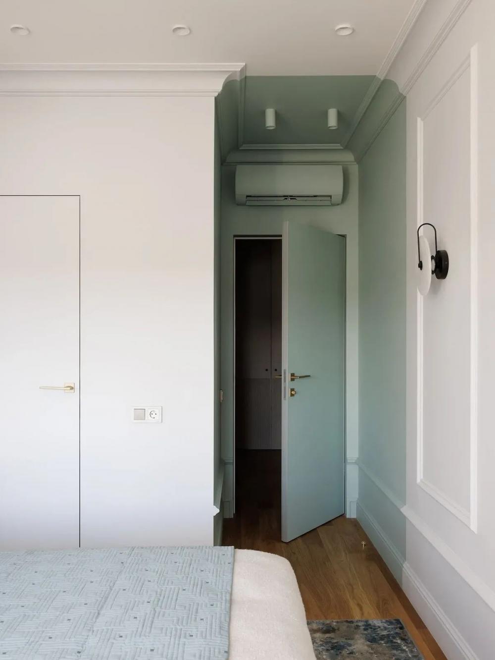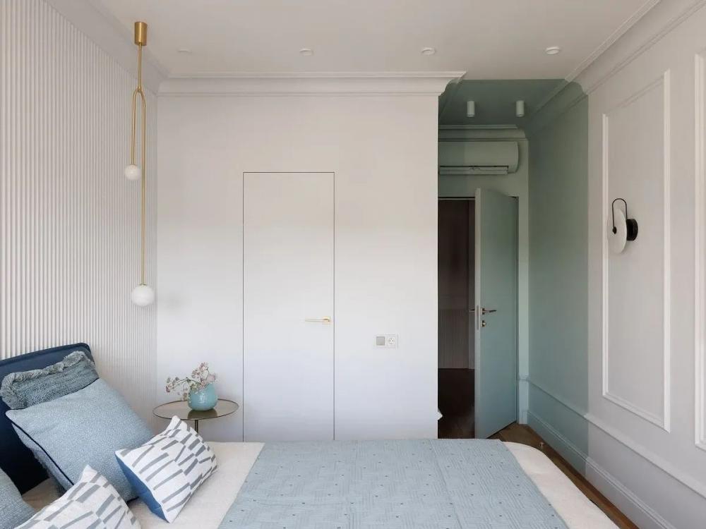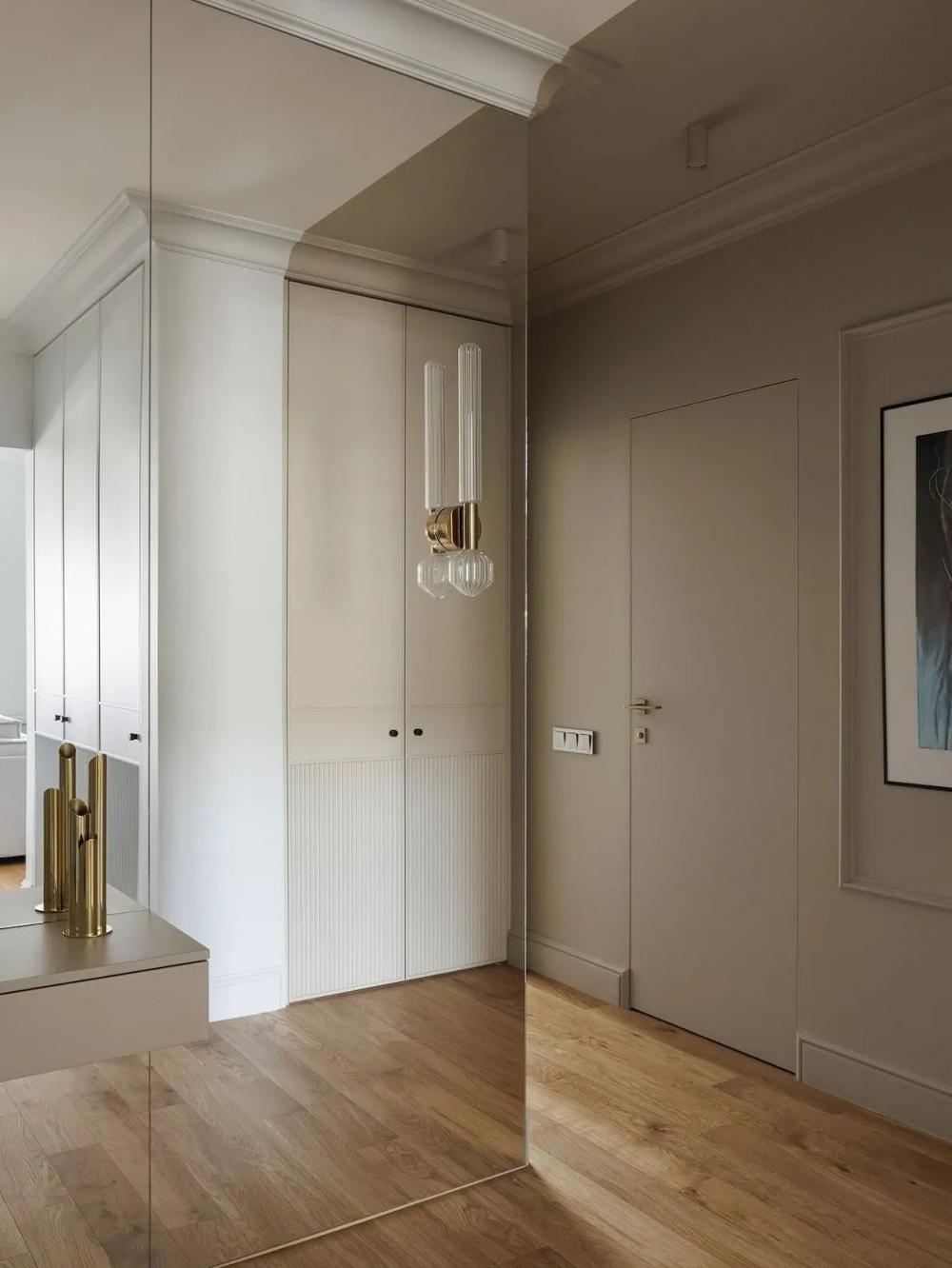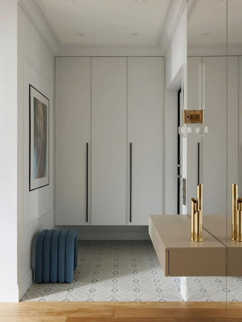 一個(gè)女孩的61㎡小宅,女生需要一個(gè)現(xiàn)代化的空間。但一個(gè)重要的訴求是,當(dāng)品味和喜好發(fā)生變化時(shí),能夠有更換室內(nèi)裝飾元素的可能性。因此,在這個(gè)設(shè)計(jì)方案中,有許多明亮的表面,采用了中性色調(diào),這種色調(diào)有助于進(jìn)行各種嘗試,并且能在未來添加一些亮點(diǎn)。 廚房的轉(zhuǎn)角組合櫥柜帶有立柱式的柜子,廚房的吊柜沒有覆蓋整面墻,這樣在視覺上減輕了櫥柜的厚重感。在客廳區(qū)域有一個(gè)放電視的矮柜和開放式的擱板,用來存放書籍和裝飾品。在角落處有一個(gè)工作區(qū),還配有一個(gè)儲物柜。 臥室里有一個(gè)獨(dú)立的衣帽間。在窗邊,用一個(gè)懸掛式的小桌替代了床邊的床頭柜,它還能當(dāng)作梳妝臺使用。 墻面的主色調(diào)是淺灰色,在玄關(guān)處使用了乳白色,天花板也刷成了這個(gè)顏色。臥室的入口區(qū)域用了淡藍(lán)色來突出,這讓空間顯得不那么單調(diào)。設(shè)計(jì)師采用了與墻面同色的裝飾線條,這些線條在視覺上增加了天花板的高度。 在通往浴室的門旁邊的壁龕處有一個(gè)用來存放床上用品的衣柜。柜門的顏色與墻面和天花板的乳白色相同。在通往餐廚客廳一體空間的走廊旁邊還嵌入了另一個(gè)衣柜,是用來放鞋子的。