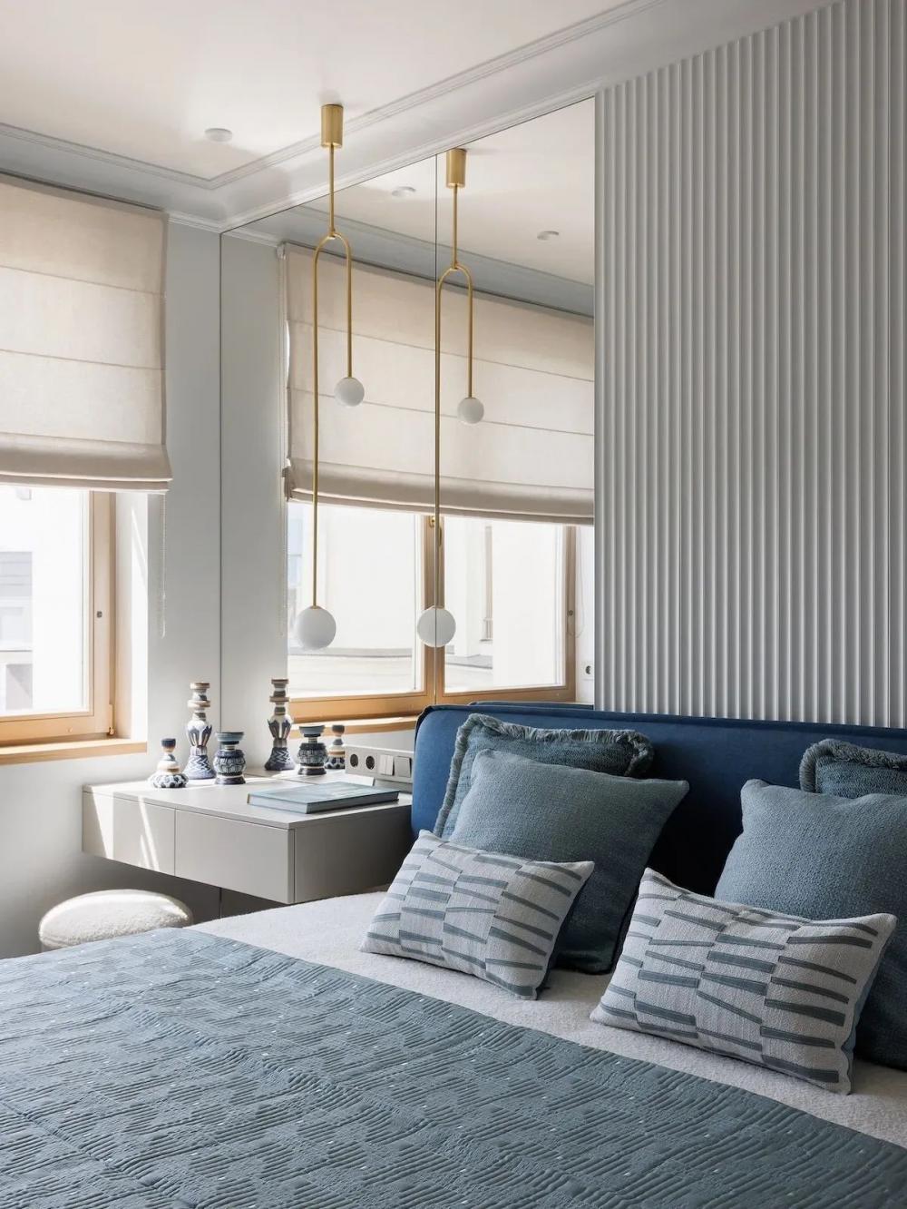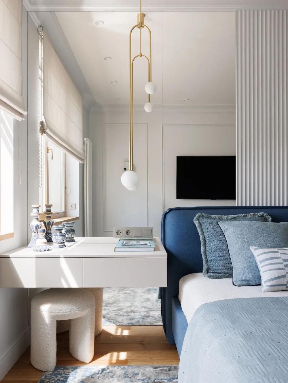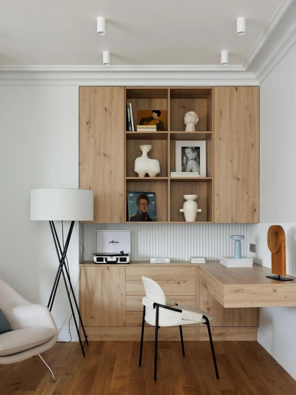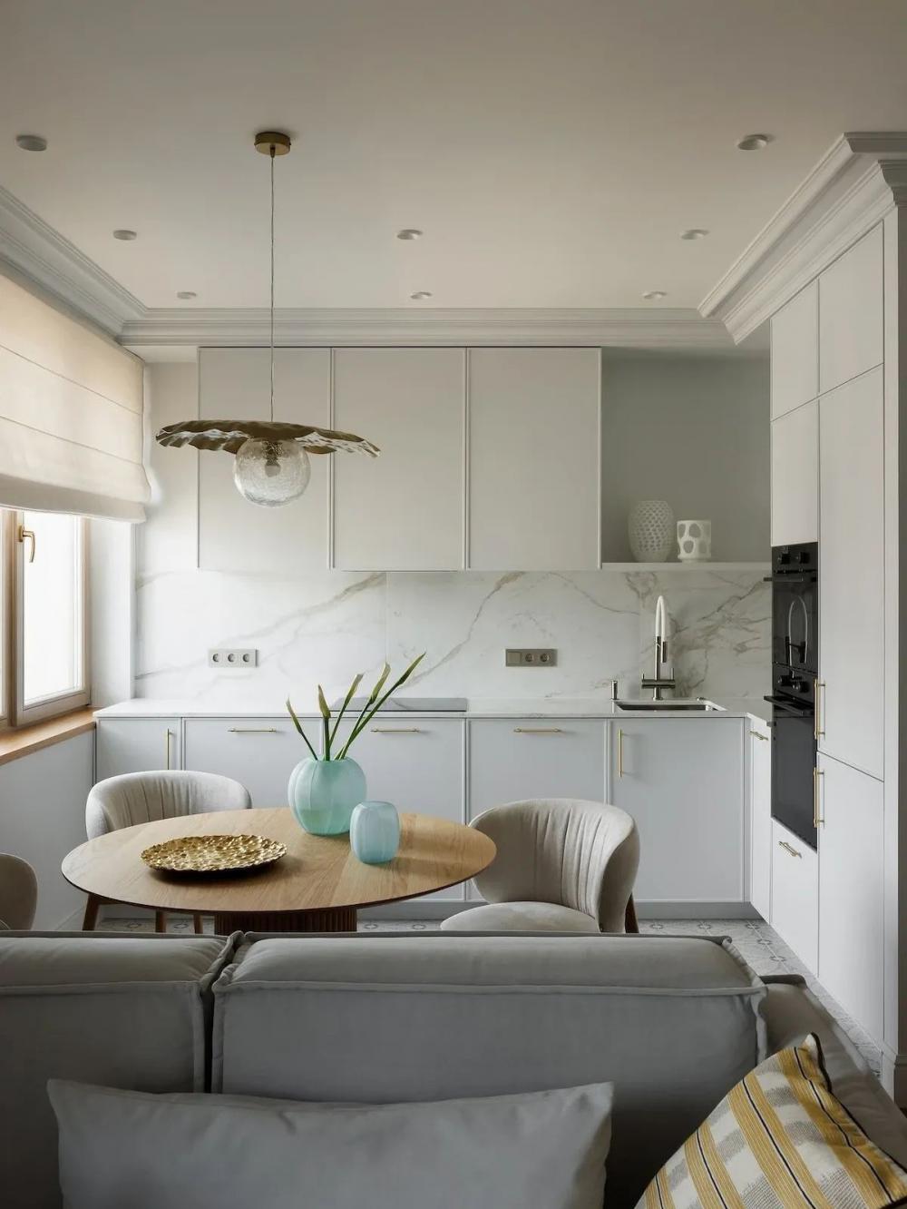 一個(gè)女孩的61㎡小宅,女生需要一個(gè)現(xiàn)代化的空間。但一個(gè)重要的訴求是,當(dāng)品味和喜好發(fā)生變化時(shí),能夠有更換室內(nèi)裝飾元素的可能性。因此,在這個(gè)設(shè)計(jì)方案中,有許多明亮的表面,采用了中性色調(diào),這種色調(diào)有助于進(jìn)行各種嘗試,并且能在未來添加一些亮點(diǎn)。 廚房的轉(zhuǎn)角組合櫥柜帶有立柱式的柜子,廚房的吊柜沒有覆蓋整面墻,這樣在視覺上減輕了櫥柜的厚重感。在客廳區(qū)域有一個(gè)放電視的矮柜和開放式的擱板,用來存放書籍和裝飾品。在角落處有一個(gè)工作區(qū),還配有一個(gè)儲物柜。 臥室里有一個(gè)獨(dú)立的衣帽間。在窗邊,用一個(gè)懸掛式的小桌替代了床邊的床頭柜,它還能當(dāng)作梳妝臺使用。 墻面的主色調(diào)是淺灰色,在玄關(guān)處使用了乳白色,天花板也刷成了這個(gè)顏色。臥室的入口區(qū)域用了淡藍(lán)色來突出,這讓空間顯得不那么單調(diào)。設(shè)計(jì)師采用了與墻面同色的裝飾線條,這些線條在視覺上增加了天花板的高度。 在通往浴室的門旁邊的壁龕處有一個(gè)用來存放床上用品的衣柜。柜門的顏色與墻面和天花板的乳白色相同。在通往餐廚客廳一體空間的走廊旁邊還嵌入了另一個(gè)衣柜,是用來放鞋子的。