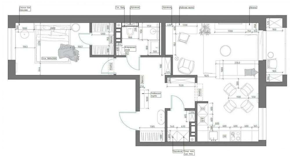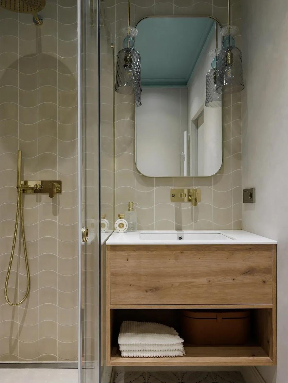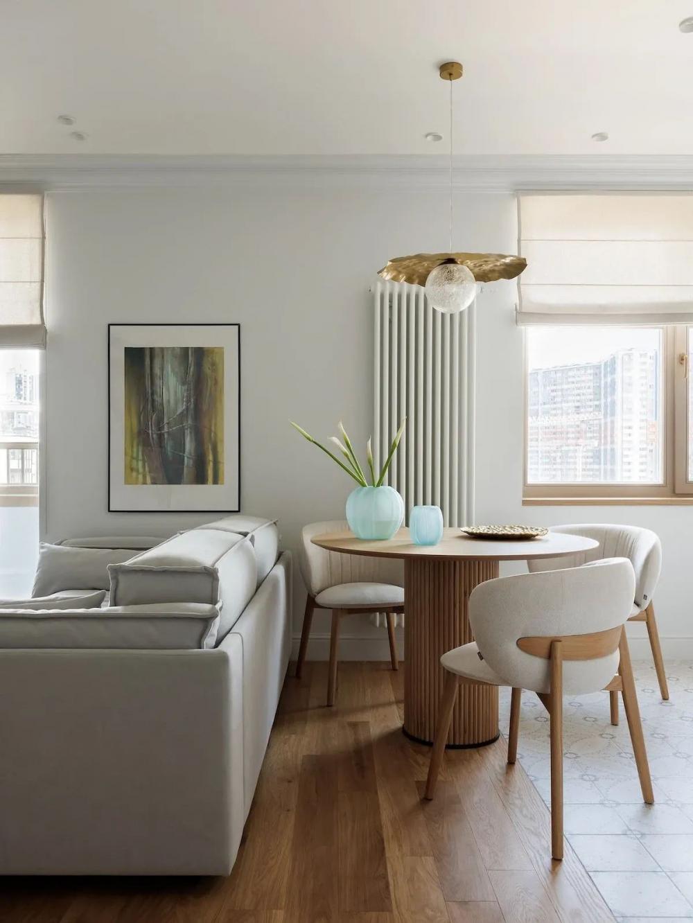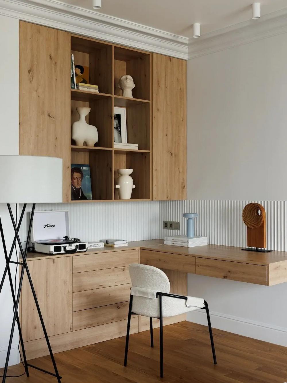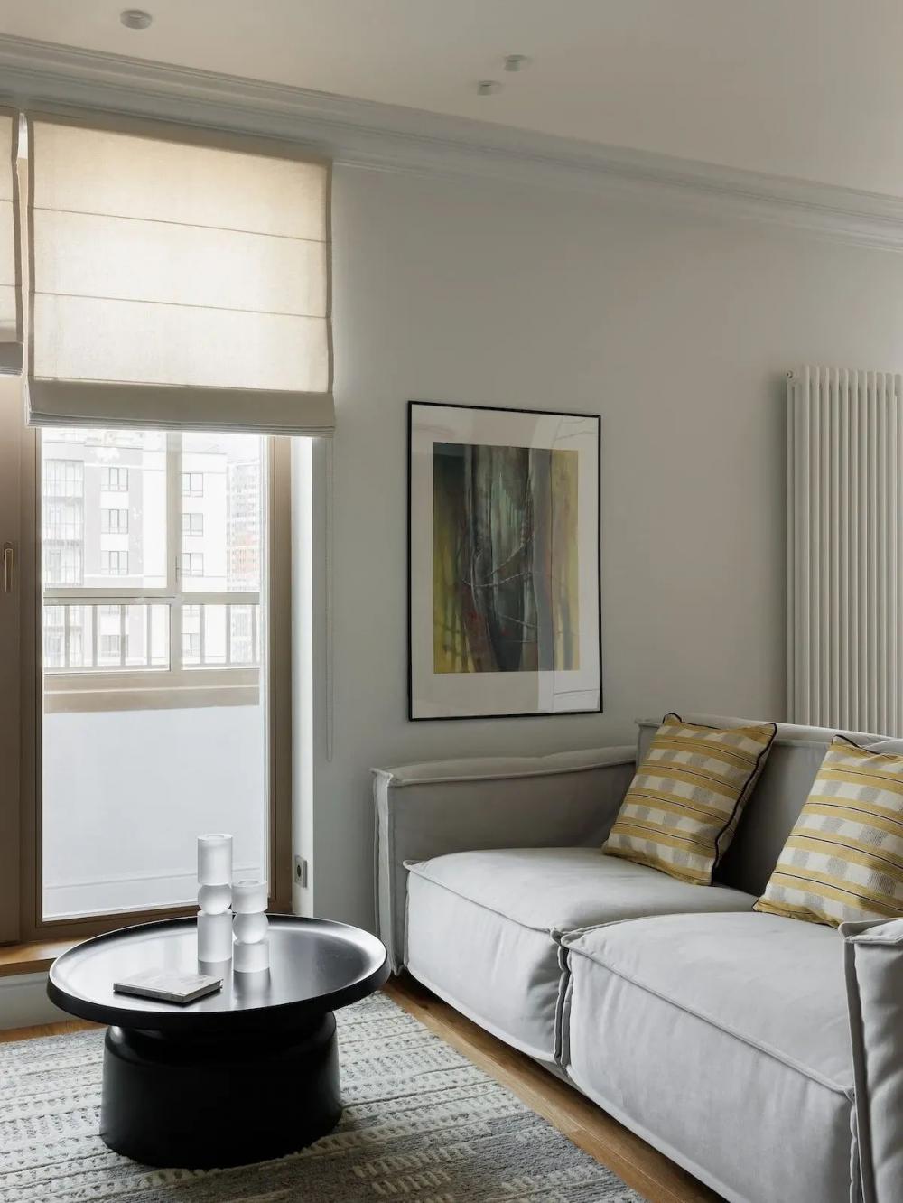 一個(gè)女孩的61㎡小宅,女生需要一個(gè)現(xiàn)代化的空間。但一個(gè)重要的訴求是,當(dāng)品味和喜好發(fā)生變化時(shí),能夠有更換室內(nèi)裝飾元素的可能性。因此,在這個(gè)設(shè)計(jì)方案中,有許多明亮的表面,采用了中性色調(diào),這種色調(diào)有助于進(jìn)行各種嘗試,并且能在未來添加一些亮點(diǎn)。 廚房的轉(zhuǎn)角組合櫥柜帶有立柱式的柜子,廚房的吊柜沒有覆蓋整面墻,這樣在視覺上減輕了櫥柜的厚重感。在客廳區(qū)域有一個(gè)放電視的矮柜和開放式的擱板,用來存放書籍和裝飾品。在角落處有一個(gè)工作區(qū),還配有一個(gè)儲物柜。 臥室里有一個(gè)獨(dú)立的衣帽間。在窗邊,用一個(gè)懸掛式的小桌替代了床邊的床頭柜,它還能當(dāng)作梳妝臺使用。 墻面的主色調(diào)是淺灰色,在玄關(guān)處使用了乳白色,天花板也刷成了這個(gè)顏色。臥室的入口區(qū)域用了淡藍(lán)色來突出,這讓空間顯得不那么單調(diào)。設(shè)計(jì)師采用了與墻面同色的裝飾線條,這些線條在視覺上增加了天花板的高度。 在通往浴室的門旁邊的壁龕處有一個(gè)用來存放床上用品的衣柜。柜門的顏色與墻面和天花板的乳白色相同。在通往餐廚客廳一體空間的走廊旁邊還嵌入了另一個(gè)衣柜,是用來放鞋子的。