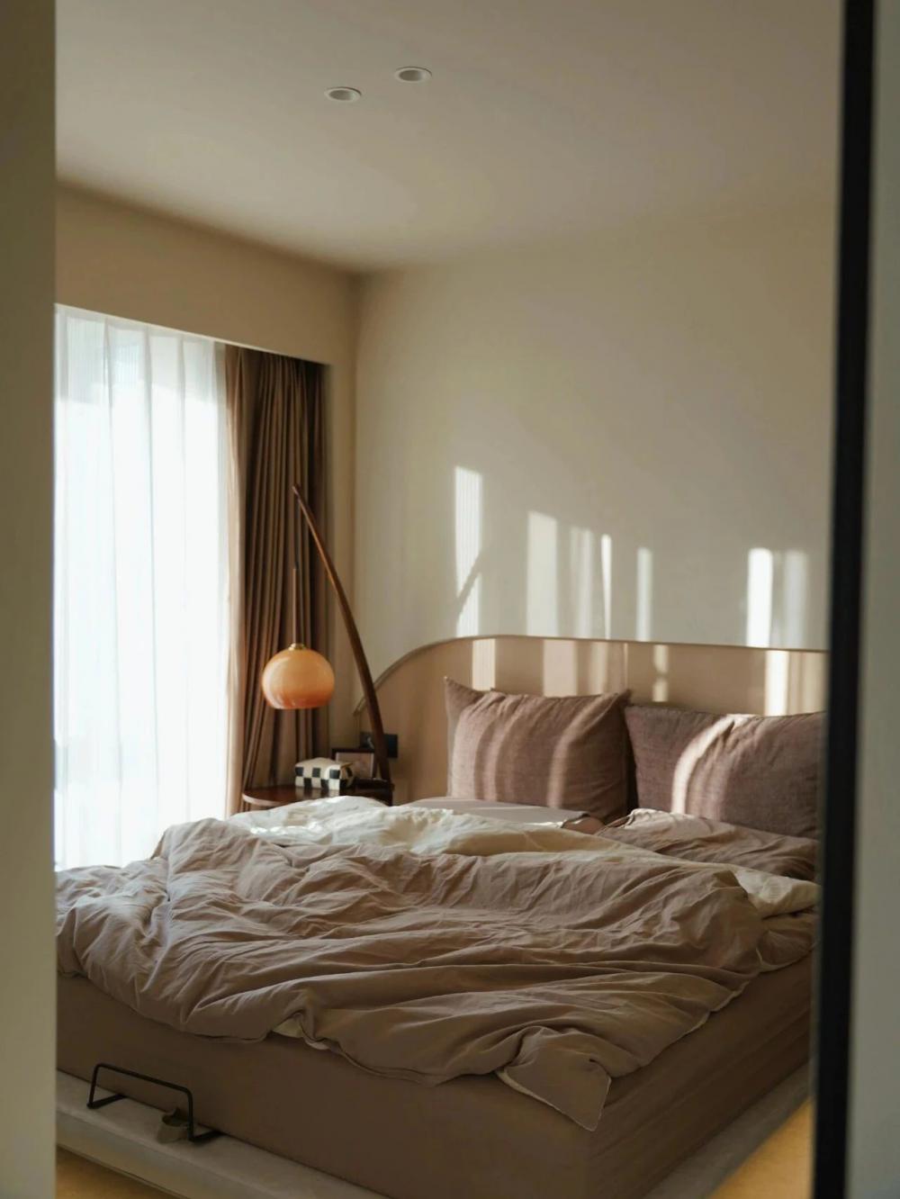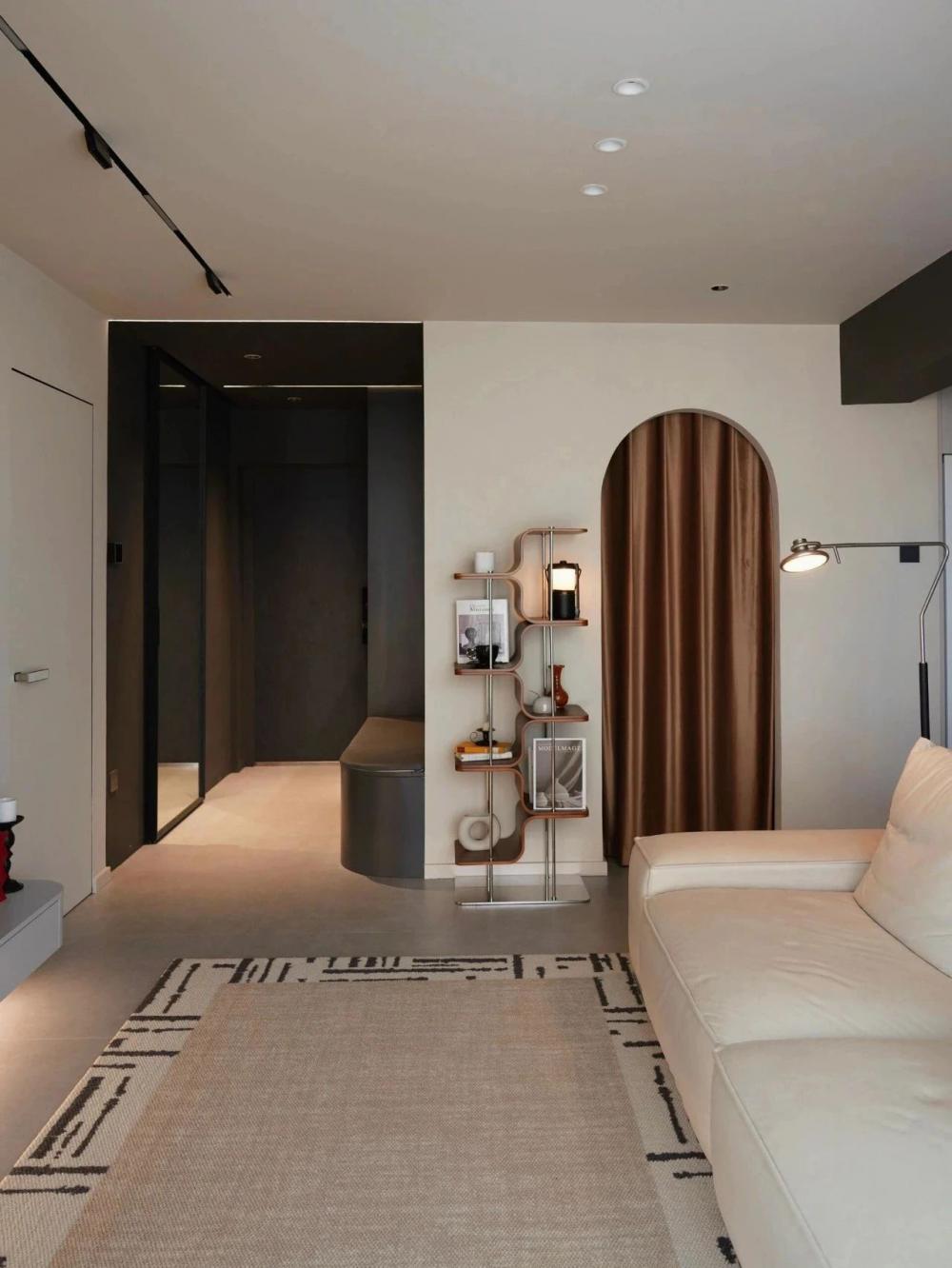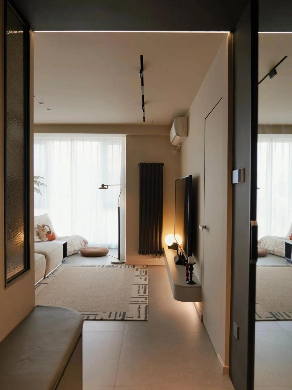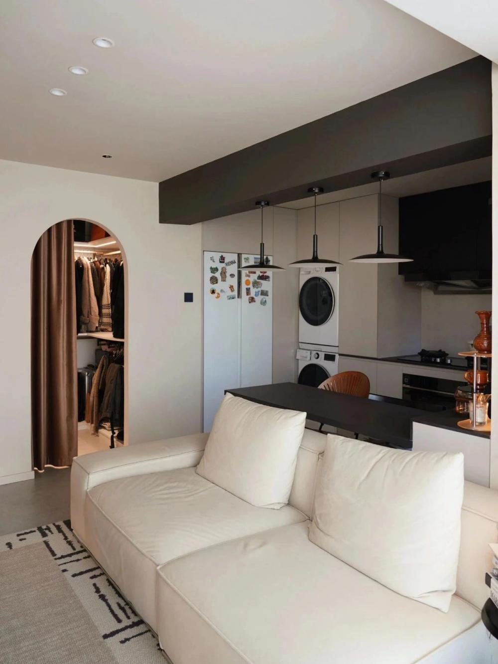 開放式的小廚房,黑色水槽搭配黑色水龍頭,窗邊木質百葉窗,干花裝飾,上方垂掛著三盞黑色吊燈,中間的一張深色的餐桌增添了空間的時尚感。 進門視角可見懸浮式的電視墻,下方擺放著小擺件,旁邊的壁燈散發(fā)著溫馨光線。 黑色的暖氣片為空間增添了一絲工業(yè)風元素。遠處的沙發(fā)搭配幾個亮色靠枕,地面的大地色系地毯、白色紗簾讓自然光柔和地透進來,營造出舒適愜意的居家氛圍。 臥室是心靈的寧靜港灣,弧形床頭搭配同色系的柔軟床品,顯得慵懶愜意。 在這里,日子被愛意填滿,即便空間有限,幸福卻在無限蔓延,每一刻都溫暖而美好 。