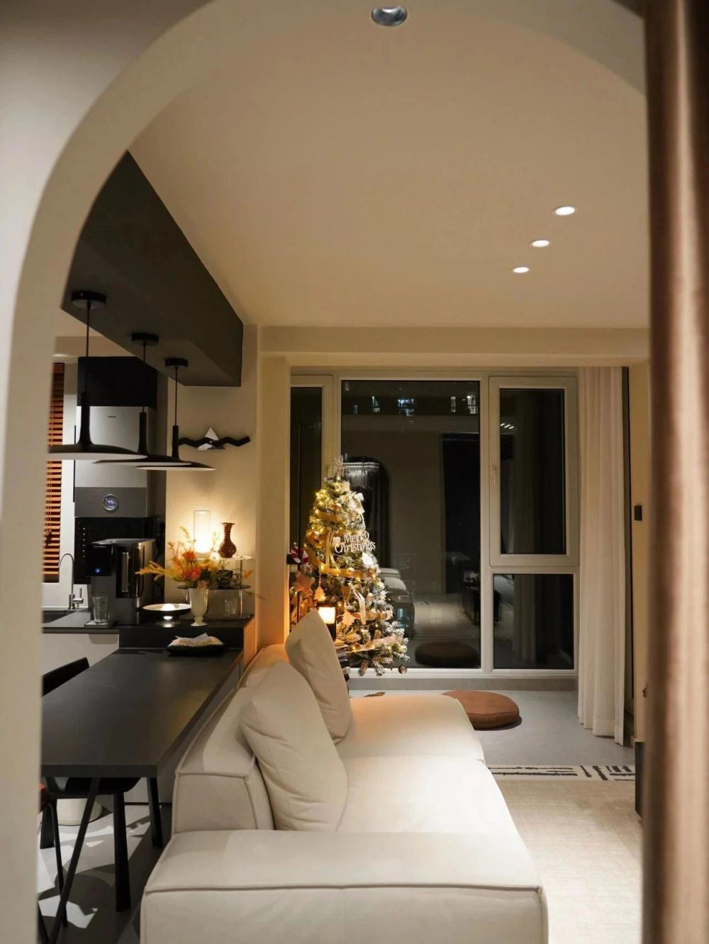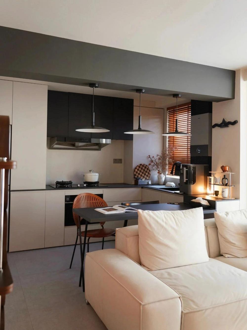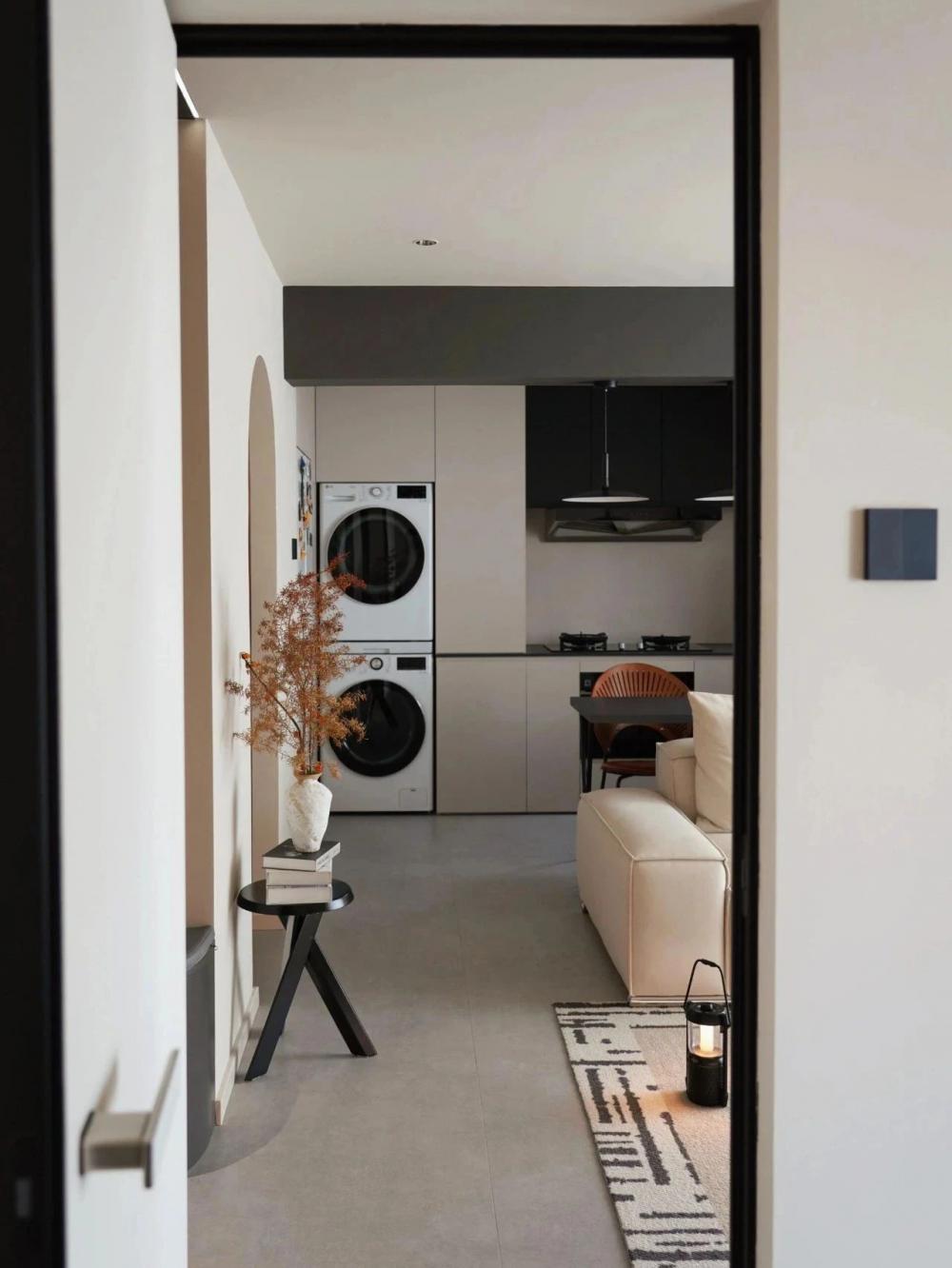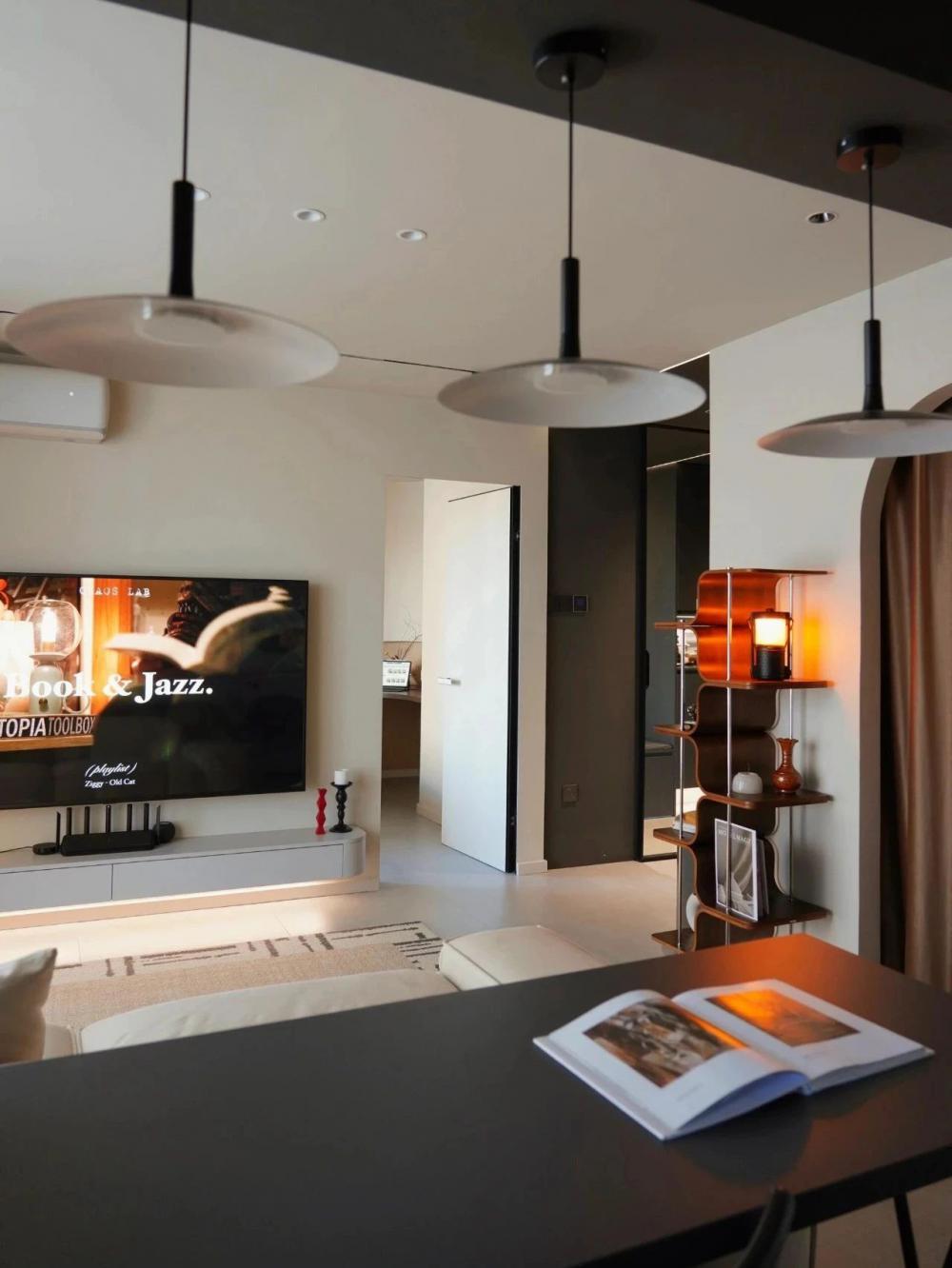 開放式的小廚房,黑色水槽搭配黑色水龍頭,窗邊木質百葉窗,干花裝飾,上方垂掛著三盞黑色吊燈,中間的一張深色的餐桌增添了空間的時尚感。 進門視角可見懸浮式的電視墻,下方擺放著小擺件,旁邊的壁燈散發(fā)著溫馨光線。 黑色的暖氣片為空間增添了一絲工業(yè)風元素。遠處的沙發(fā)搭配幾個亮色靠枕,地面的大地色系地毯、白色紗簾讓自然光柔和地透進來,營造出舒適愜意的居家氛圍。 臥室是心靈的寧靜港灣,弧形床頭搭配同色系的柔軟床品,顯得慵懶愜意。 在這里,日子被愛意填滿,即便空間有限,幸福卻在無限蔓延,每一刻都溫暖而美好 。
