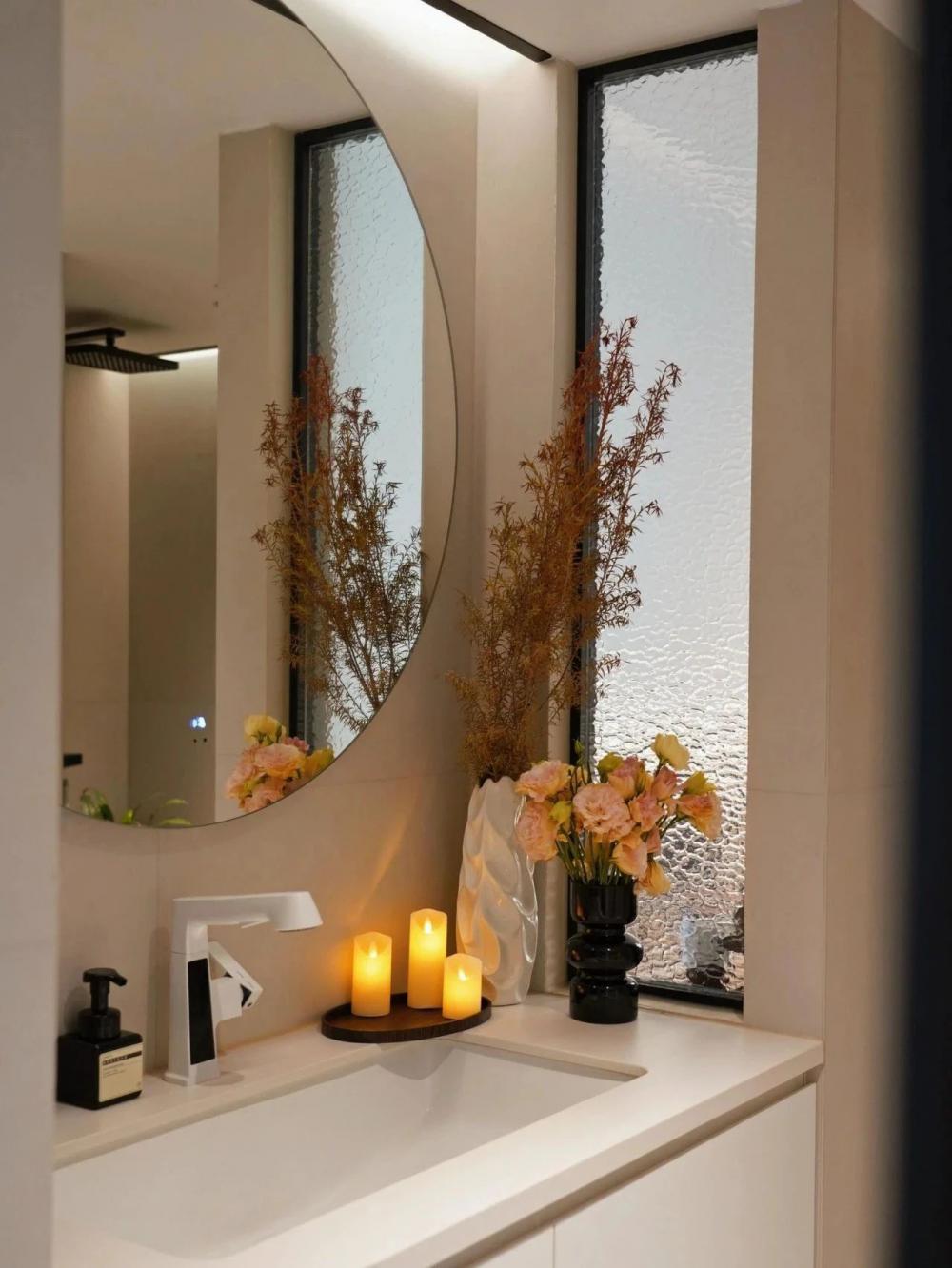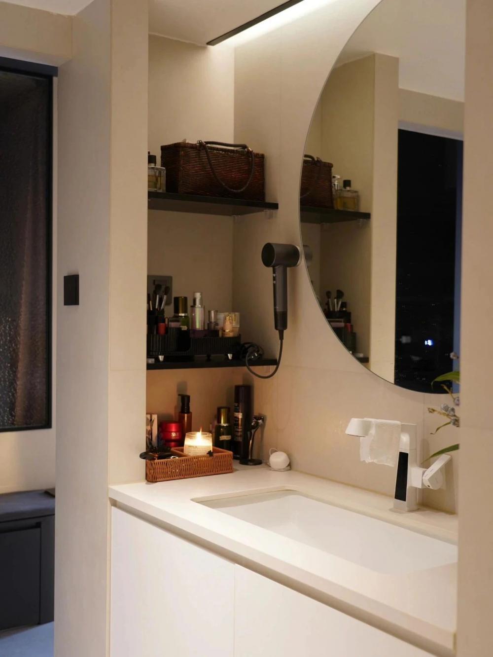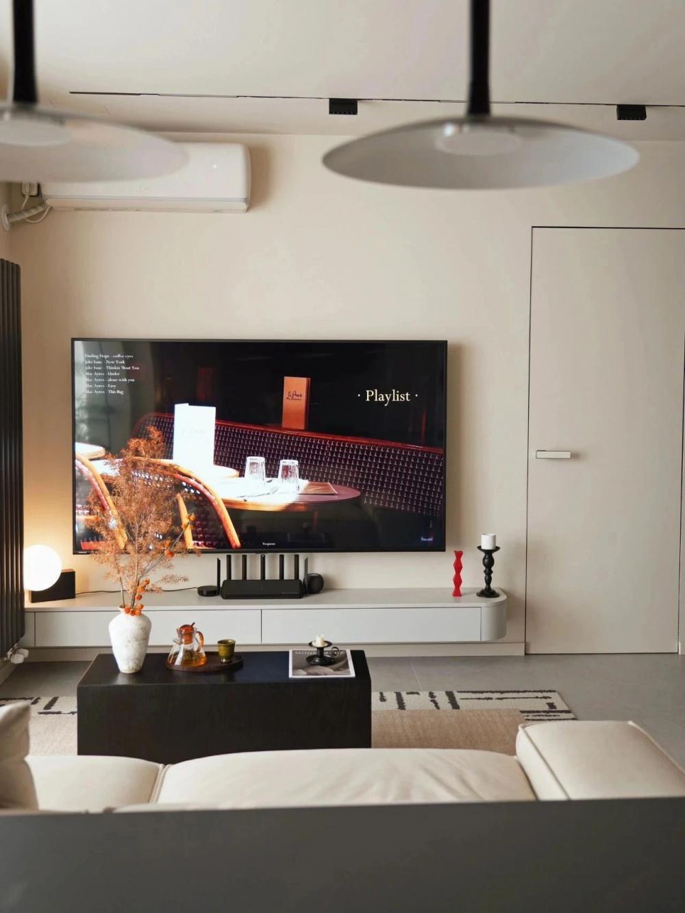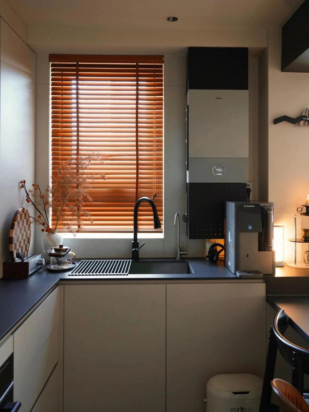 開放式的小廚房,黑色水槽搭配黑色水龍頭,窗邊木質百葉窗,干花裝飾,上方垂掛著三盞黑色吊燈,中間的一張深色的餐桌增添了空間的時尚感。 進門視角可見懸浮式的電視墻,下方擺放著小擺件,旁邊的壁燈散發(fā)著溫馨光線。 黑色的暖氣片為空間增添了一絲工業(yè)風元素。遠處的沙發(fā)搭配幾個亮色靠枕,地面的大地色系地毯、白色紗簾讓自然光柔和地透進來,營造出舒適愜意的居家氛圍。 臥室是心靈的寧靜港灣,弧形床頭搭配同色系的柔軟床品,顯得慵懶愜意。 在這里,日子被愛意填滿,即便空間有限,幸福卻在無限蔓延,每一刻都溫暖而美好 。