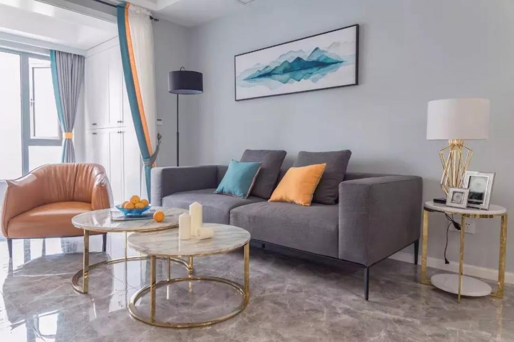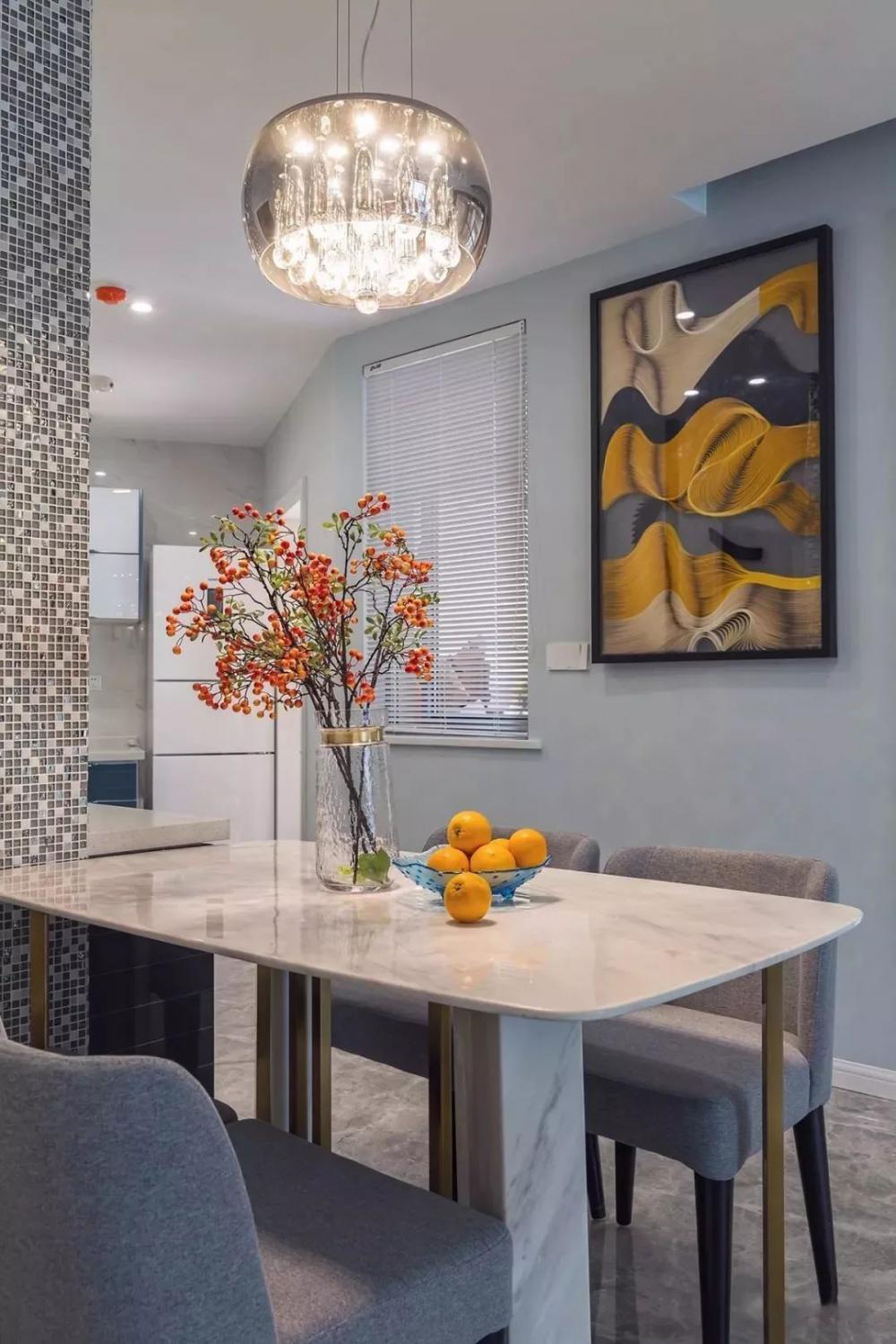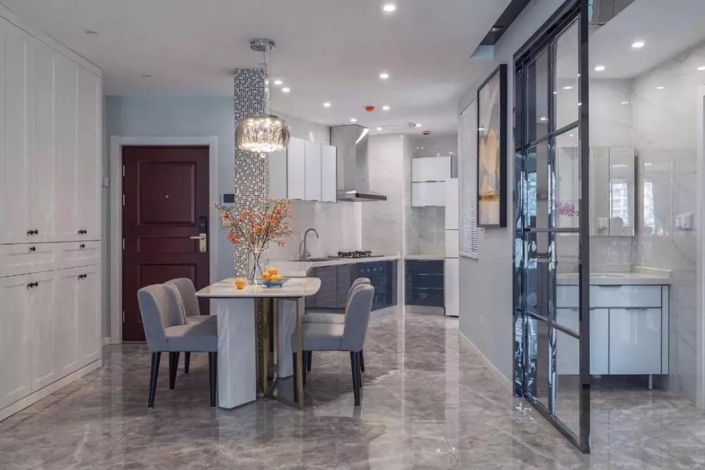 今天分享的是一套建筑面積72平米的現(xiàn)代風小戶型二居室案例, 房子雖然不大,但客餐廳、廚房、衛(wèi)生間和兩個臥室的空間看起來都還是比較寬敞的。 設計師以藍色作為主色調(diào),搭配大理石瓷磚和簡約的軟裝,構(gòu)造出一個舒適而又清新的小窩。 入戶的玄關(guān)和餐廳連在了一起,在入戶門的側(cè)方做上到頂?shù)陌咨褡樱? 搭配藍色調(diào)的背景,整體給人一種小清新的感覺。 客廳和餐廳之間也沒有做隔斷,通往臥室的走廊過道做了玻璃隔斷。 客廳的電視背景墻上用不銹鋼線條作為裝飾,看起來簡潔而又大方。 衛(wèi)生間的洗手臺是被放在了門外, 內(nèi)部的淋浴區(qū)和馬桶也用玻璃隔斷分開, 這樣來布置干濕分離,可以徹底避免水汽侵蝕的問題, 而且衛(wèi)生間內(nèi)部看起來也寬敞不少。