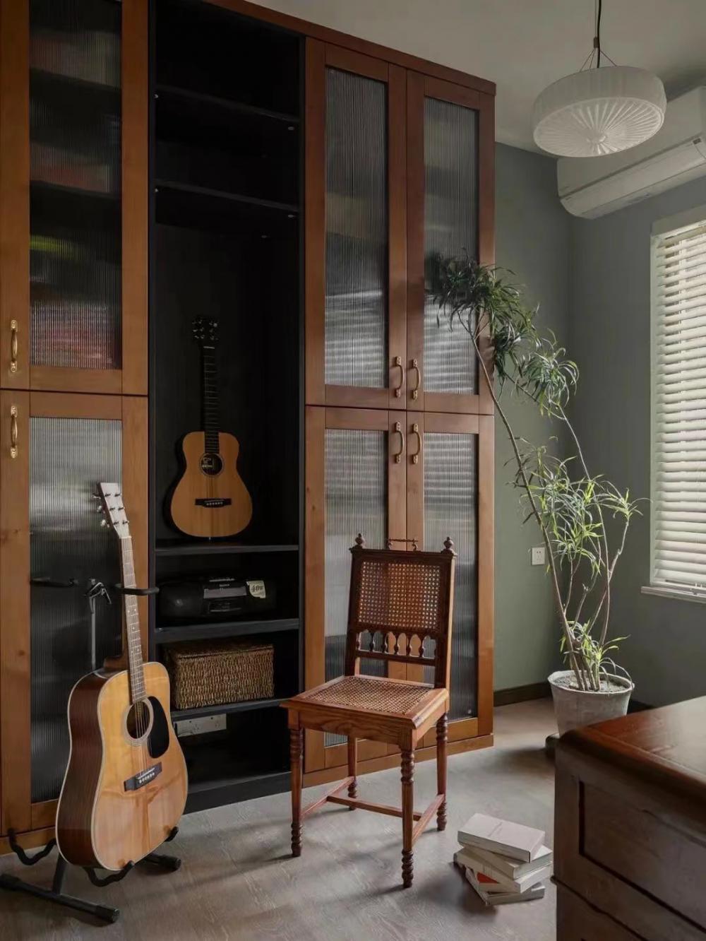 書房:業(yè)主從老家里搬過來一些老物件,非洲柚木,黃銅拉手,細(xì)管長虹玻璃,感覺在此辦公學(xué)習(xí),心靈都可以安靜下來,半封閉半開放,十分通透。