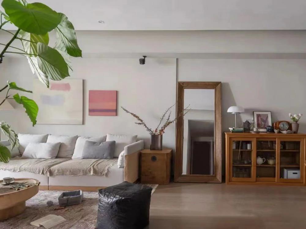 客廳:地面鋪設(shè)木地板,背景墻選擇淺色系,輔以幾幅裝飾畫作為點(diǎn)綴,淺灰色布藝沙發(fā)以及原木圓形茶幾,空間些許綠植作為點(diǎn)綴,整體自然隨和。