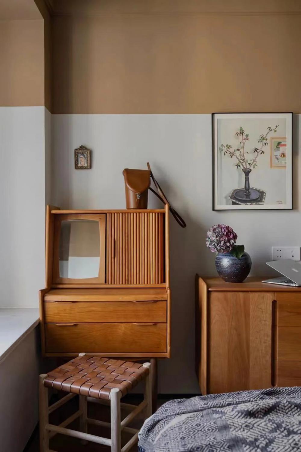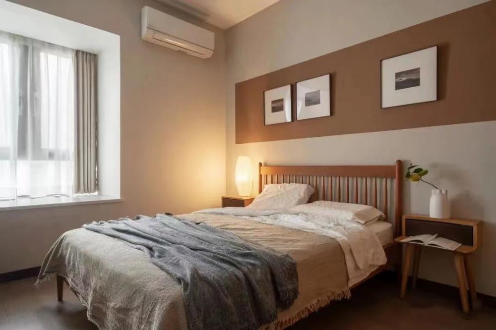 次臥:背景墻選擇分色設(shè)計(jì),保留了飄窗設(shè)計(jì),一盞臺燈足以點(diǎn)亮空間,空間大多選擇自然元素,像床頭,地板,床頭柜都極其貼近自然。