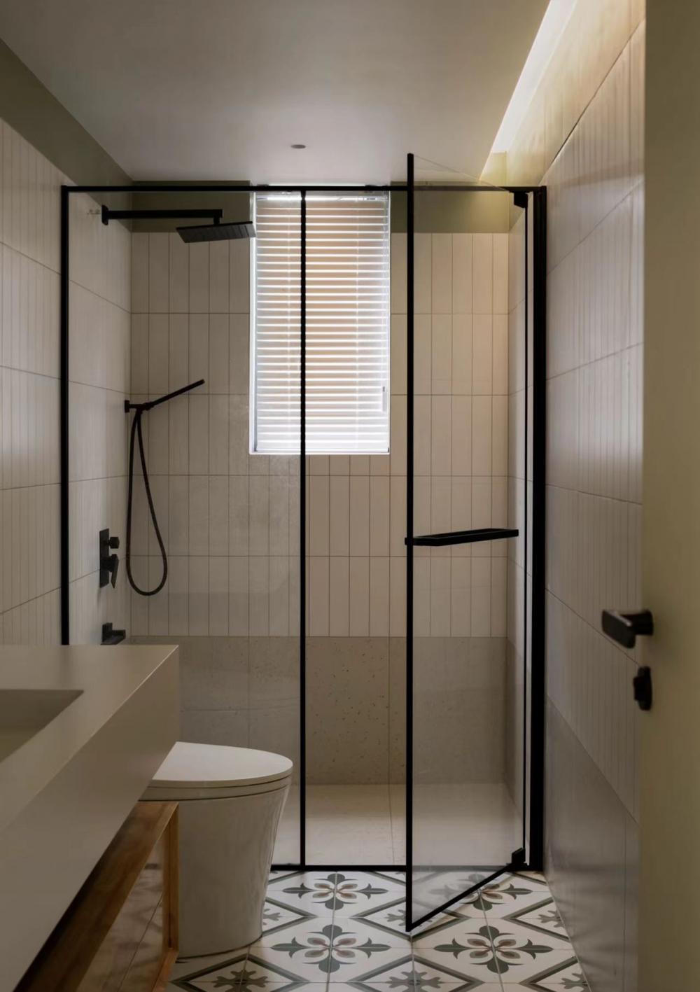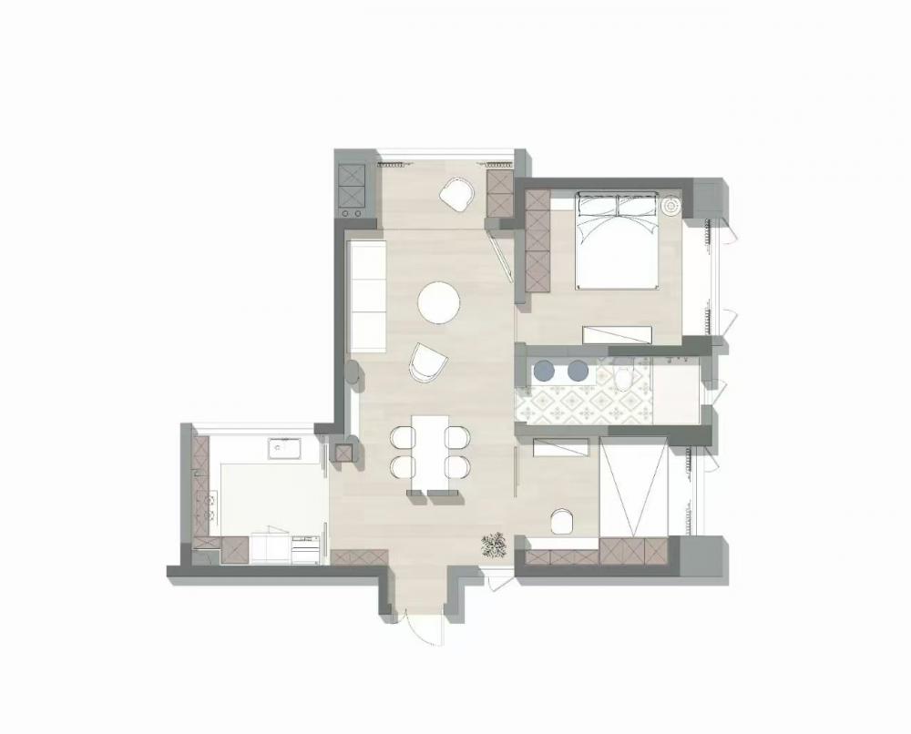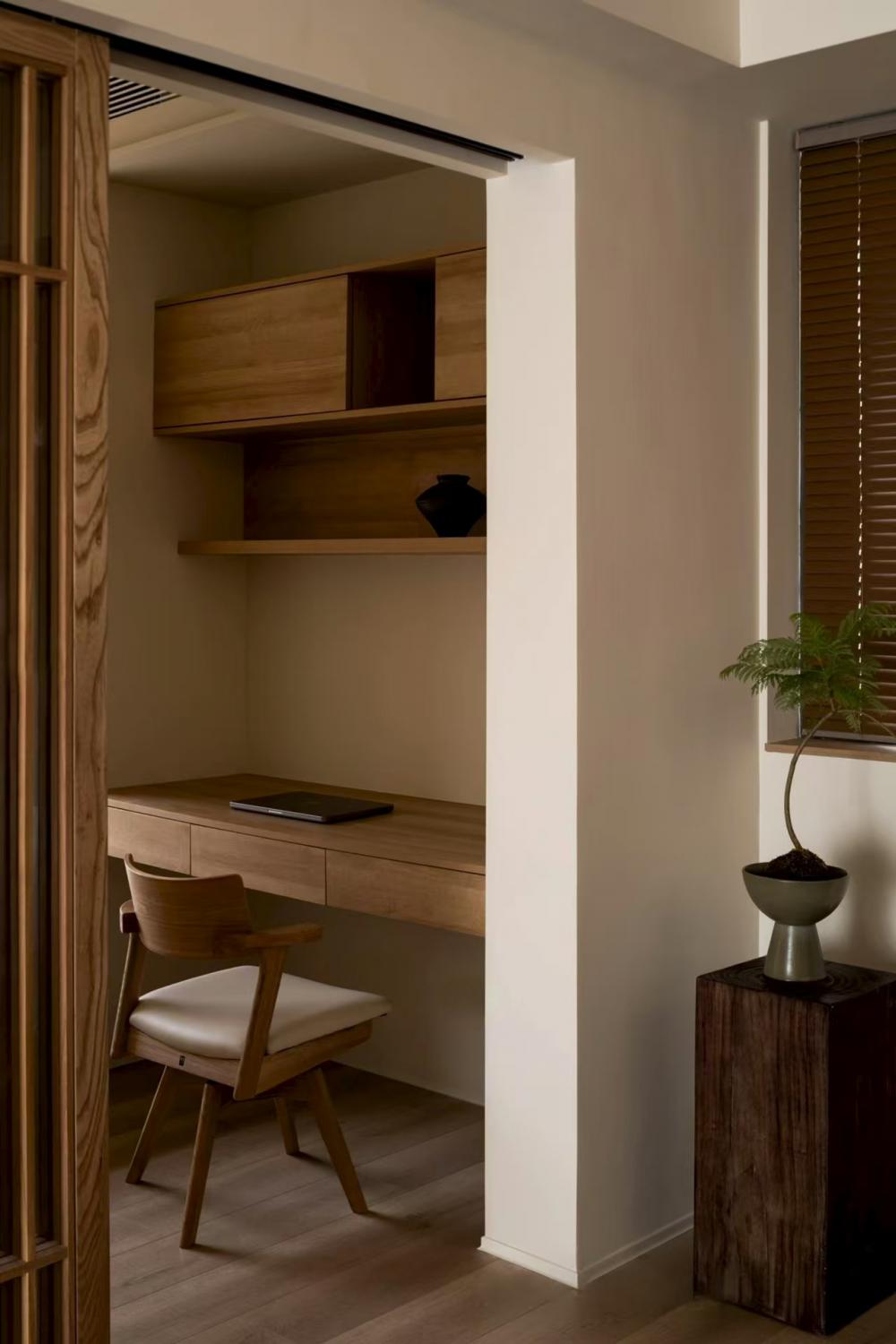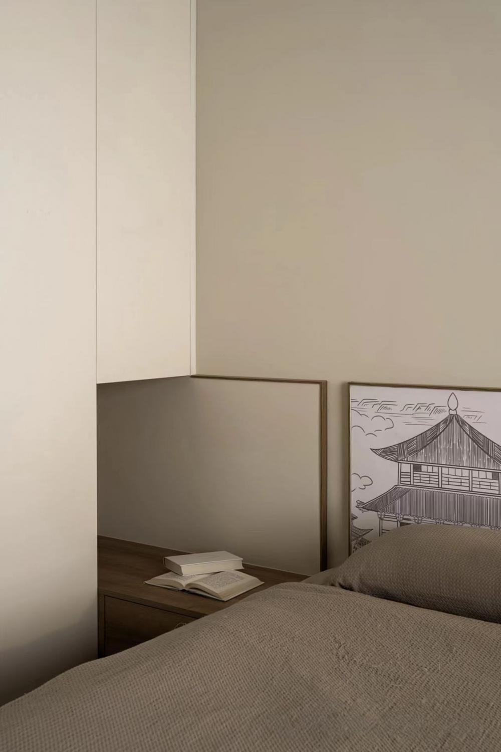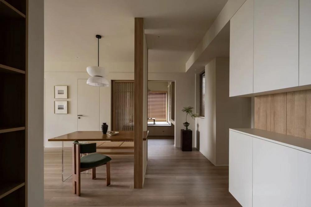 本案是一套面積為83平米的兩居室,屋主想要在日常生活里,更多的體驗到和諧、靜謐以及無限松弛的居家體驗,風格上選擇了更具東方意境的新中式;功能上需增強儲物設備,并擴大廚房與衛(wèi)生間的使用面積。 入戶以回歸自然為主,將傳統(tǒng)的可觀游園林設計手法帶入,餐桌的正中位置為點,新建墻體,將玄關獨立。并運用其鏤空的幾何錯視效果,將內外視覺形成豐富的穿插關系。 并運用其鏤空的幾何錯視效果,將內外視覺形成豐富的穿插關系。 多元餐廳功能,既是三餐位置,也是公共區(qū)域中氛圍愜意的辦公書桌。 選擇合乎使用者生活方式的單椅、邊椅混合組合,別是另番自在味道。 陽臺擴大室內面積的同時,落地窗將豐富的采光引入,為客廳空間創(chuàng)造出多元的生活使用場景。沒有固定電視墻,選擇可靈活移動的支架替代。 一間臥室,改變動線后,設計為集辦公、儲物、閱讀、茶室、臨時客房一體的多功能空間。以自然木頭為主要表現(xiàn)材質,呈現(xiàn)出質樸、溫和的場景氛圍。 木柵推拉門可開可合,內外功能隨之互聯(lián),開闊透亮之余,最大化放大空間視覺。將生活陽臺納入廚房擴大使用面積,功能齊全,儲物空間充足,而且采光也得到了改善。 臥室延續(xù)外部素雅色調,局部融入飽含東方美學意境的墻頭插畫,給予足夠優(yōu)雅、舒適的睡眠氛圍。臥室延續(xù)外部素雅色調,局部融入飽含東方美學意境的墻頭插畫,給予足夠優(yōu)雅、舒適的睡眠氛圍。