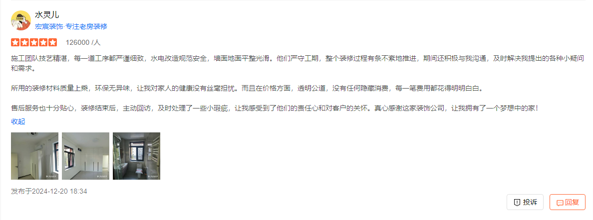 施工團隊技藝精湛,每一道工序都嚴謹細致,水電改造規(guī)范安全,墻面地面平整光滑。他們嚴守工期,整個裝修過程有條不紊地推進,期間還積極與我溝通,及時解決我提出的各種小疑問和需求。 所用的裝修材料質量上乘,環(huán)保無異味,讓我對家人的健康沒有絲毫擔憂。而且在價格方面,透明公道,沒有任何隱藏消費,每一筆費用都花得明明白白。 售后服務也十分貼心,裝修結束后,主動回訪,及時處理了一些小瑕疵,讓我感受到了他們的責任心和對客戶的關懷。真心感謝這家裝飾公司,讓我擁有了一個夢想中的家!