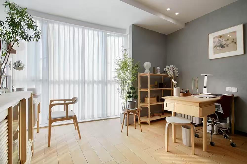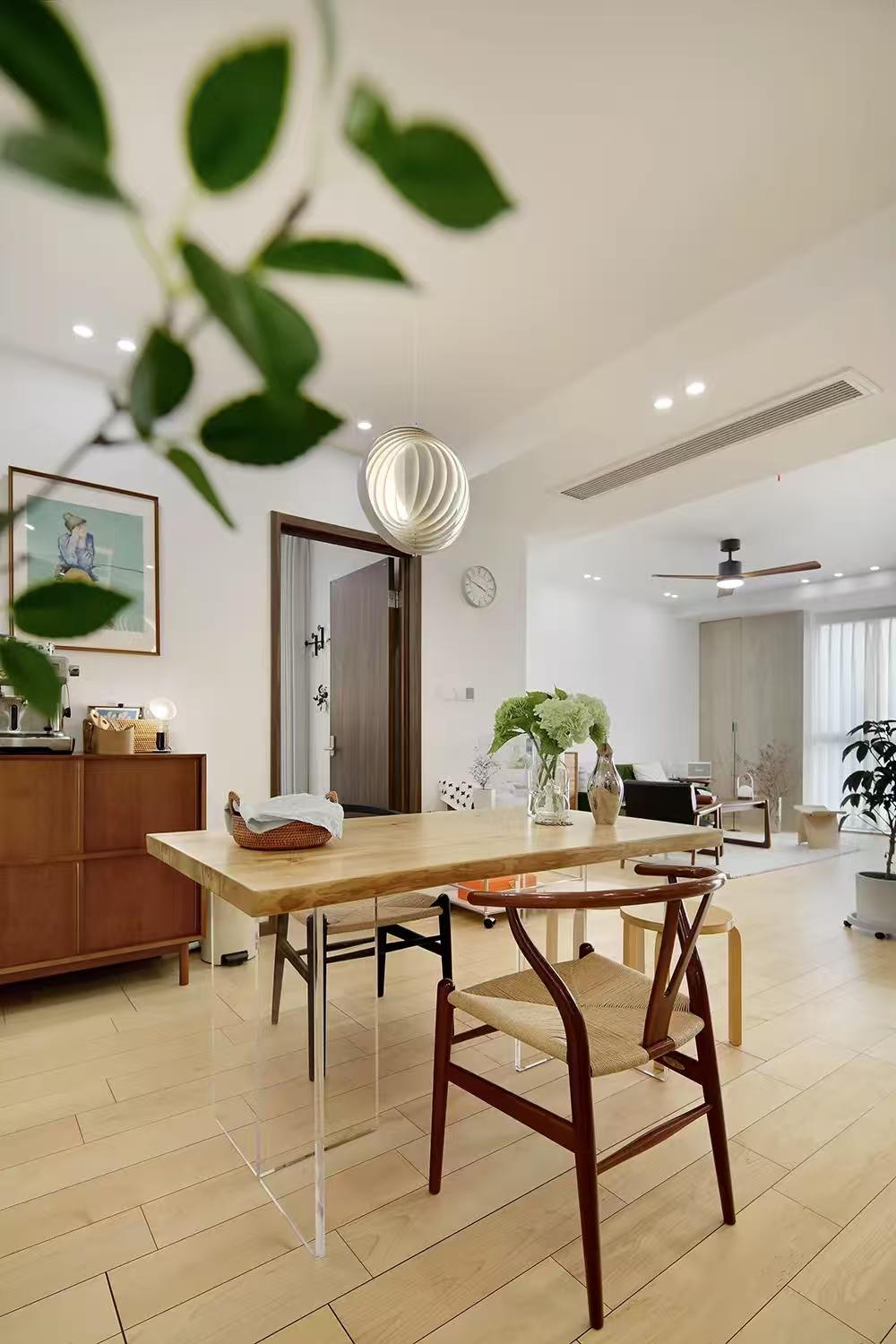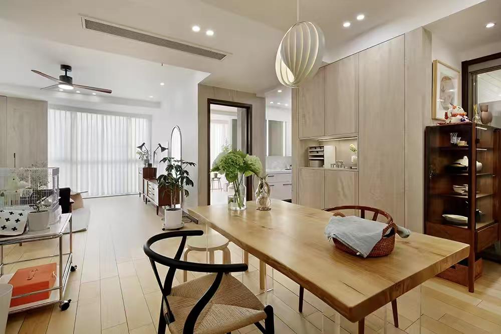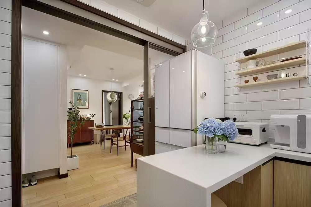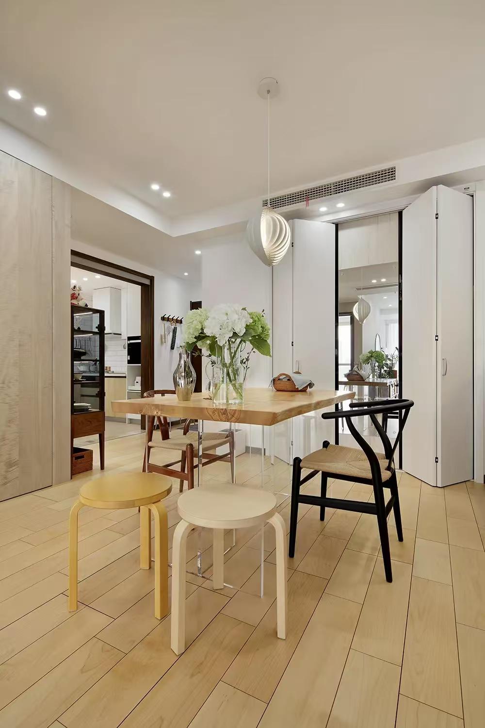 這是一套70㎡的兩居室,業(yè)主比較喜歡日式風(fēng)格,設(shè)計(jì)師通過柔和的色調(diào),簡約的線條打造了一個(gè)溫暖自然、氣質(zhì)沉靜的家,并利用復(fù)古文藝的木質(zhì)家具及各式裝飾物,混搭出一個(gè)閑適寫意、悠然自得,溫潤又克制的清新house。 這是一個(gè)集玄關(guān)、餐廳、客廳為一體的開放式設(shè)計(jì),動(dòng)線流暢,明亮潔凈,改造后,客餐廳聯(lián)動(dòng)增強(qiáng),通透的空間給人很好的視覺感受。 玄關(guān)處進(jìn)門左側(cè)定制的通頂收納柜,方便存放鞋子、雜物等,構(gòu)成強(qiáng)大的收納系統(tǒng)。右側(cè)是掛鉤+換鞋凳的組合,解決了日常掛衣(這里主要掛的是雨傘、刷子等小物品)、換鞋的難題 進(jìn)門后,右側(cè)則是半開放式廚房設(shè)計(jì),空間寬敞,采光通透明亮。 U型動(dòng)線布局優(yōu)化,更好的利用了空間,墻面設(shè)計(jì)有擱板、掛架輔助收納。小家電也有專門的位置擺放,解決了收納凌亂的問題。 半開放式廚房與餐廳緊鄰,打開移動(dòng)門,這就是一個(gè)開放式大空間,通透明亮,溫馨感蔓延。三聯(lián)動(dòng)玻璃移門使得進(jìn)出廚房空間變大,不用側(cè)身,端菜方便。在進(jìn)行爆炒時(shí)拉上門,就可隔絕油煙往外飄散。 客廳陽光充足,綠色沙發(fā)和黑色K-Chair舒適復(fù)古,鮮活的撞色靈感,透著一股慵懶時(shí)尚的風(fēng)情。 從另一個(gè)角度看客廳,視野可以直接延伸至餐廳,空間仿佛變大了。每把椅子的款式都不一樣,充滿設(shè)計(jì)感的家具讓這個(gè)大空間更具靈性。 臥室的設(shè)計(jì)以簡為美,拋去繁雜,是素淡典雅的模樣。簡潔的色彩和明了的動(dòng)線,給人安全舒適的感覺。 書房是原來的主臥,空間較大,但因?yàn)楣δ苄缘母淖儯砸獜氐赘母窬?,兼具工作間+化妝間,所以將原來的主臥改為書房?;疑c原木色的搭配,使整個(gè)空間更加雅致。 衛(wèi)生間使用了三分離的布局設(shè)計(jì),將馬桶、淋浴房、洗漱臺(tái)三個(gè)區(qū)域分離開來,這樣三個(gè)空間的使用互不影響。